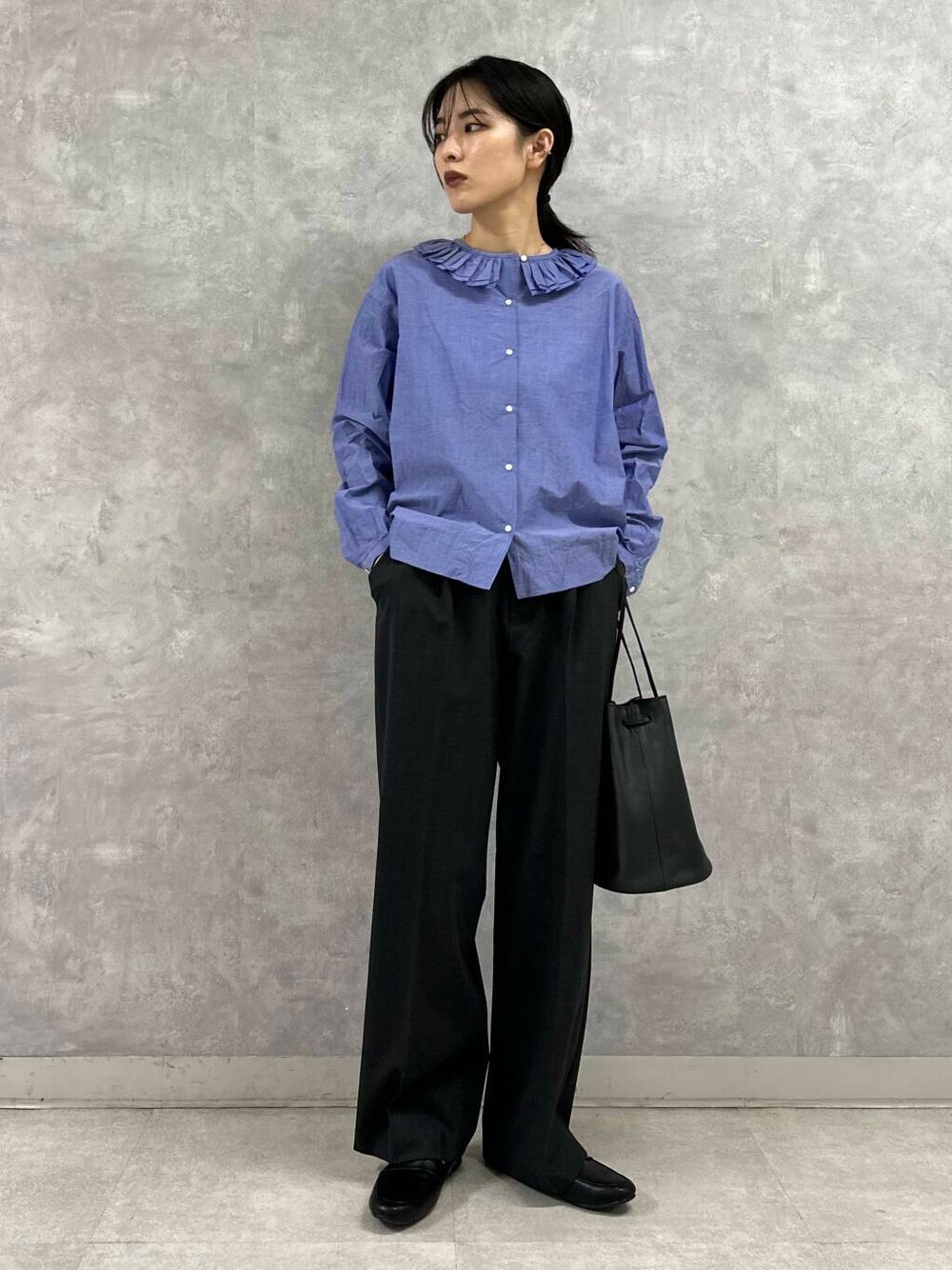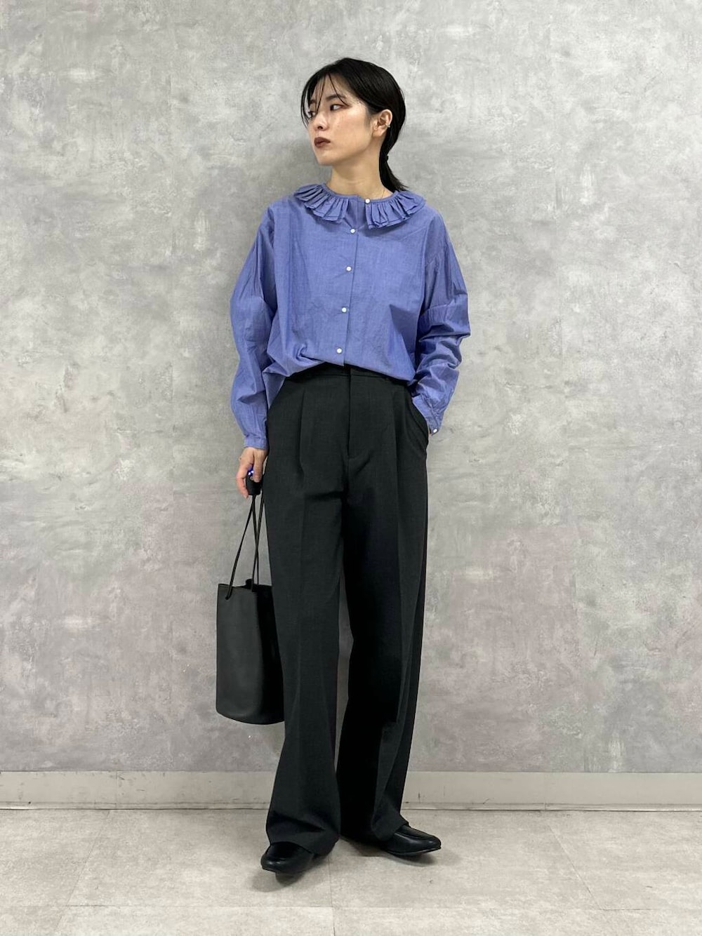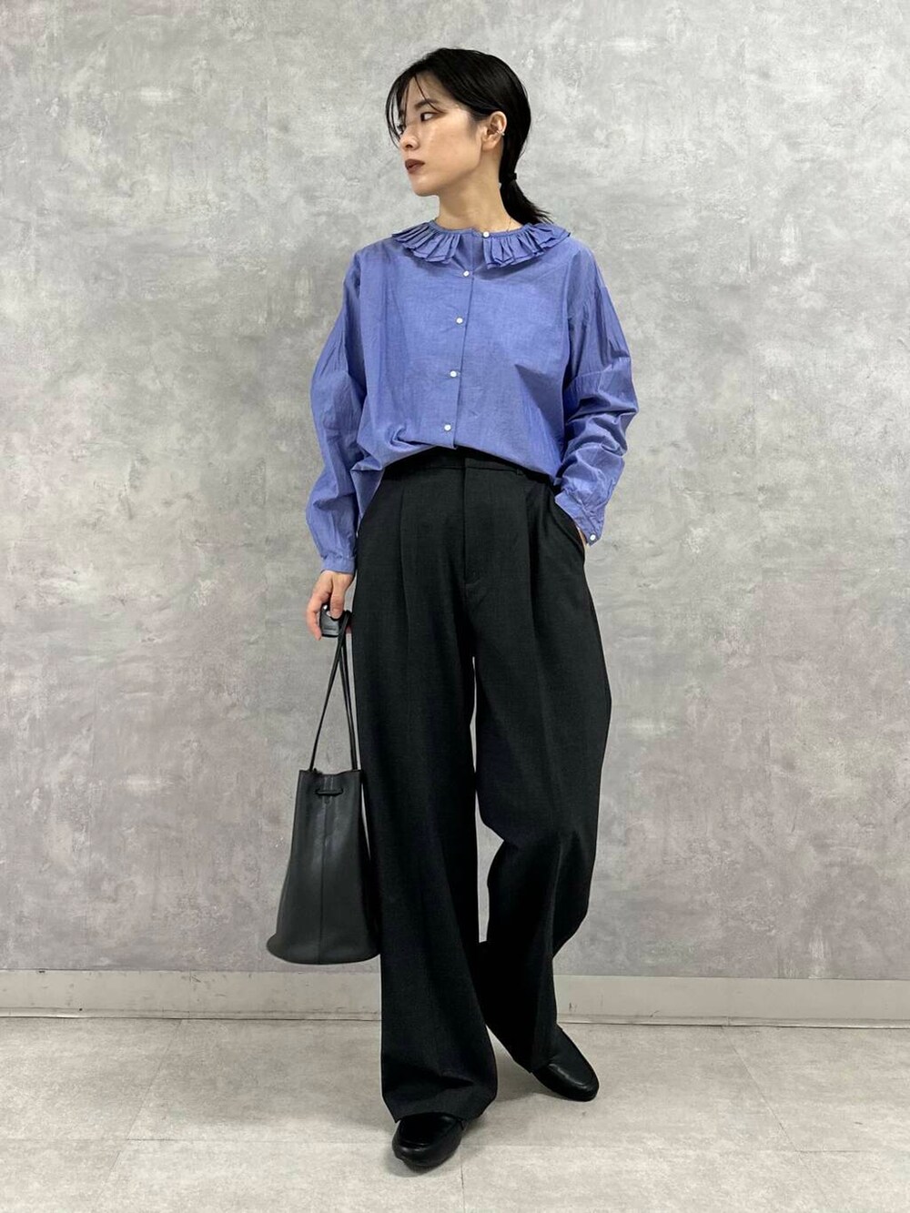 甘めのフリルブラウスはとことんシンプルにスラックススタイルでハンサムに。