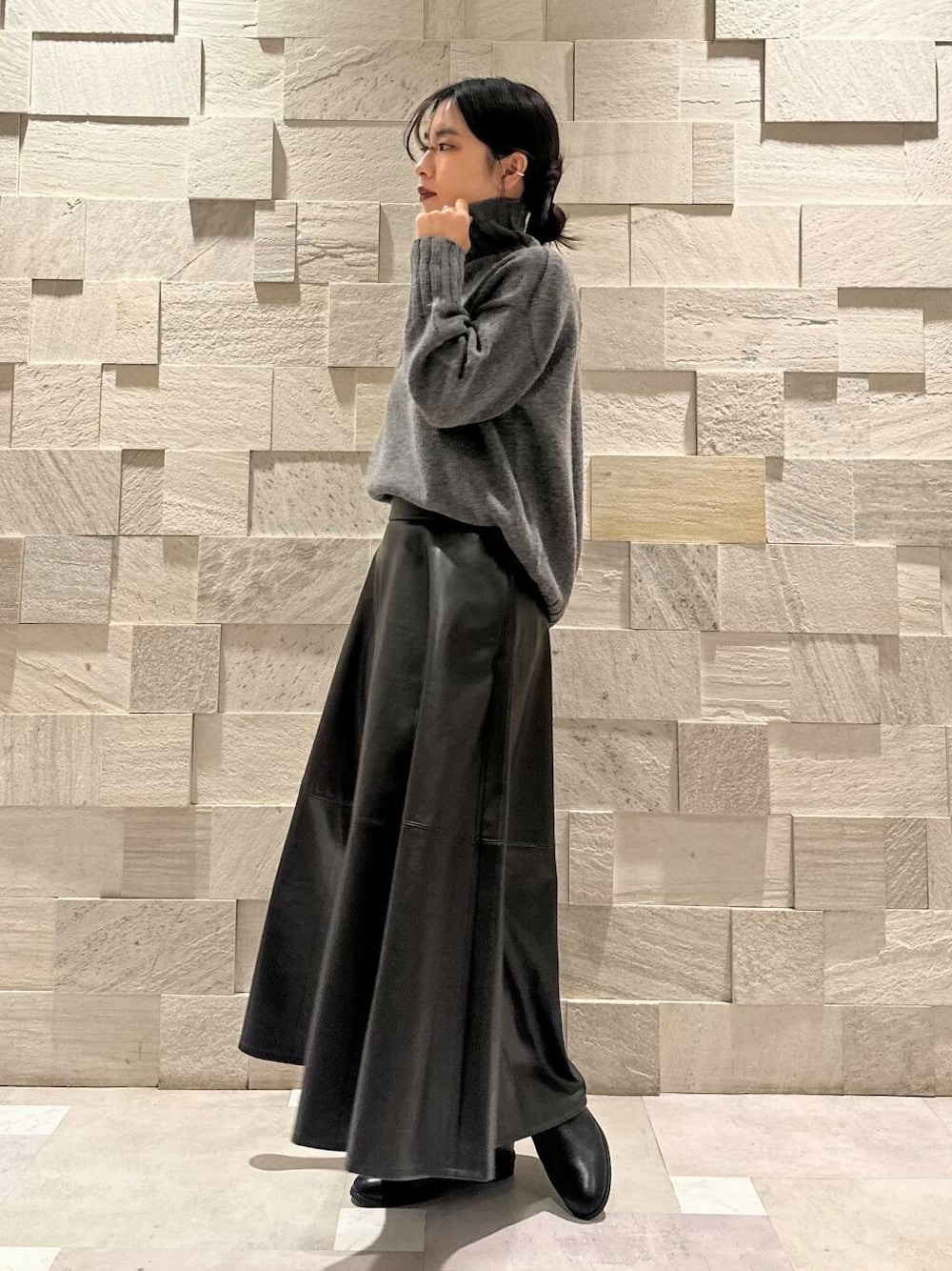 トレンド感のあるレザーライク素材を使用したフレアスカートは、綺麗な広がりのAラインシルエット。ハリのある素材感なのでフレアスカートでも甘くフェミニンな印象になりにくく、程よくビターな仕上がりに。