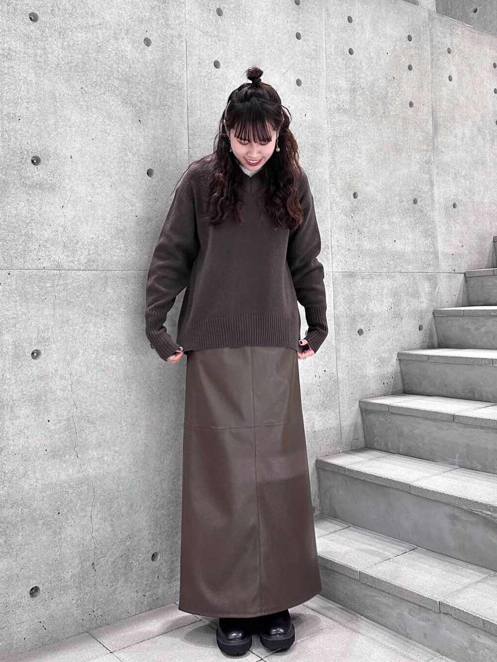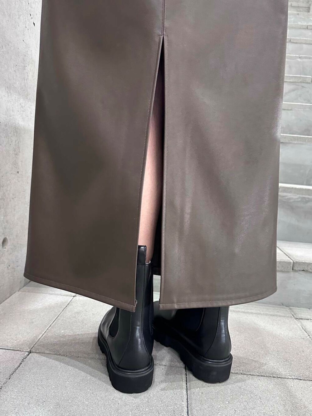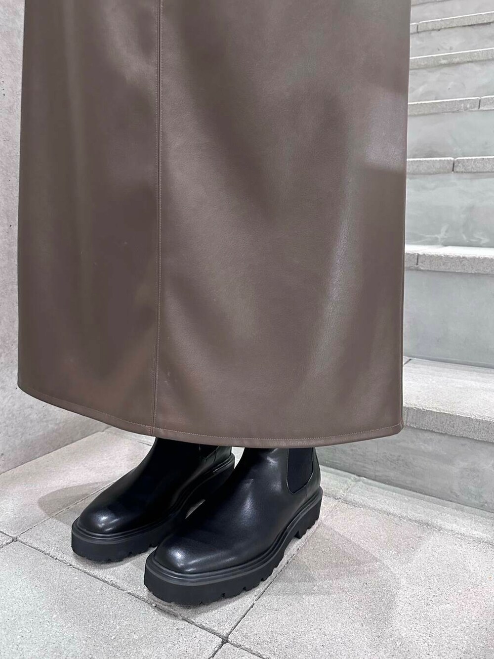 レザースカートは少し長めの丈なので、厚底やヒールのある靴を合わせることで、全体のコーデに立体感とバランスを加えることができます!🤎
