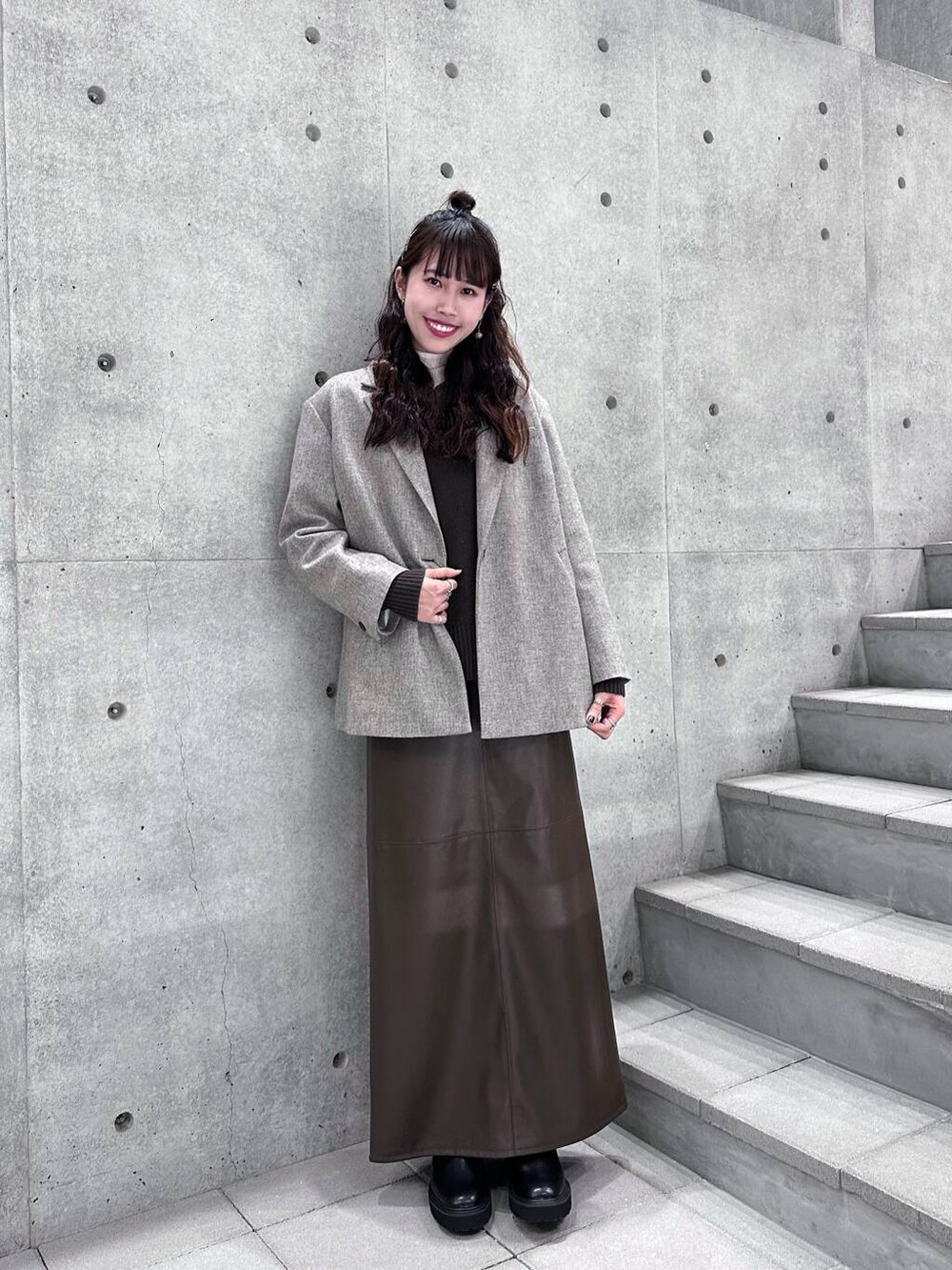 シンプルでスッキリとしたデザインのジャケットに、柔らかい素材感のレザースカートを組み合わせたコーデです。
