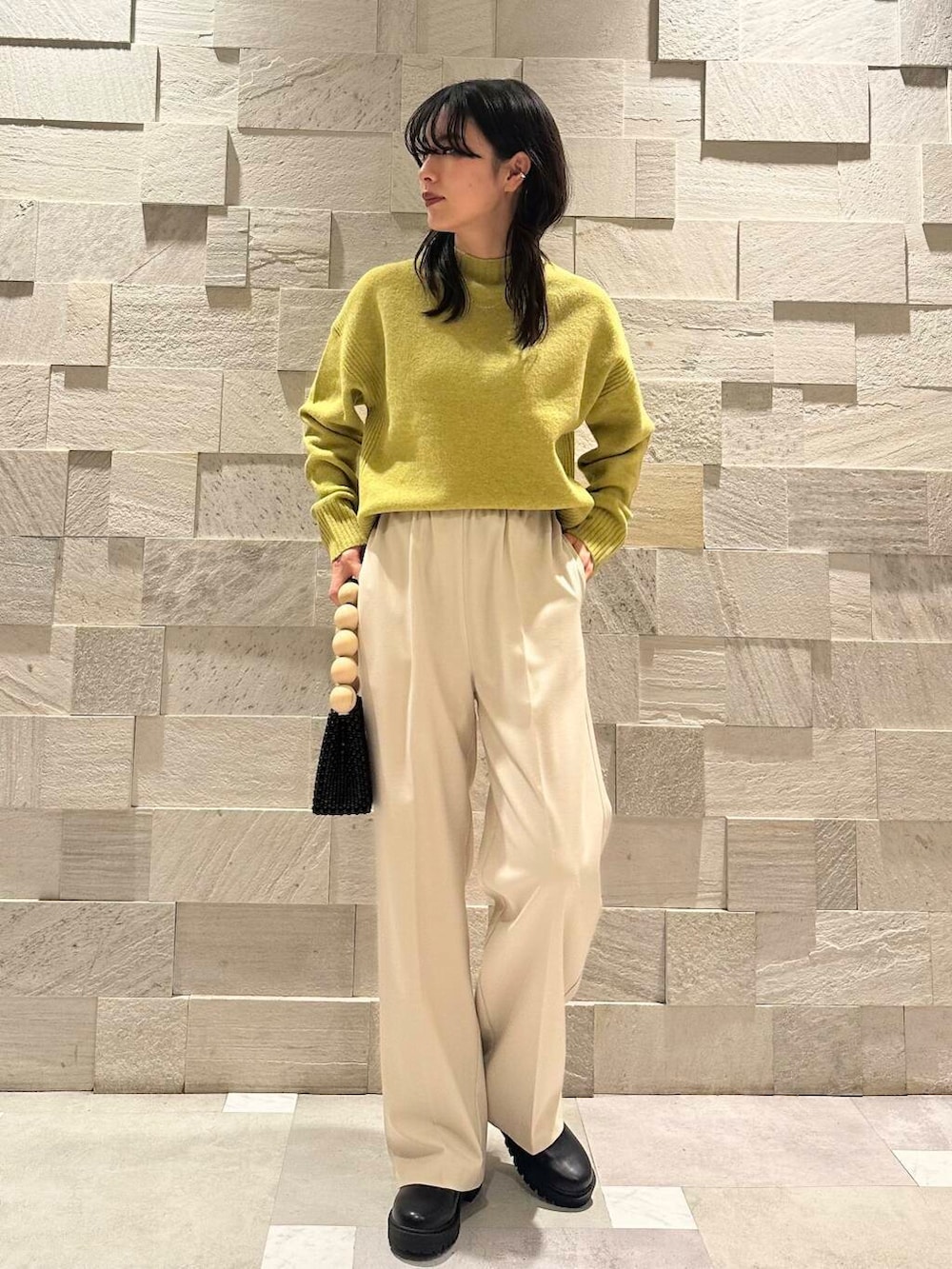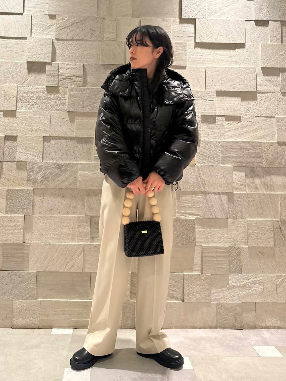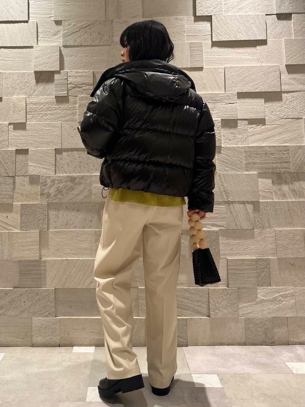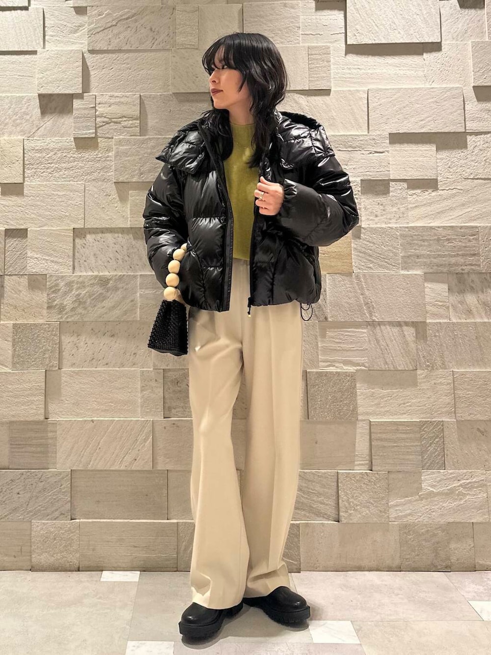 カラーニットに艶の強いダウンはモードさも出やすいため、パンツはエクリュカラーでソフトな印象に。
