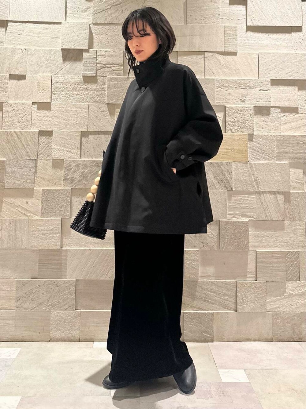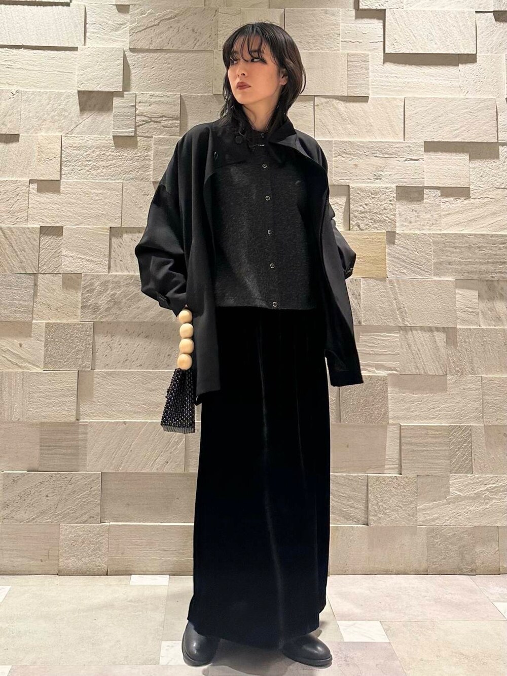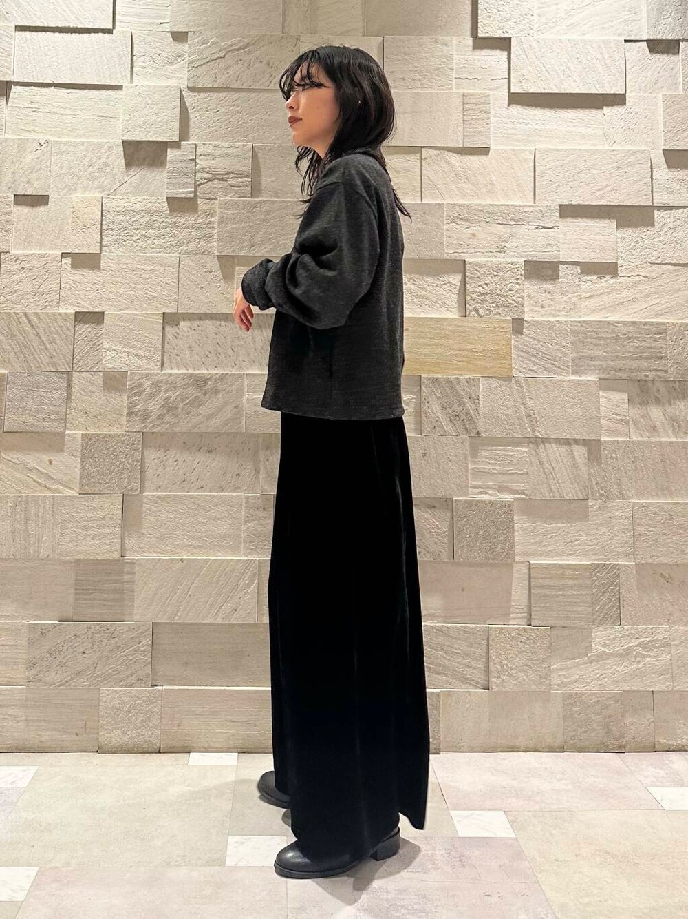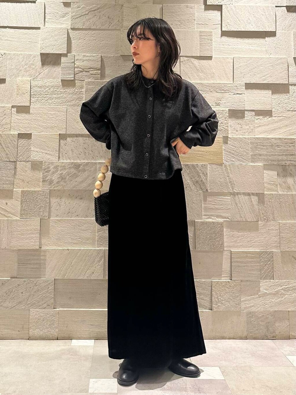ストンと落ちるラインが綺麗なベロアスカート。腰回りのラインもあまり拾いすぎないため、タイトスカートよりもフランクに着れるシルエットです。