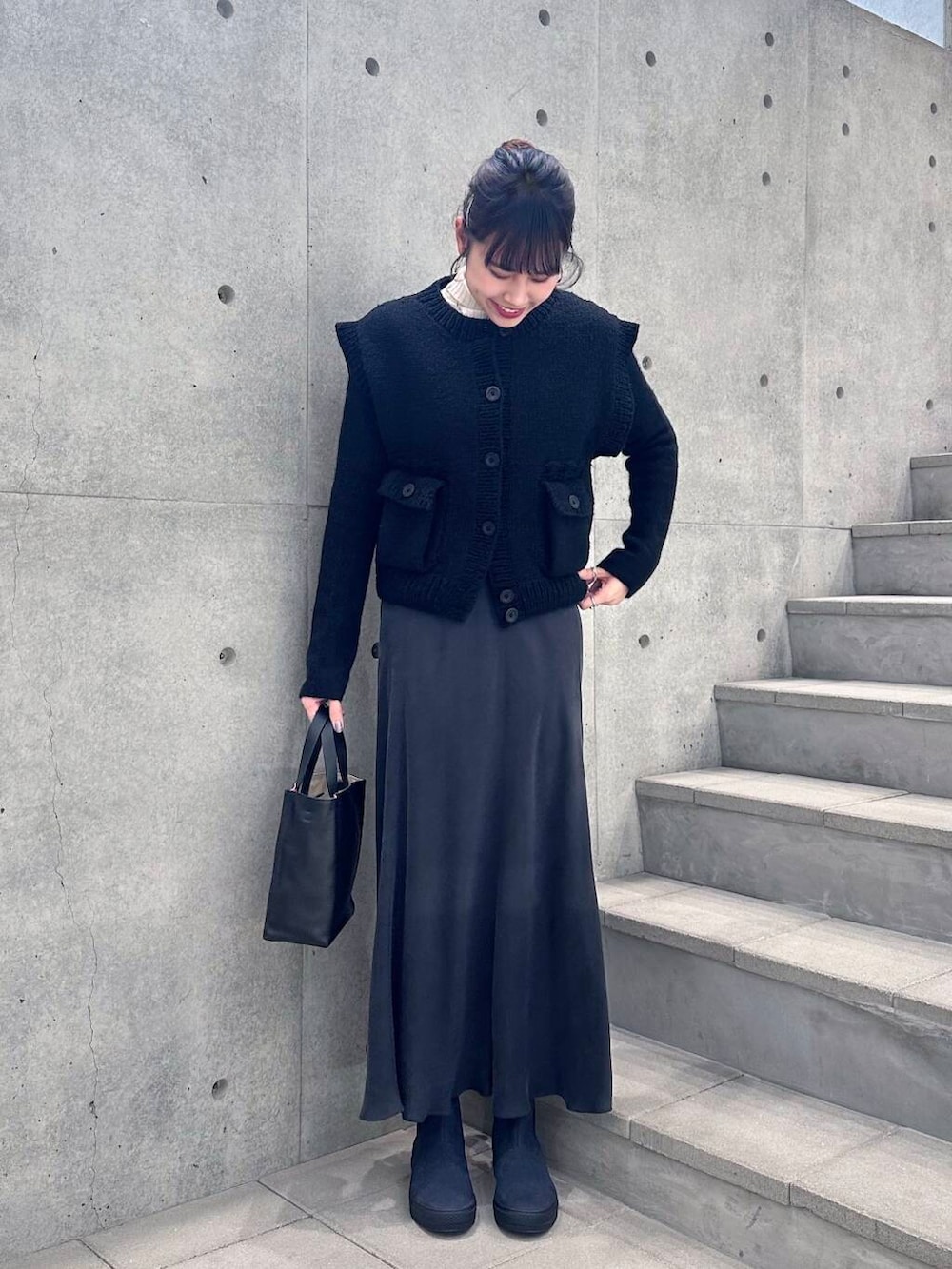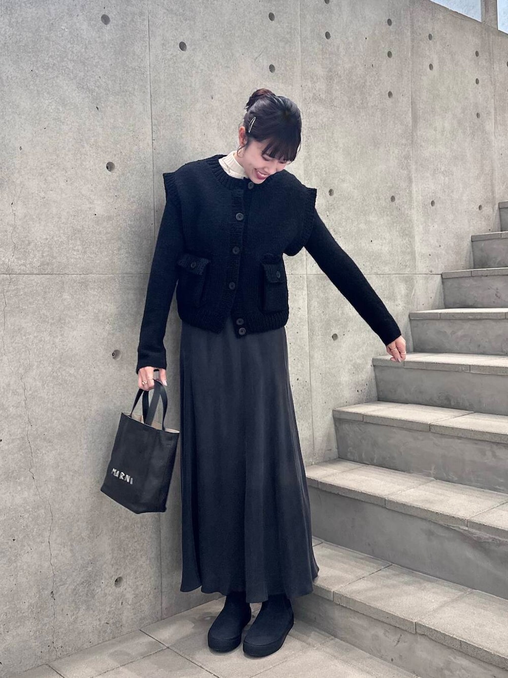 ニットベストはレイヤード感を引き立ててくれて、着ても重たくならないのが嬉しいポイントです。 秋冬のコーデにぴったりのアイテムですね! - The way this skirt drapes is absolutely perfect! The cut is so flattering, and it’s super comfy and stylish—I’m totally in love with it! 🖤🥹