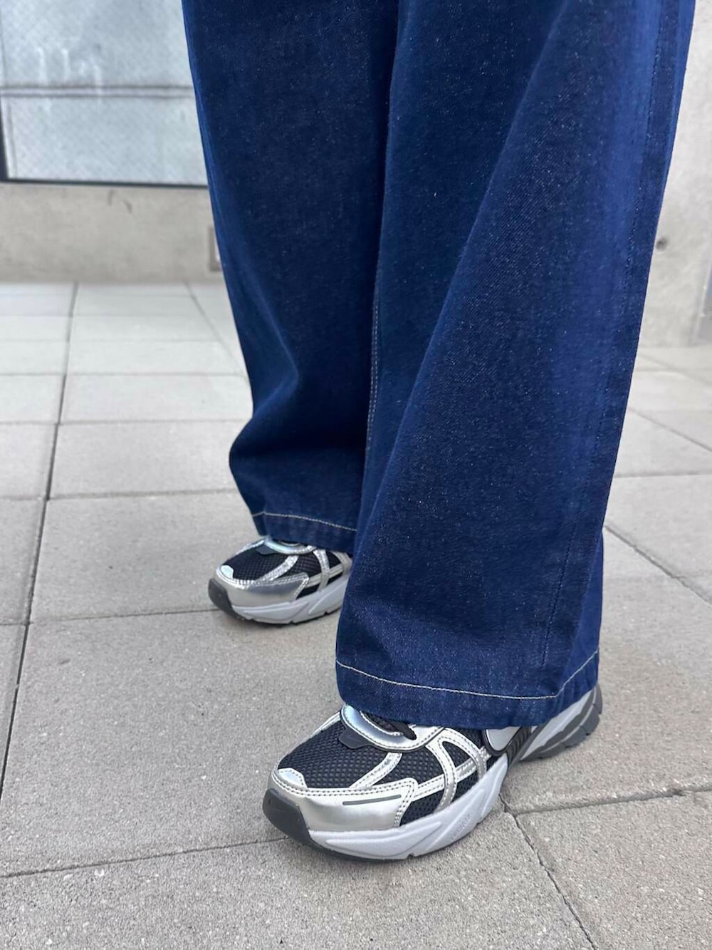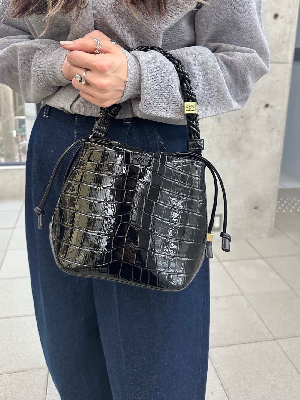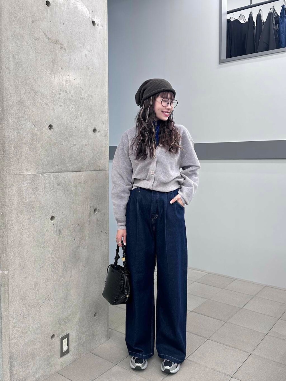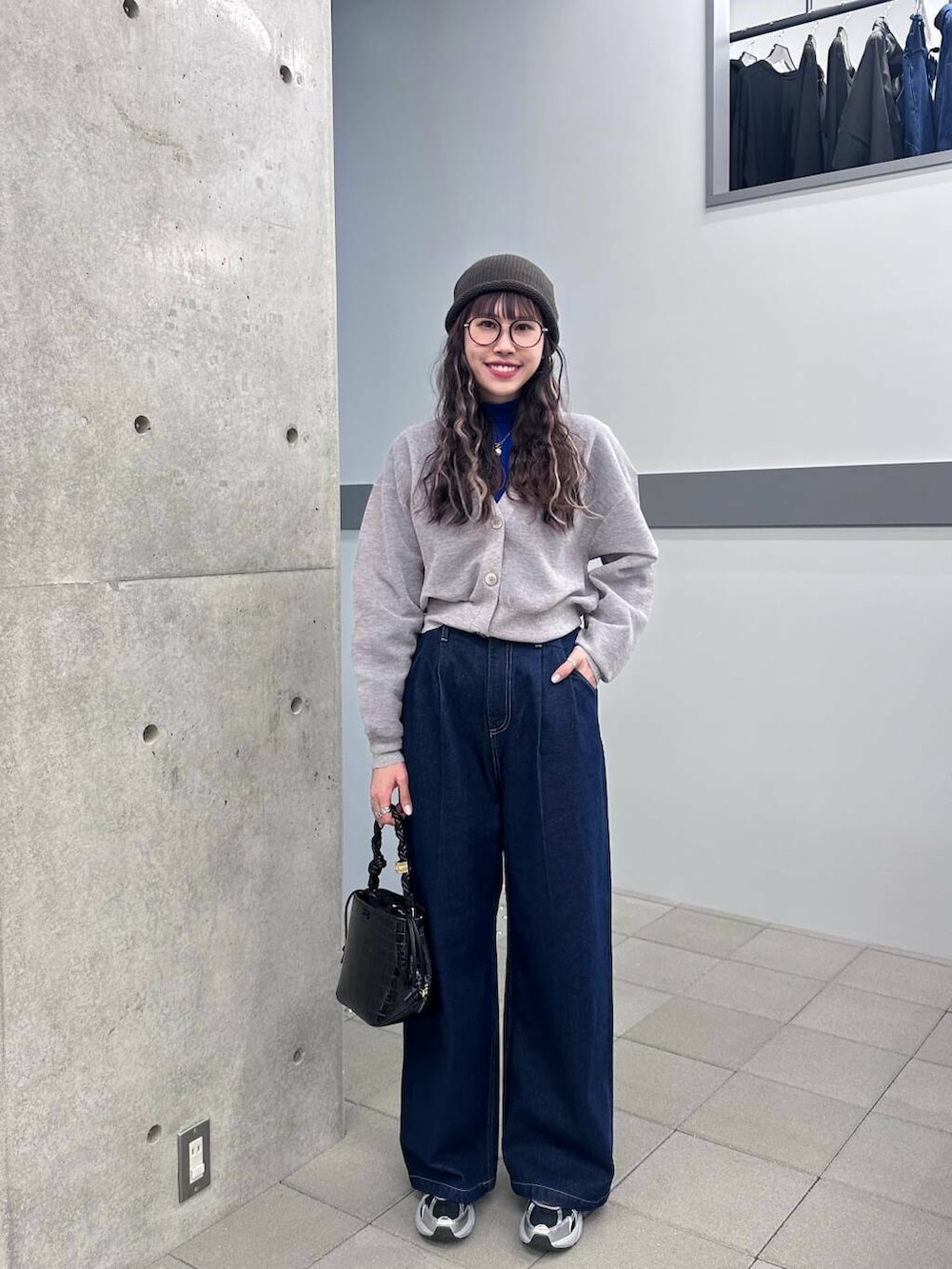 因為灰色針織開衫是短版的所以選擇了高腰寬版牛仔褲做搭配