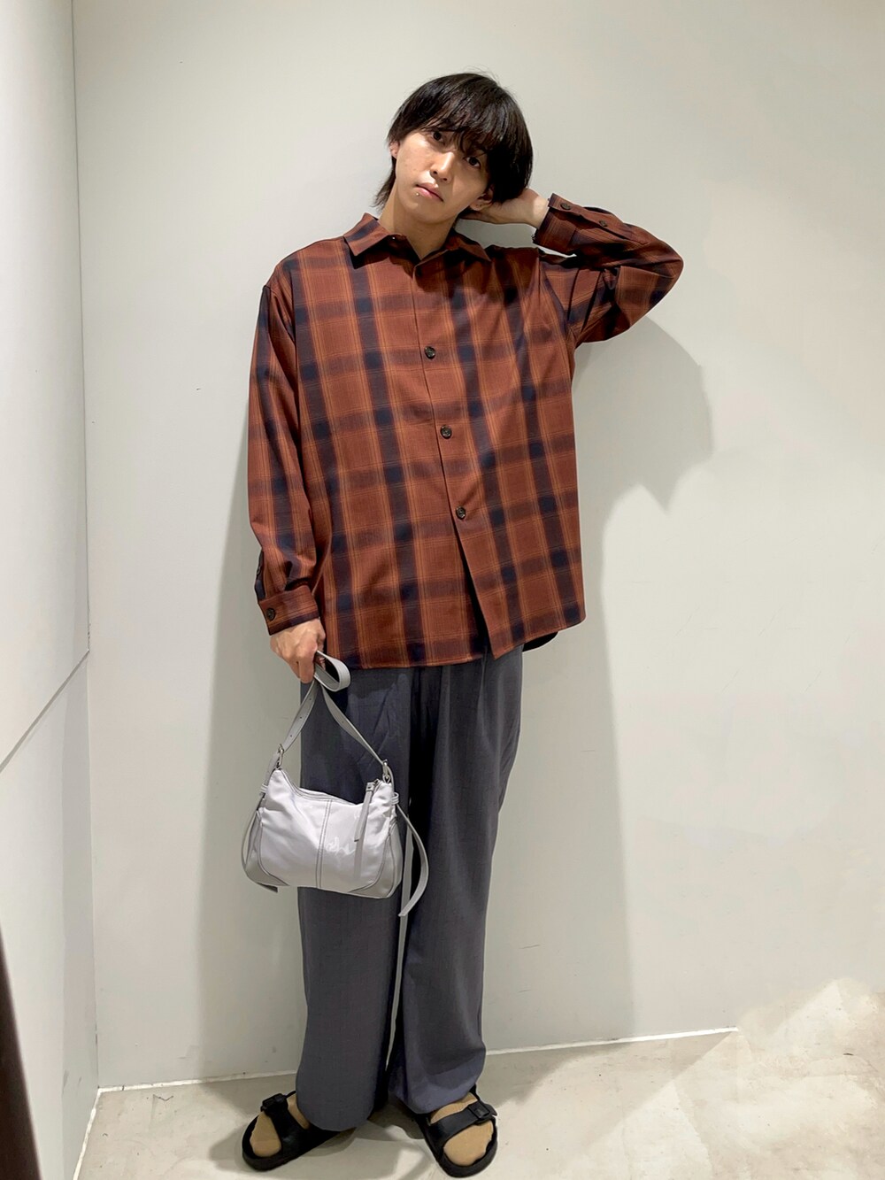 ブラウンチェックのシャツがボタンを閉めて一枚できるのもいいしロゴの入ったTシャツを中に入れると