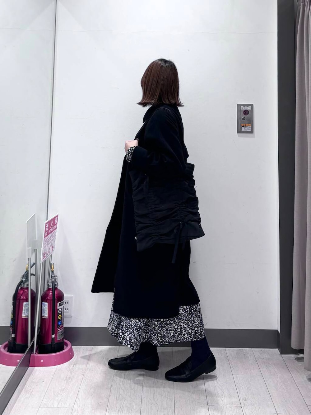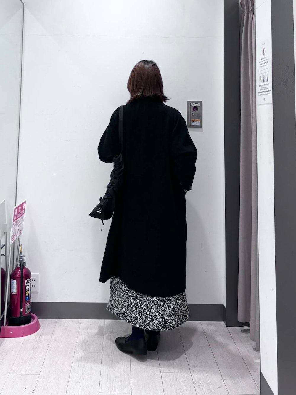 こちらは甘めな花柄のワンピースにベーシックな黒のロングコートを合わせることで大人ぽく仕上げました!