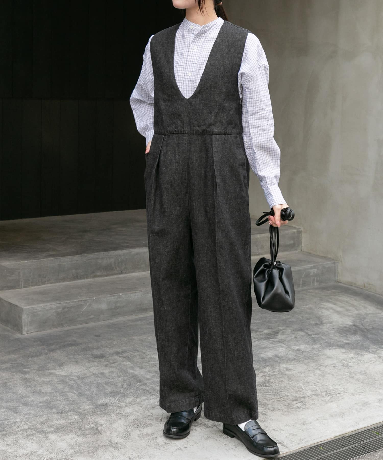 デニムカバーオールに、同系色のデニムオールインワンを合わせました🍳