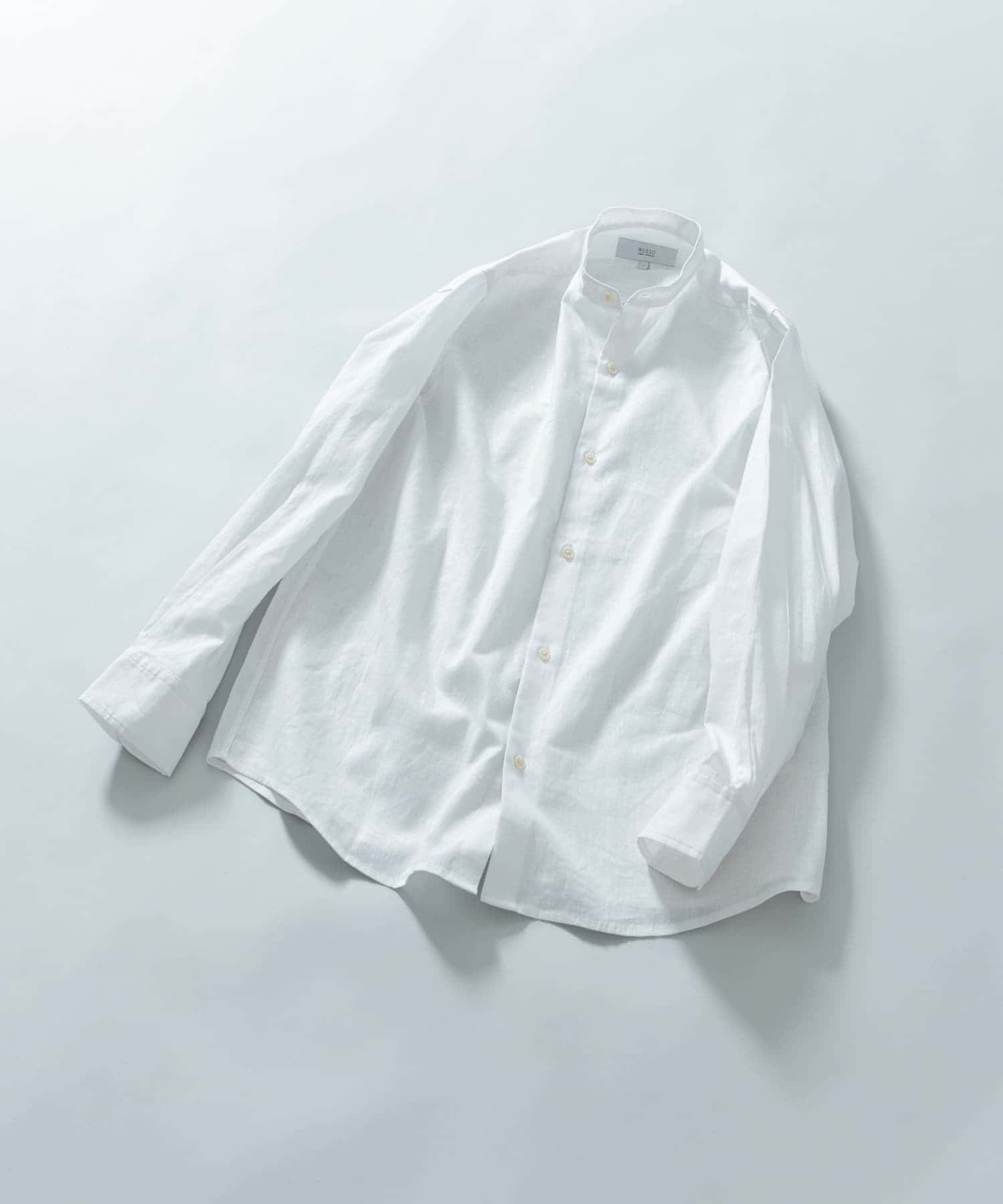 清涼感ある綿麻素材&汎用性の高いバンドカラータイプ、開けても閉めても様になる万能シャツ。
