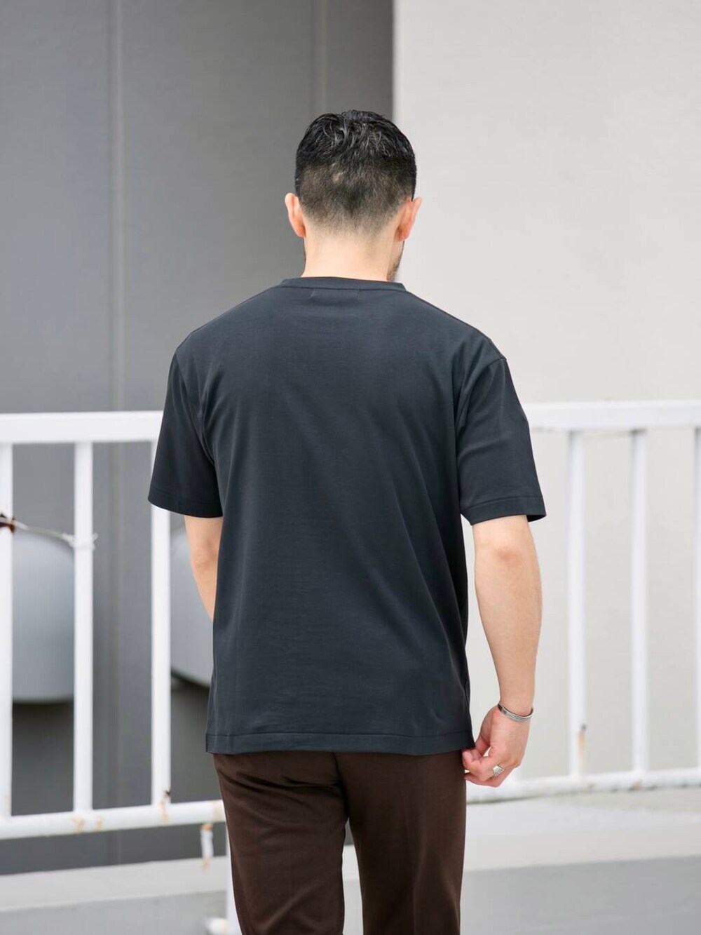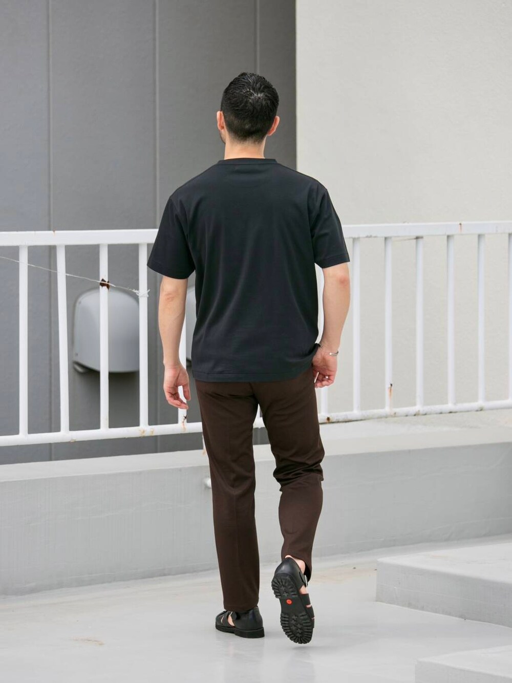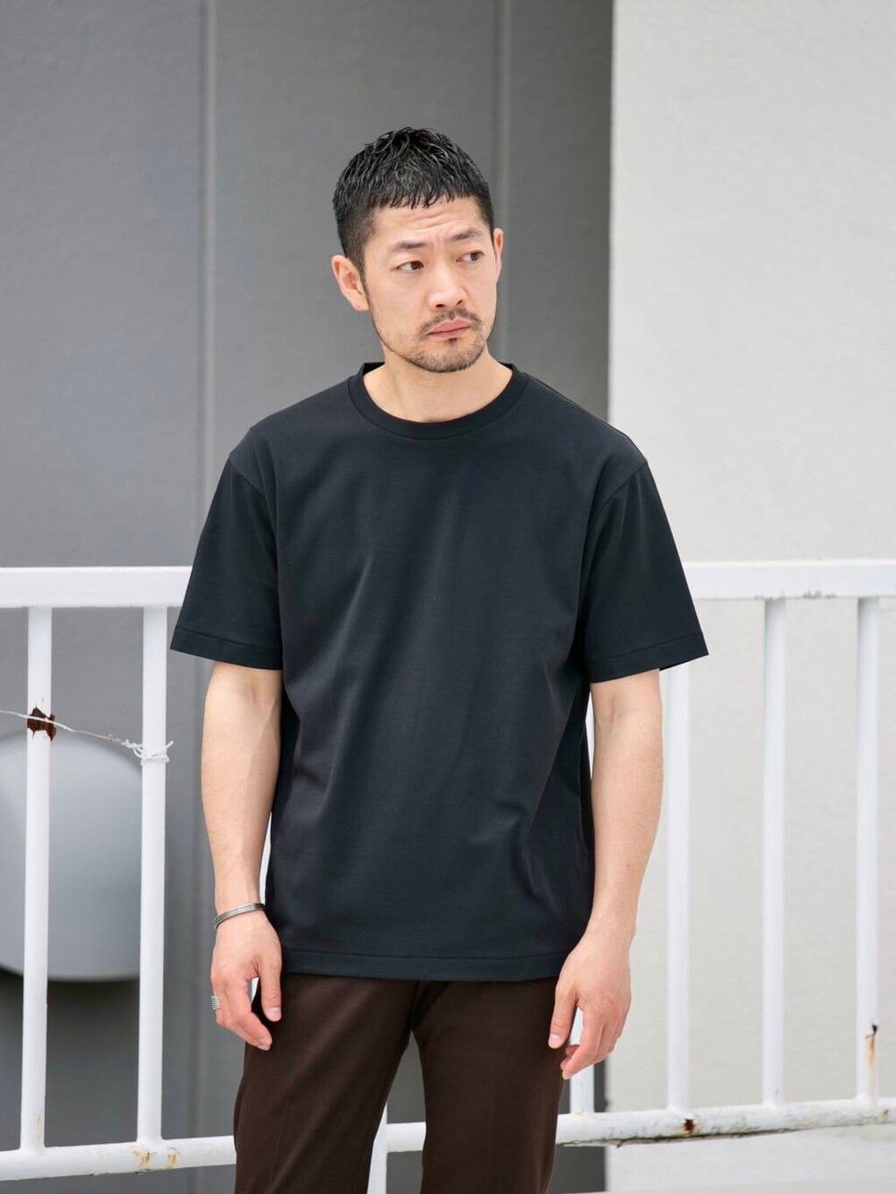 Tシャツ&スラックス。