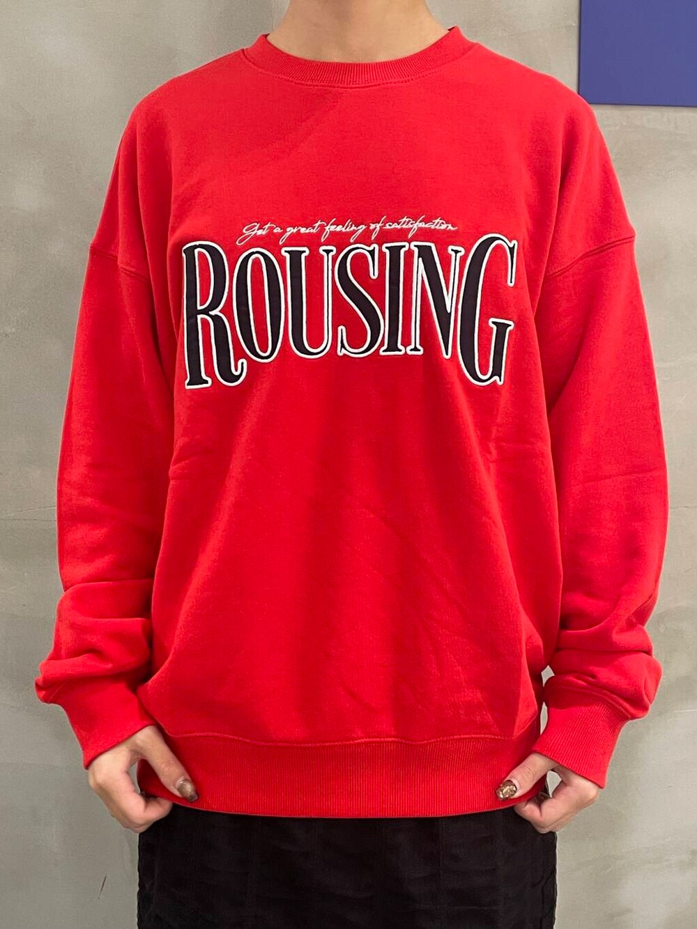 シンプルな服装でもバシッと決まる赤のロゴスウェット。