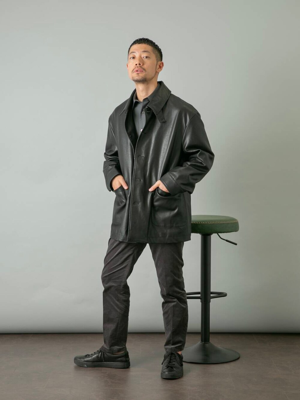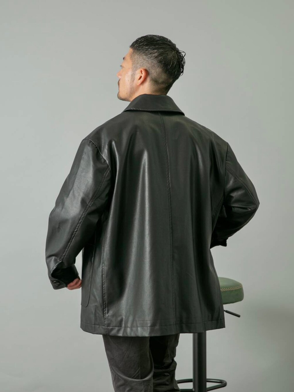フェイクレザーなので見た目より軽い着心地とイージーケアが魅力。