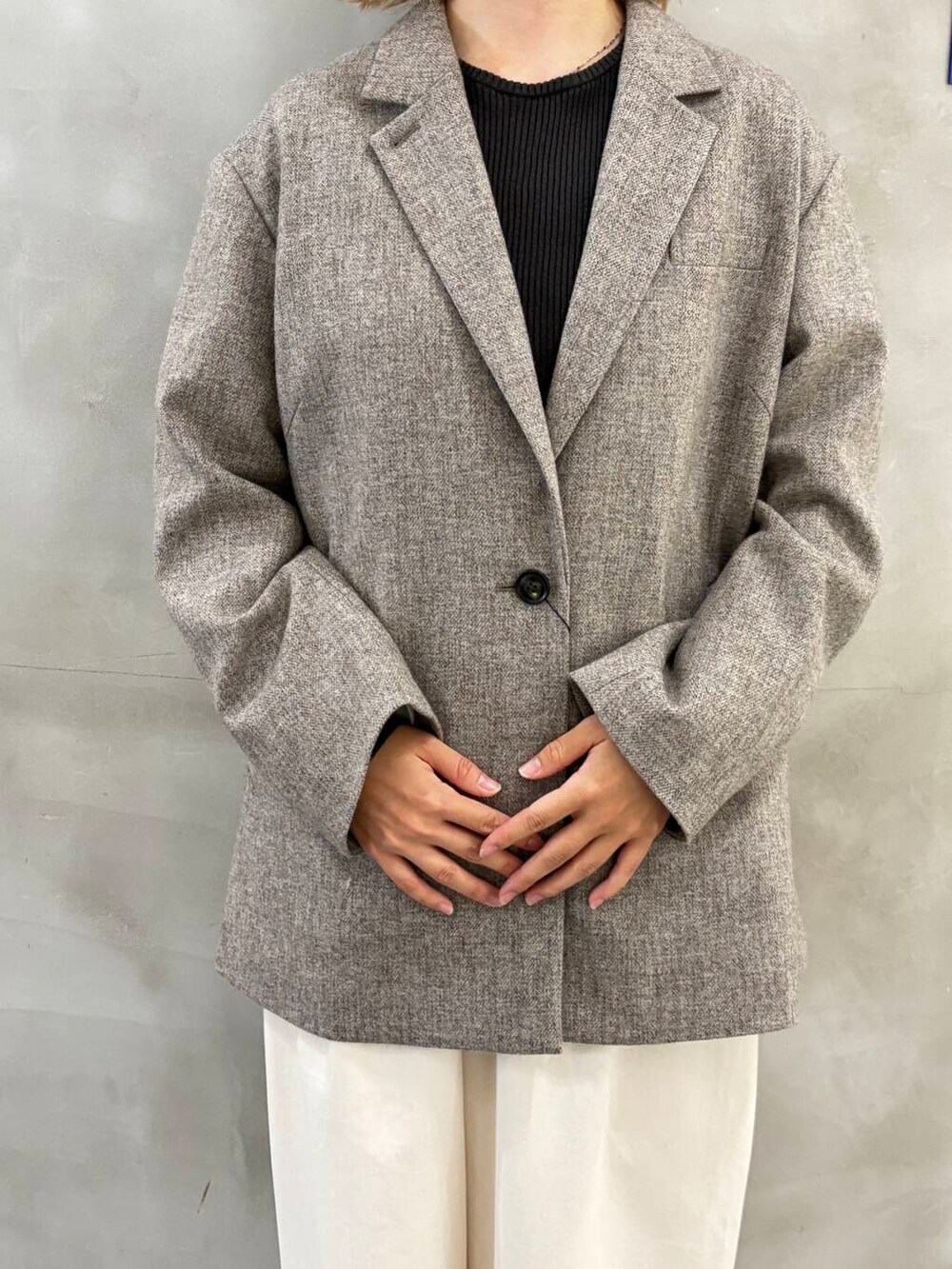 ベージュカラ―のウール素材のジャケットと、ホワイトのチノワイドパンツを合わせました。