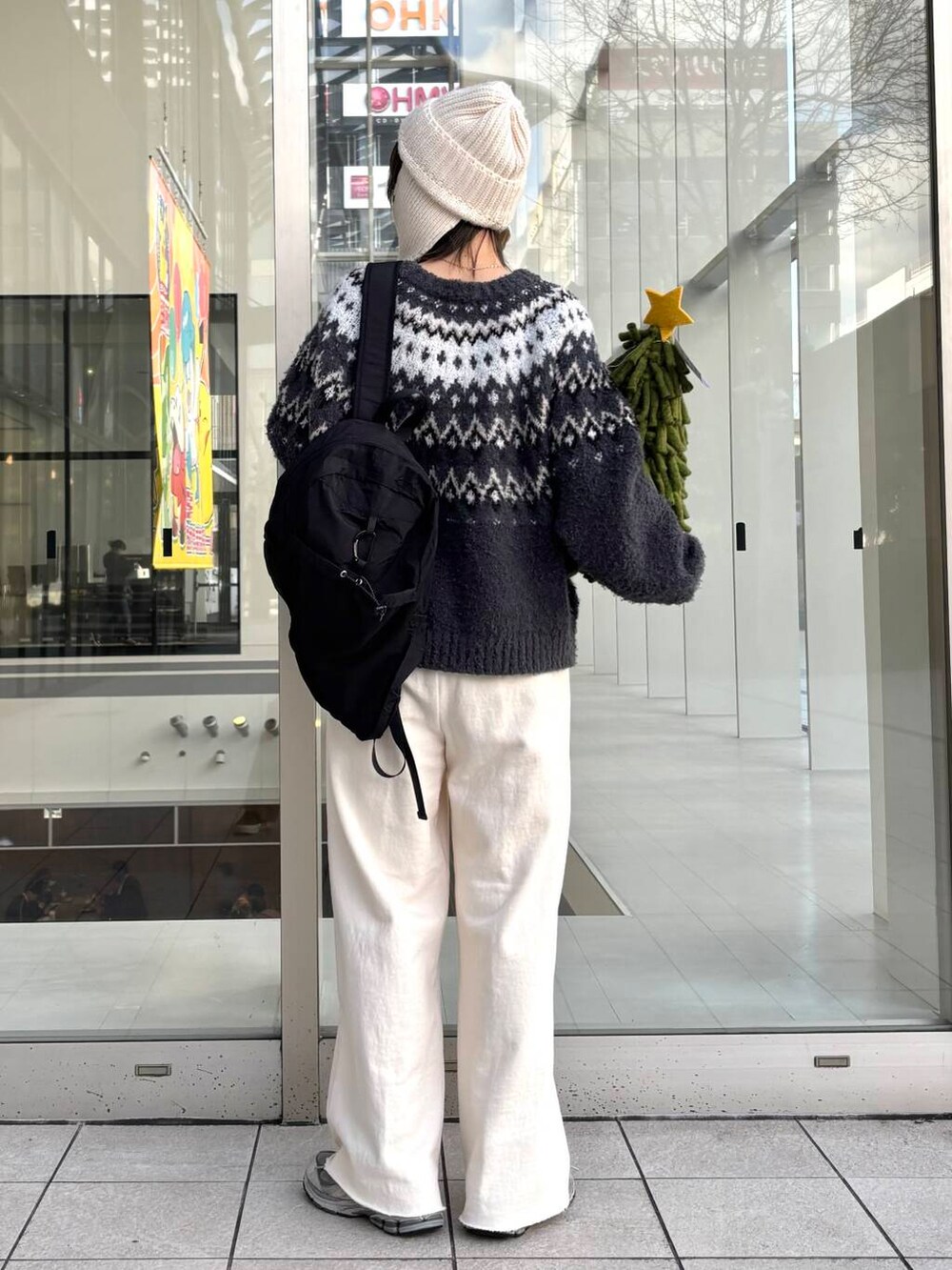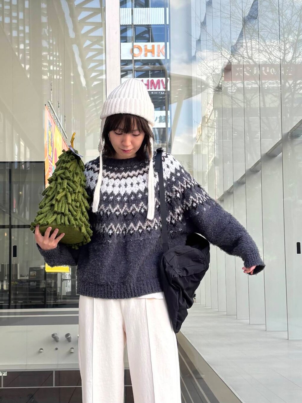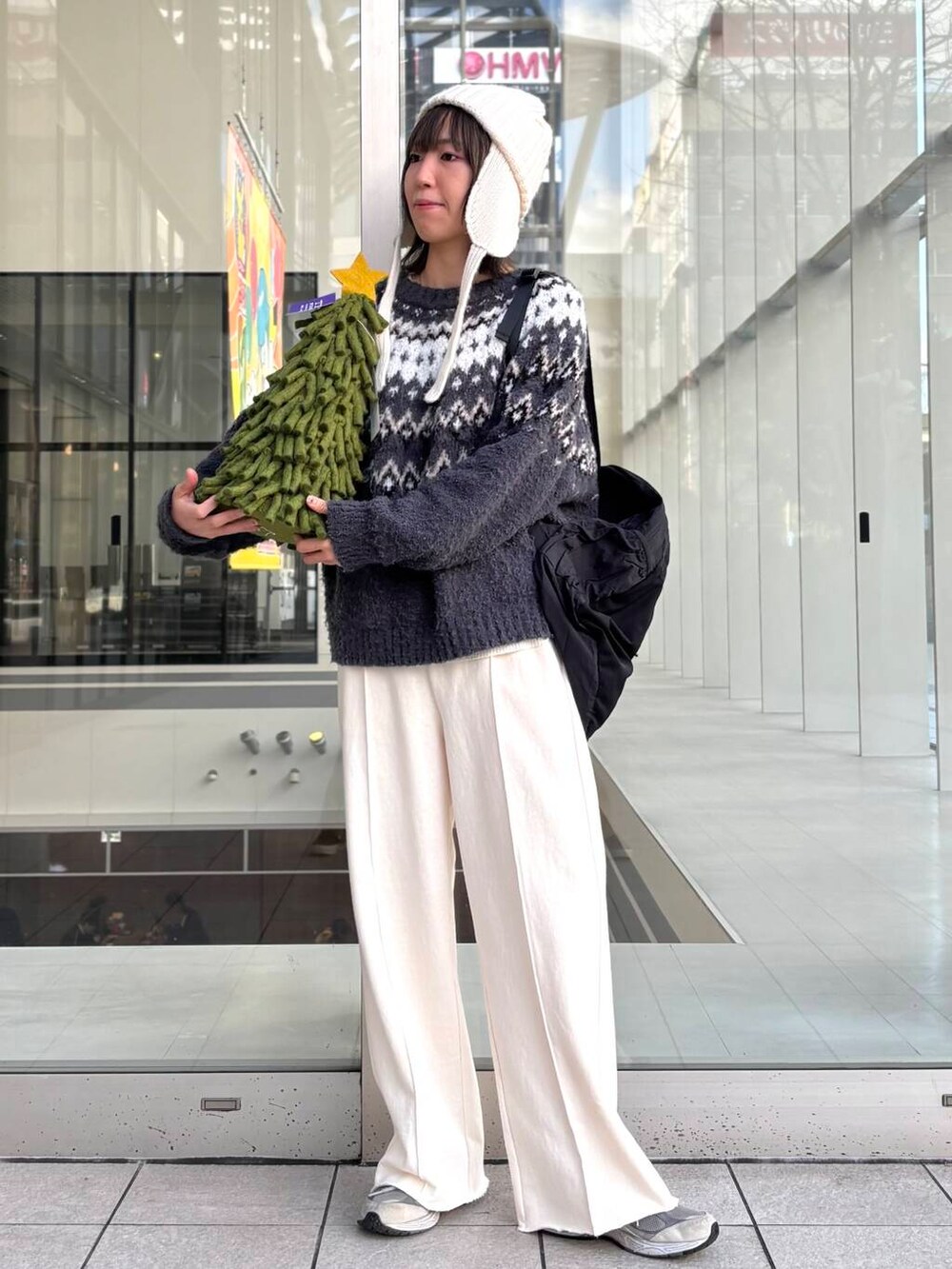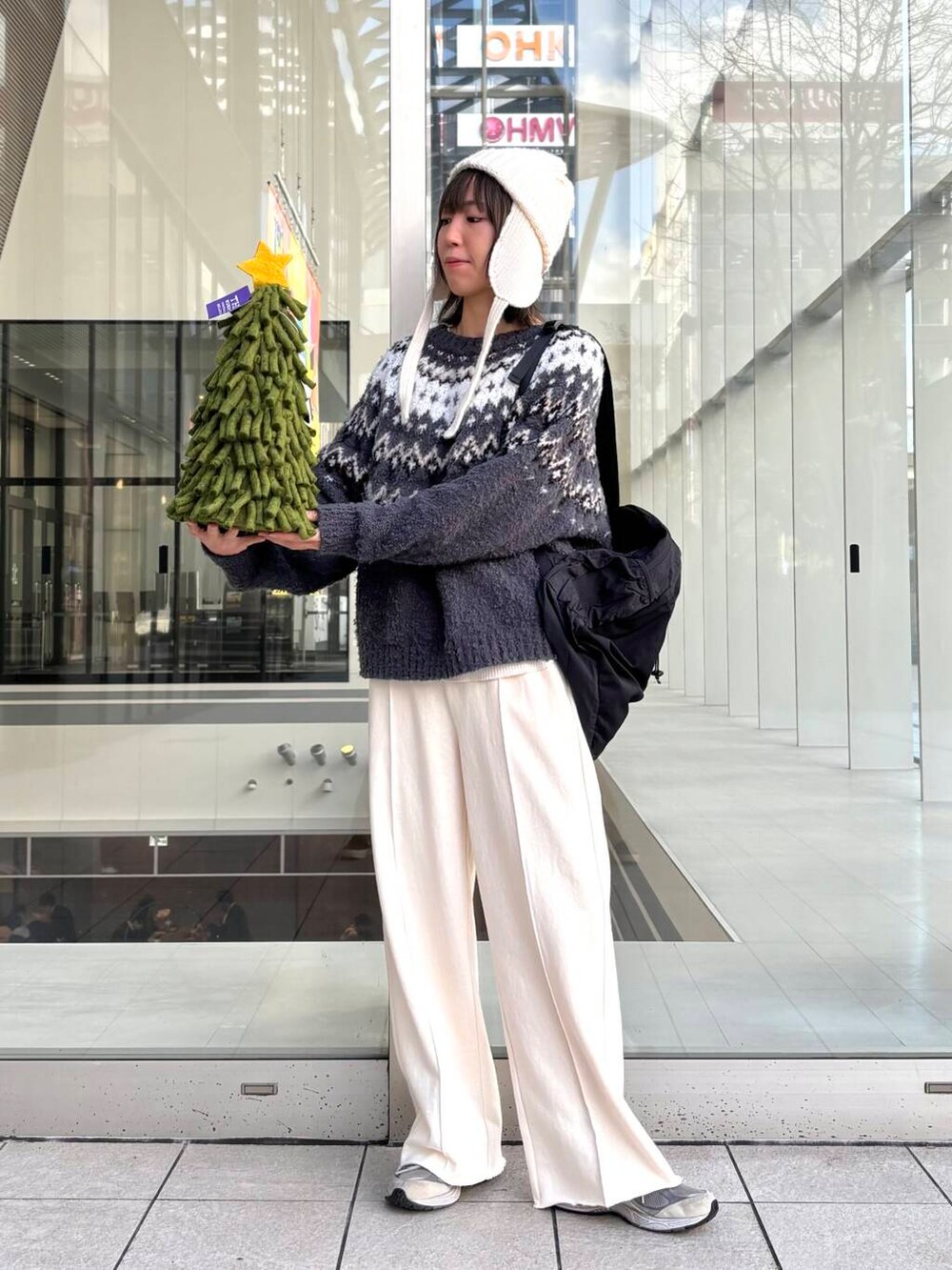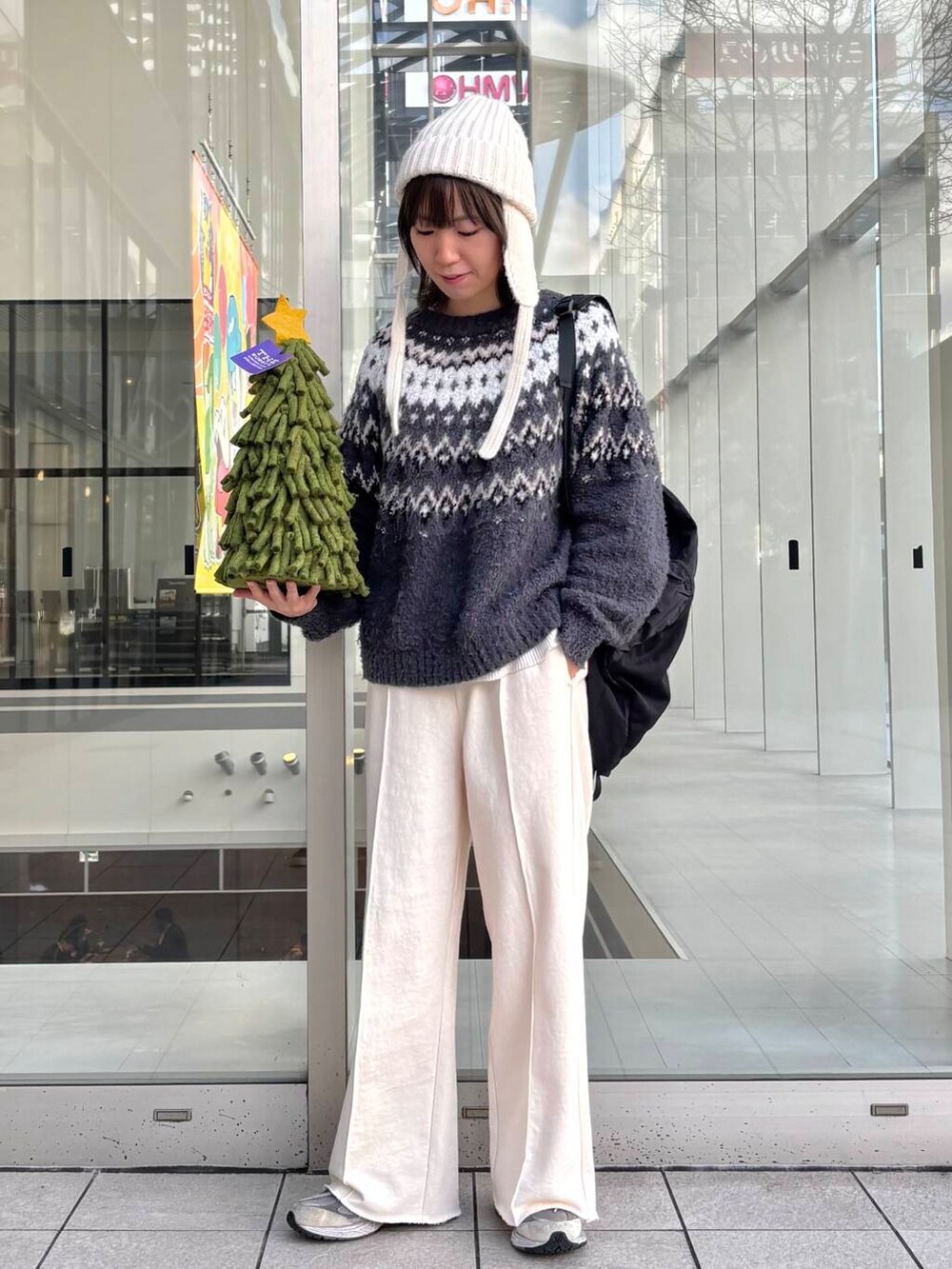 お気に入りのEKALのニット、白いニット帽、白いスウェットパンツを合わせて冬コーデ⛄️を組んでみました