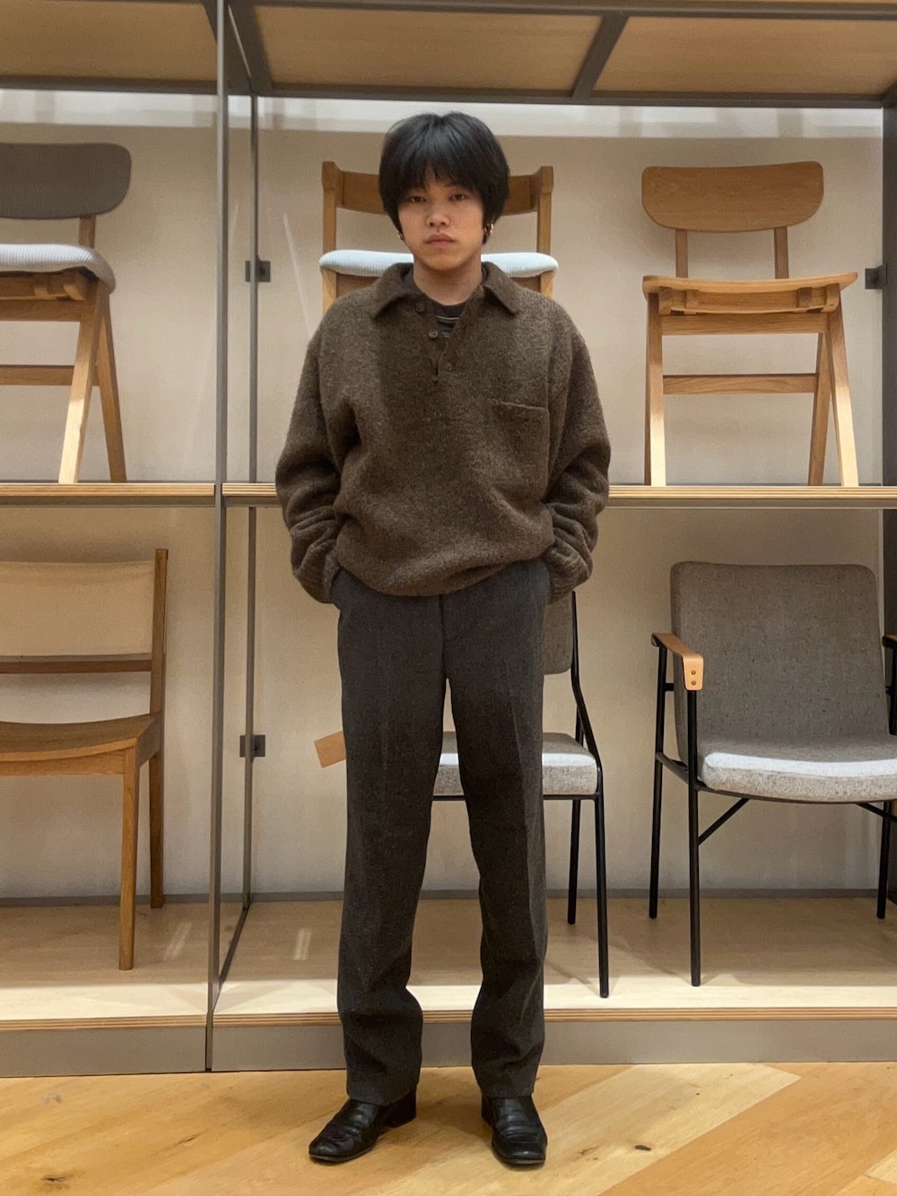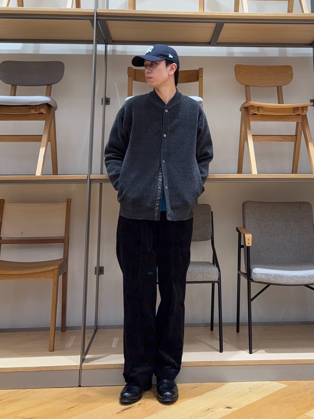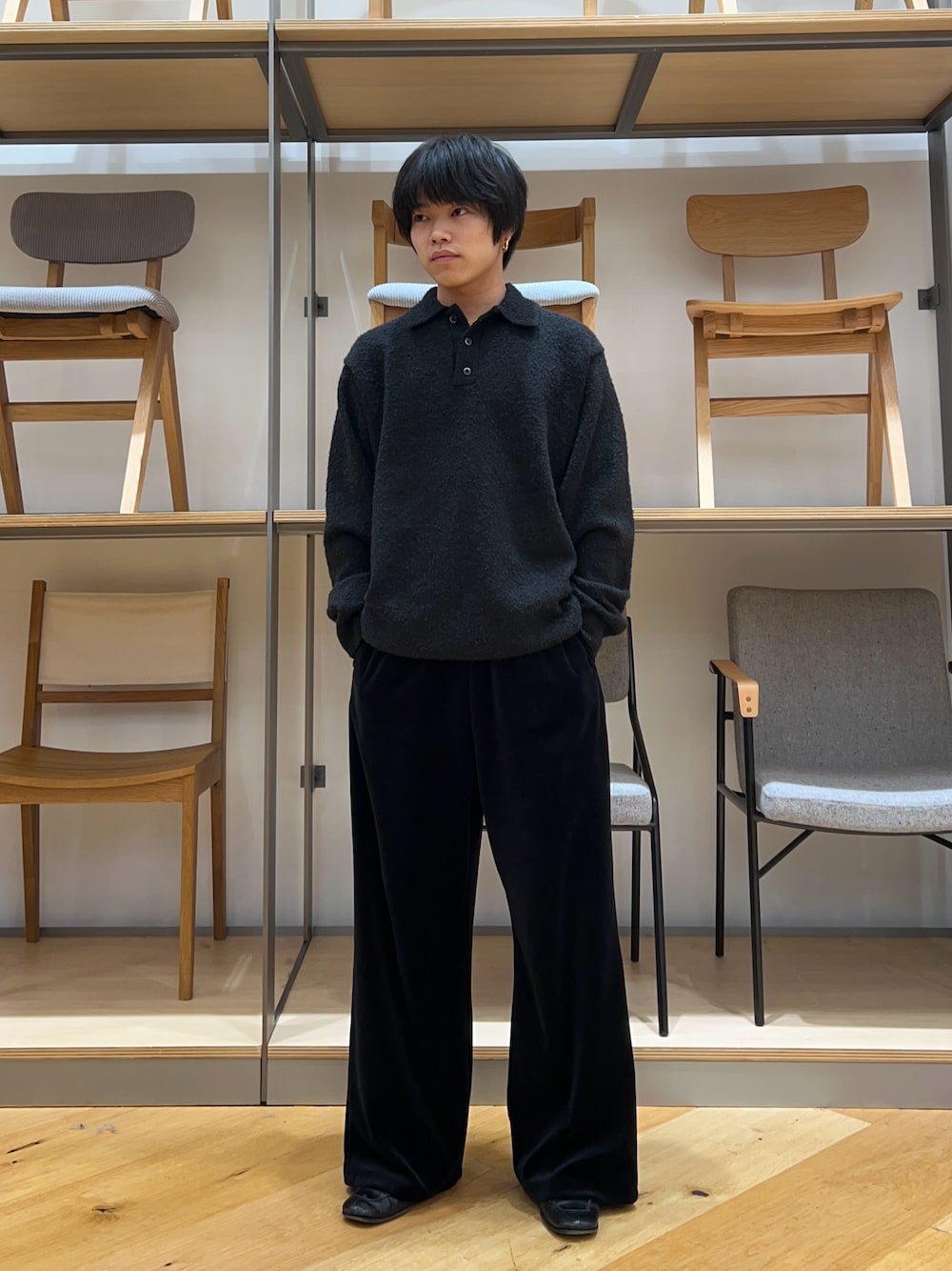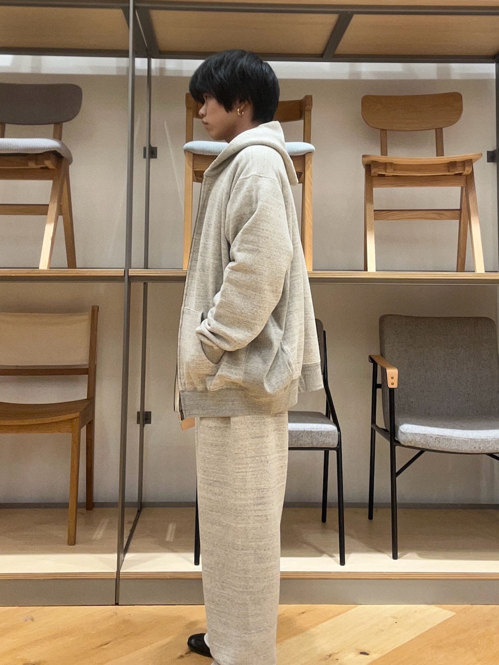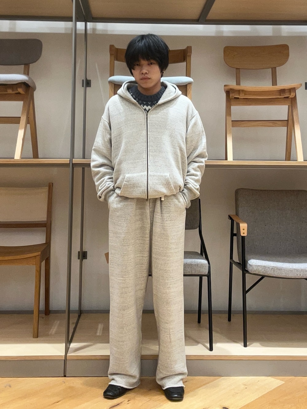 楽をしても決まるスウェットのセットアップです!今回は中にニットを選びましたが何を着ても合うと思います!軽くお出かけする際にこのセットアップがあるとかなり楽です!