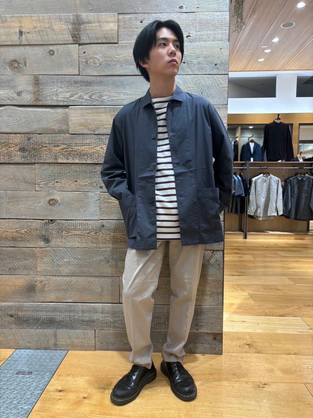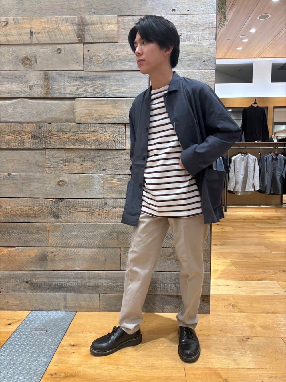 ボーダーのロンTが素敵です。シャツの色味も落ち着いていて秋やこれからの季節にピッタリです。いつでも羽織りやすいシャツになっています。チノパンもテーパードが効いていて履きやすいです。