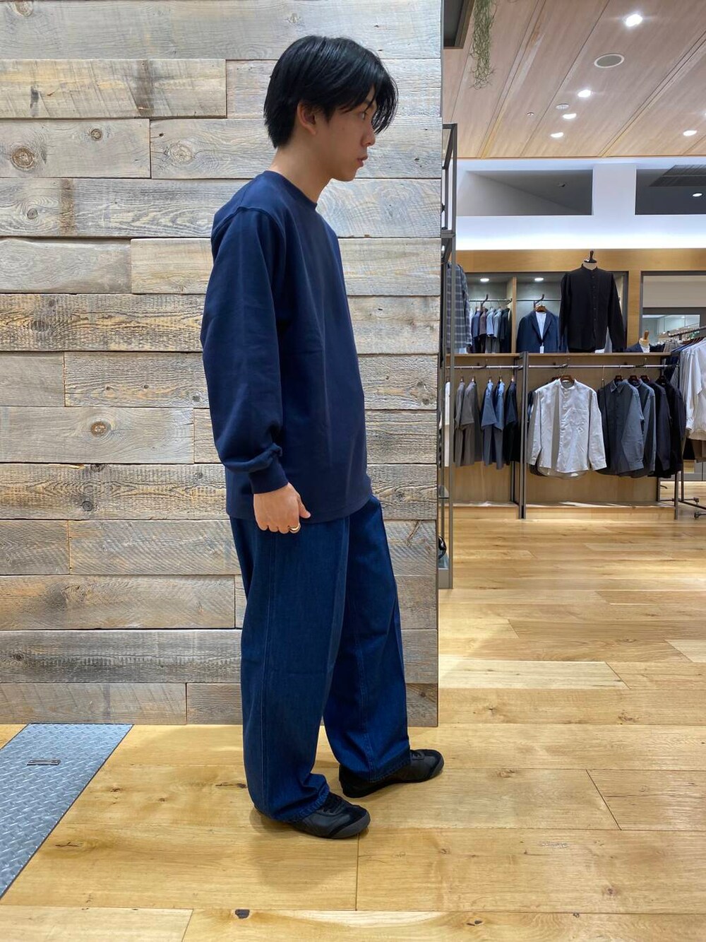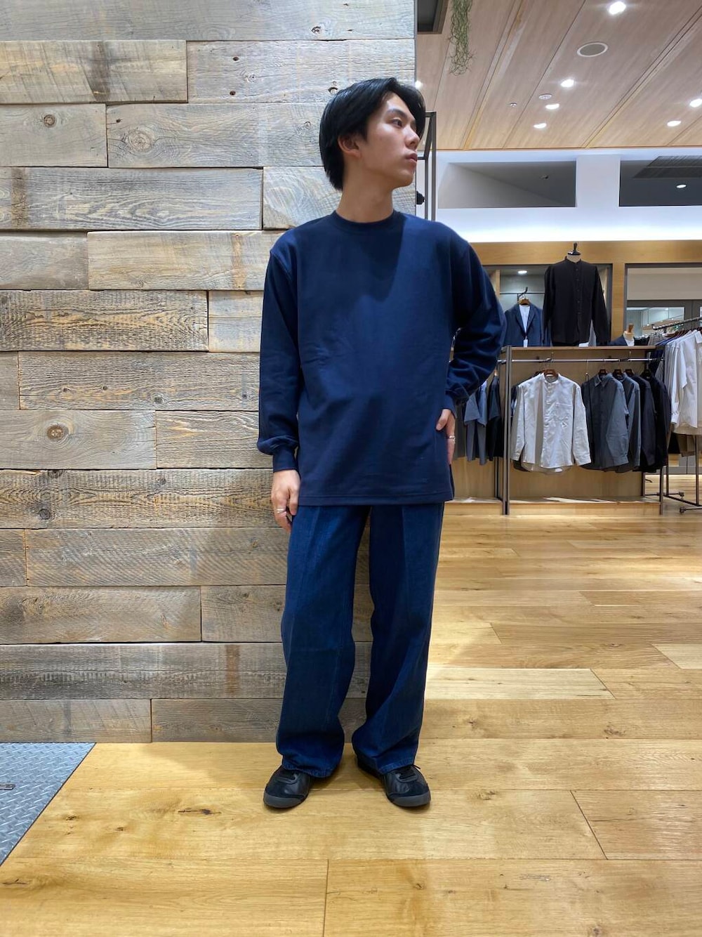 インディゴでラフコーデです。デニムはシルエットが良く、足が綺麗に見えます。色味も落ち着いていていろんなコーデに使えますので秋にもピッタリです。ロングスリーブは着心地が非常に良く、一枚で様になります。