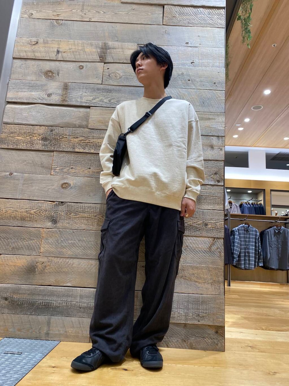 パンツはチャコールのコーデュロイ生地を使ったカーゴパンツです。コーデュロイの素材感で秋冬感がありながら通気性にも優れています。非常に履きやすいです。シルエットも綺麗です。162センチでMサイズを着用しています。