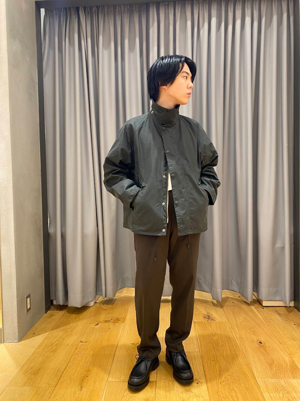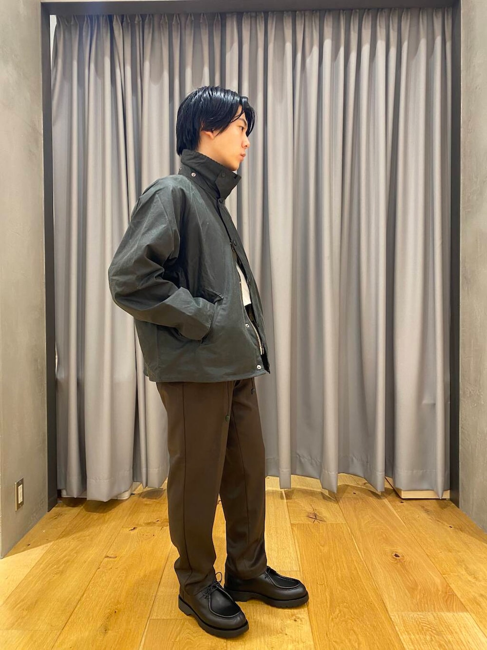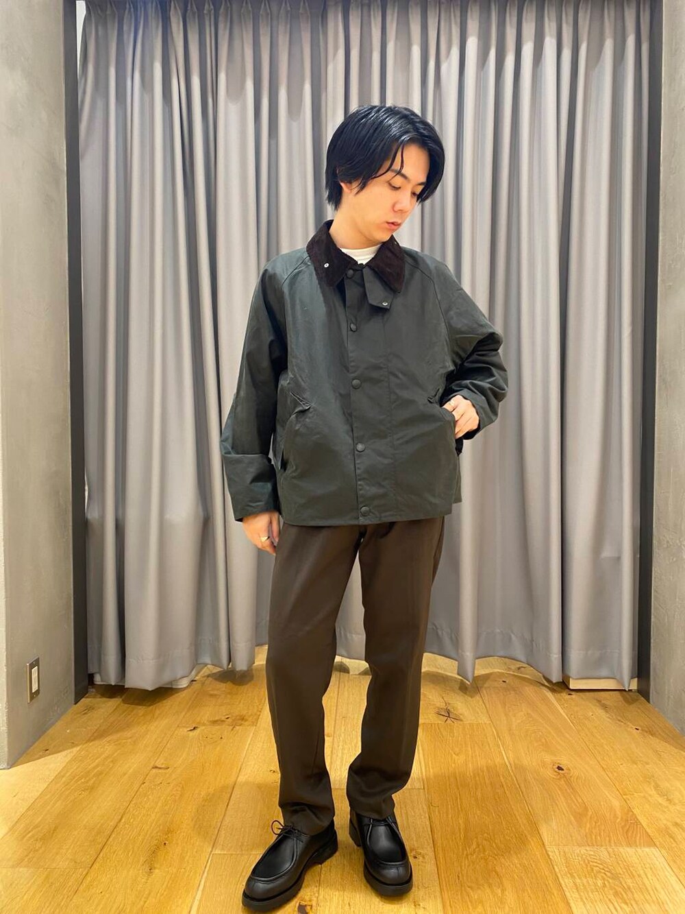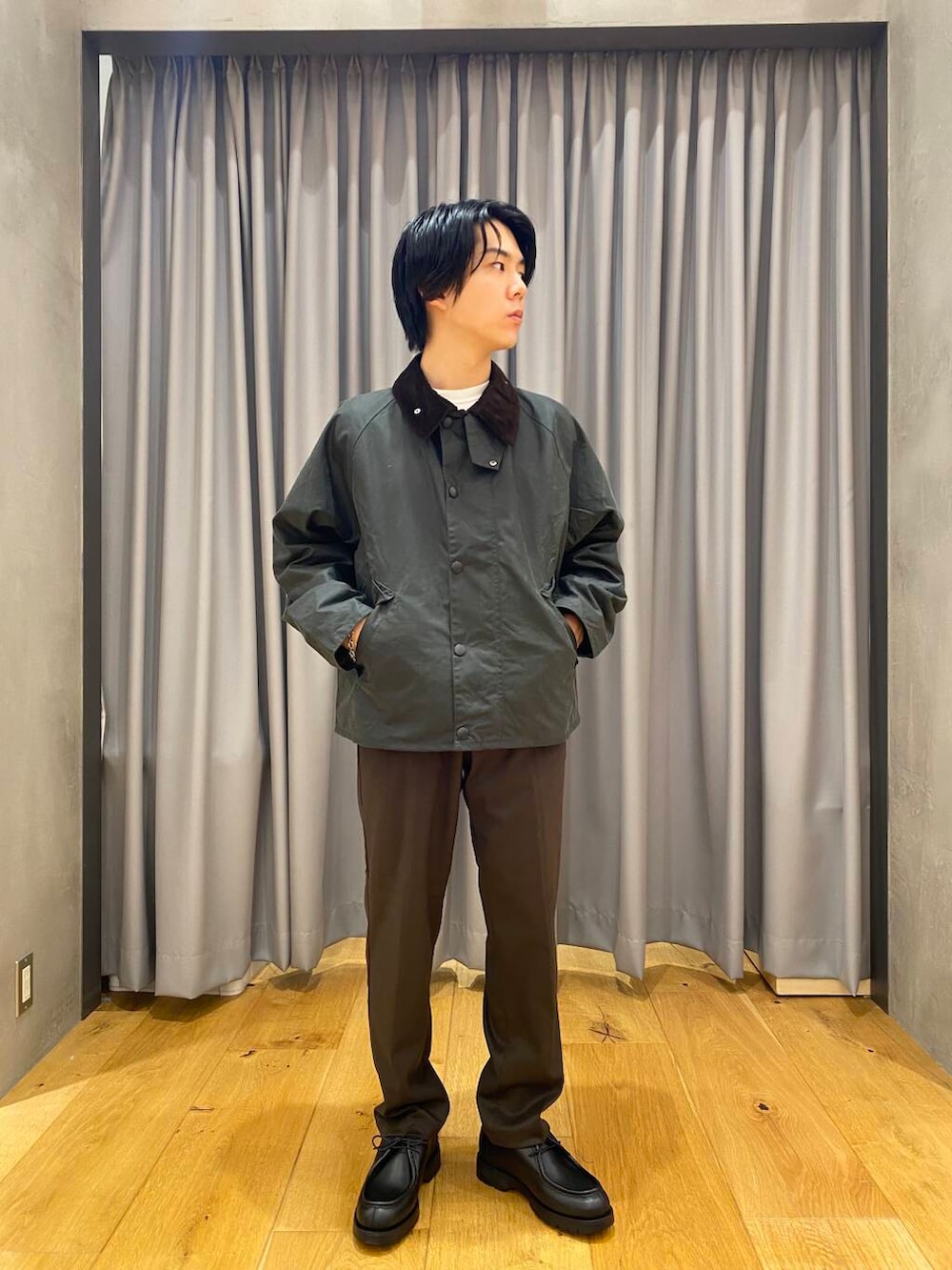 Barbour(バブアー)のOSトランスポートワックスジャケットです。セージ色を着用しています。着丈が絶妙なトランスポートという型です。レングスは短めでワイドなシルエットは今っぽさがあります。ワックスジャケットなのでワックスがついていて防水性と耐久性に優れた生地になっています。色味やシルエット、ボタンやチャック、細かなディテールなど雰囲気が圧倒的にかっこいいです。ユニセックスでも着用いただけます。ボタンとチャックを閉めても開けてもどちらもかっこいいです。秋冬のアウターに最適です。