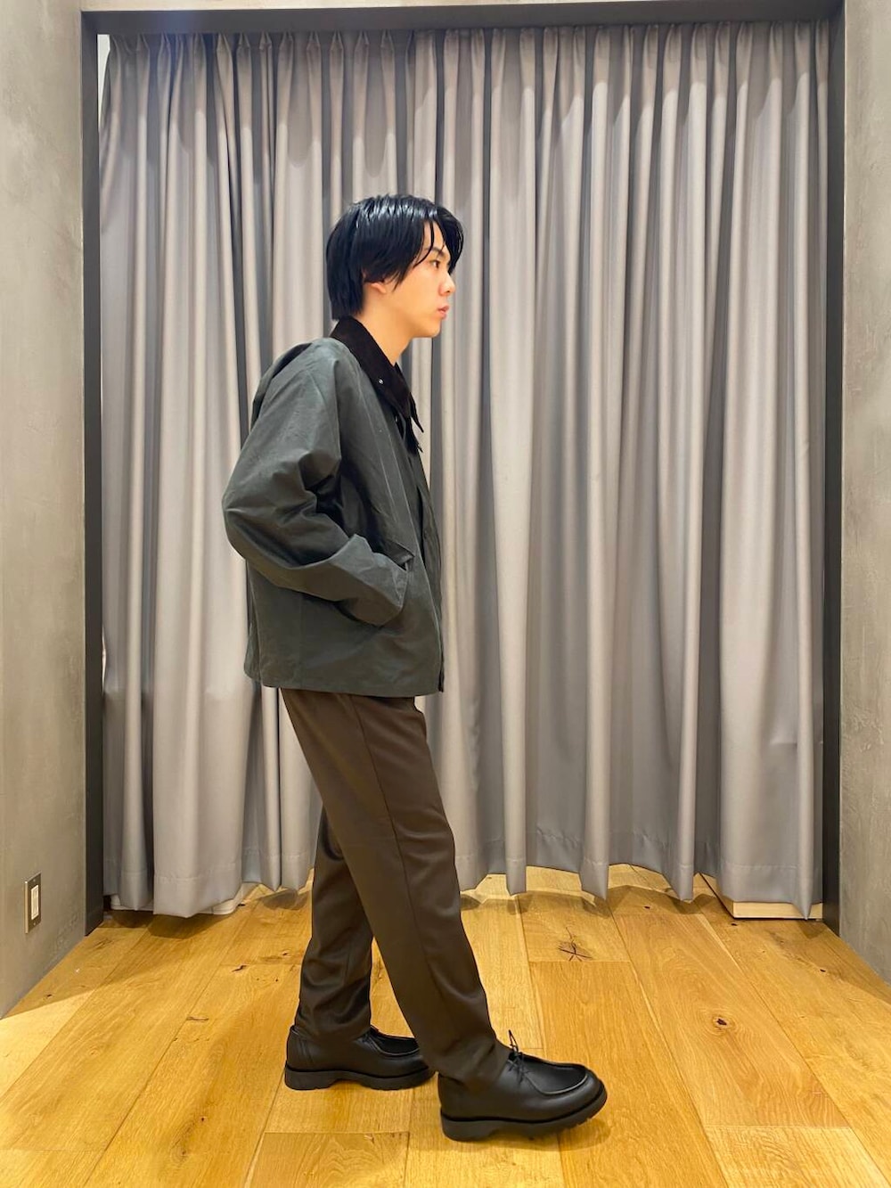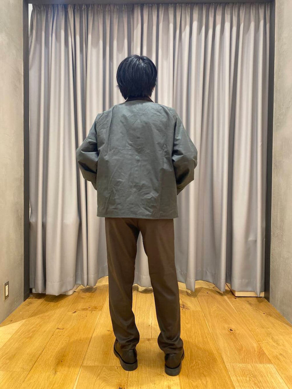 パンツはドアーズのウールライクのテーパードパンツです。生地感が今の時期にピッタリです。色味も秋冬っぽくオリーブブラウンを着ました。テーパードがかかっていて少し細めの綺麗なシルエットで履くことができます。