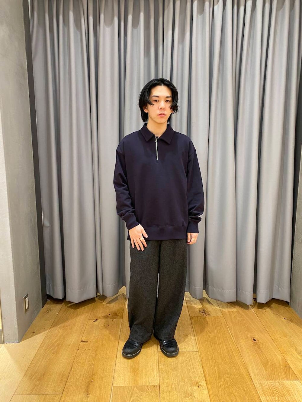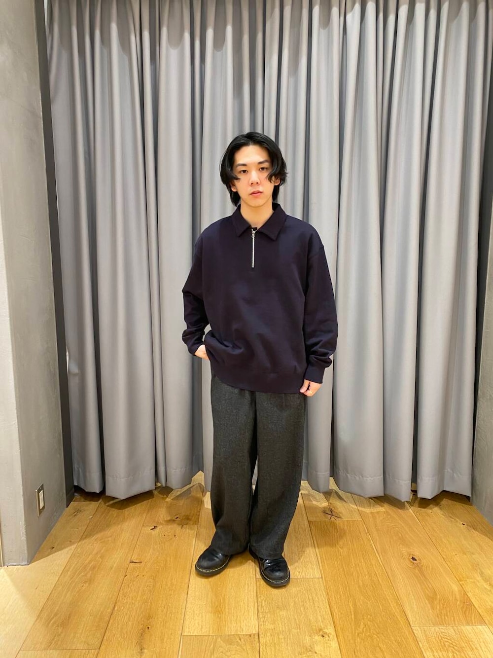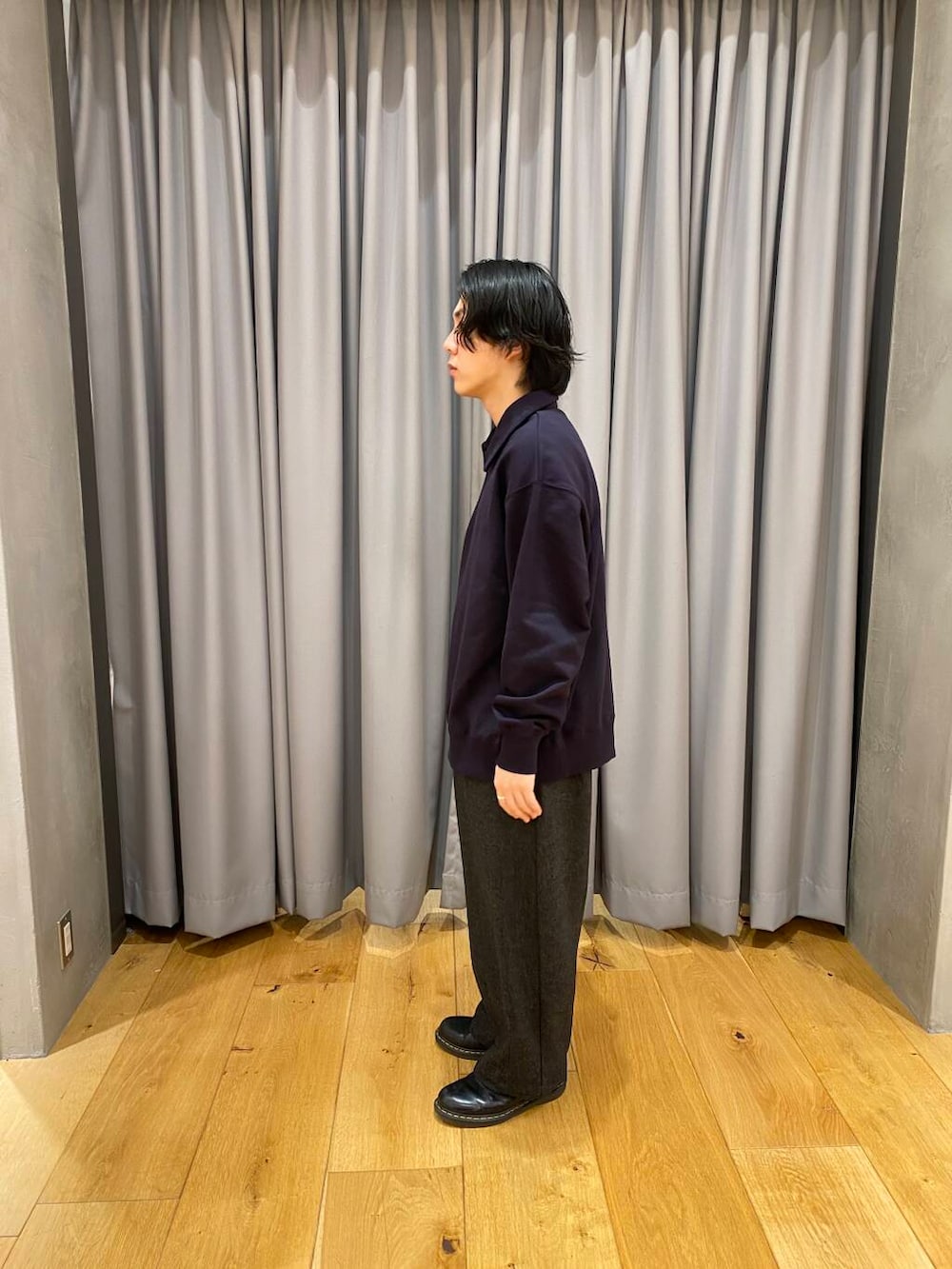ハーフジップのトップスです。濃いパープル寄りのネイビーでおすすめです。大人っぽく良い色で着やすいです。パンツも太めのバルーンパンツで万能おすすめ。