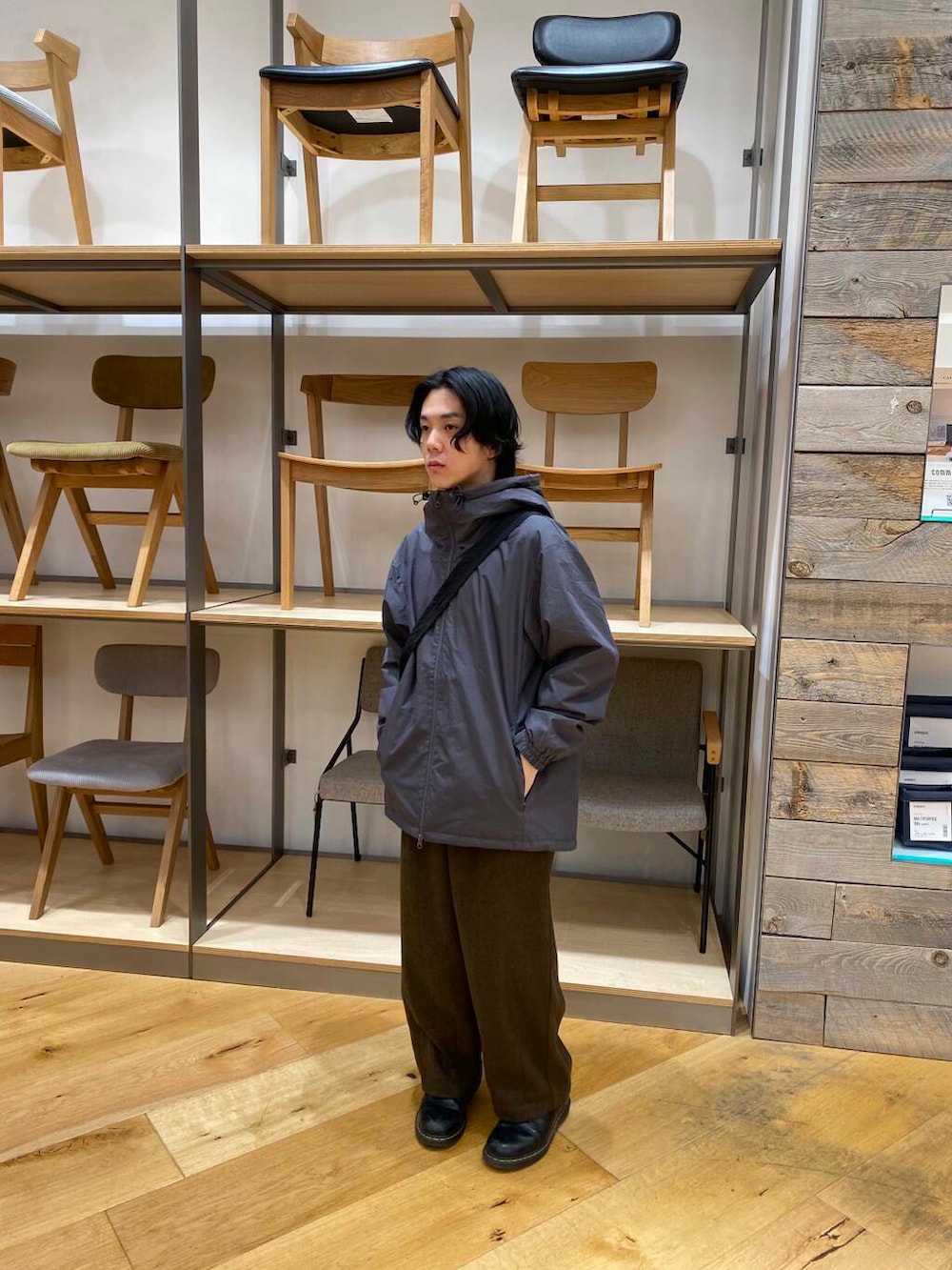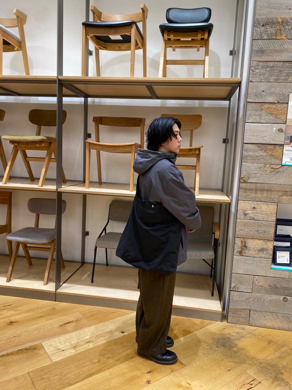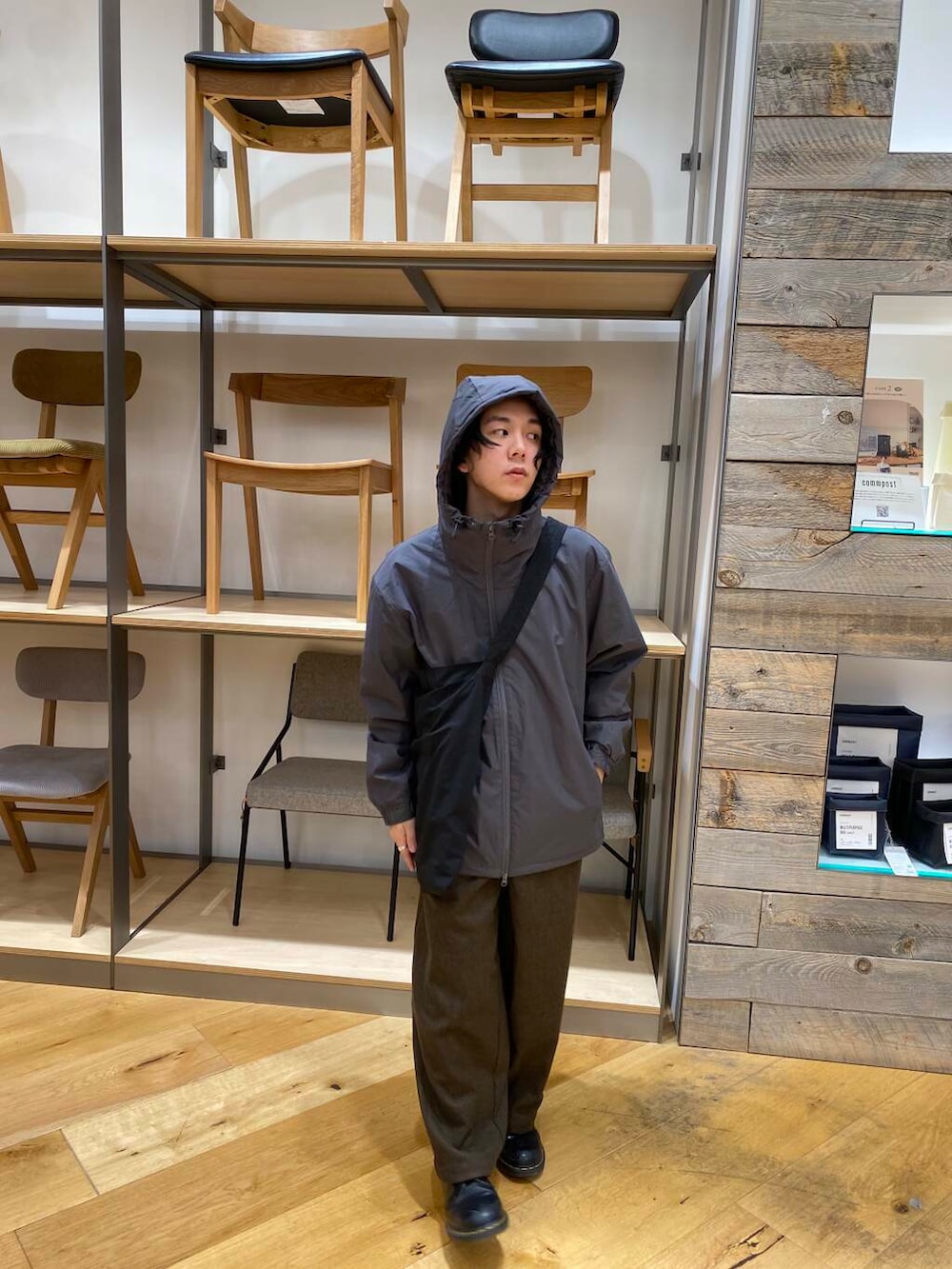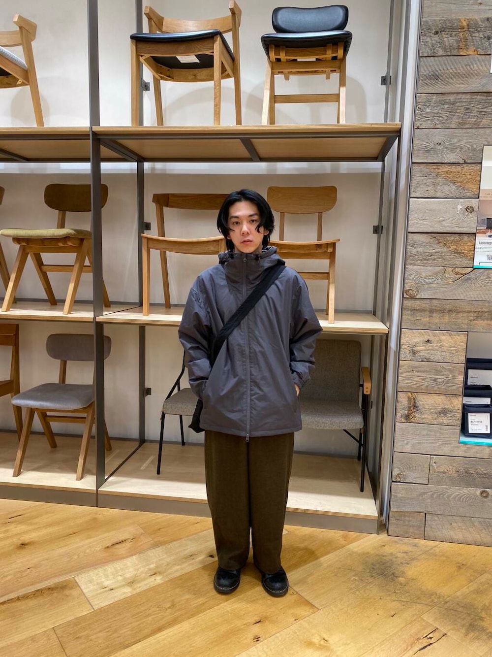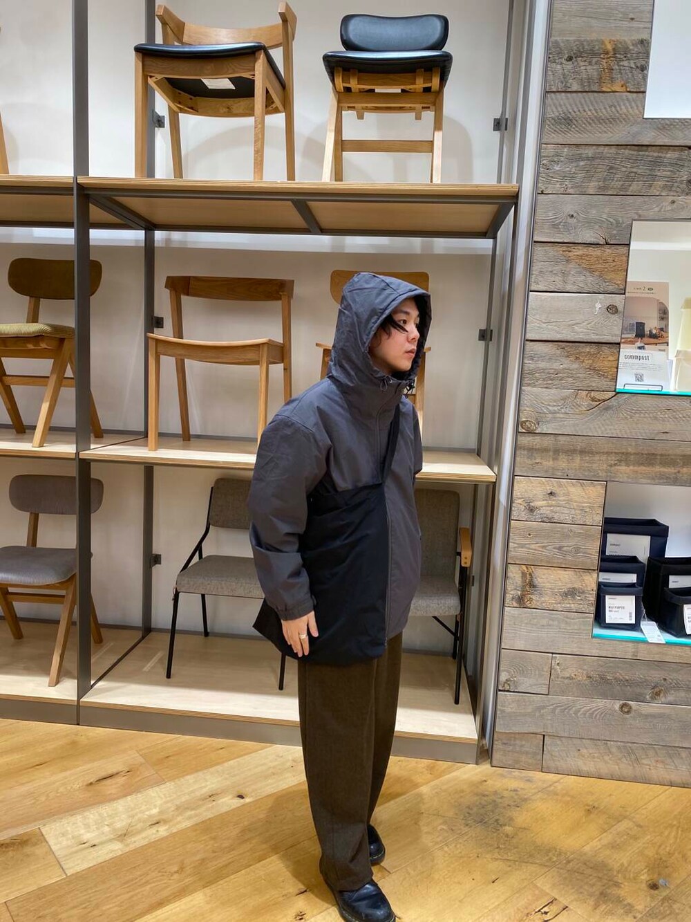撥水性能の付いたEKALのフードブルゾンを着ました。色味とシルエットがかっこいいです。フードもついててかわいいのでおすすめです。大人な雰囲気を感じるアウターです。ブラウンのウールパンツもシルエットがワイドで合わせやすいです。ブラックのショルダーはたくさん容量もあってガシガシ毎日使えそうです。