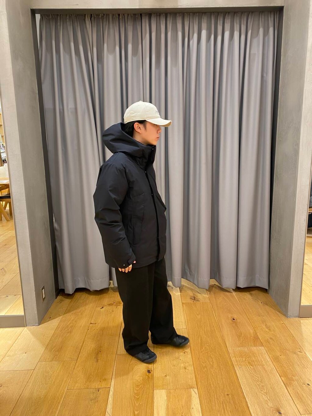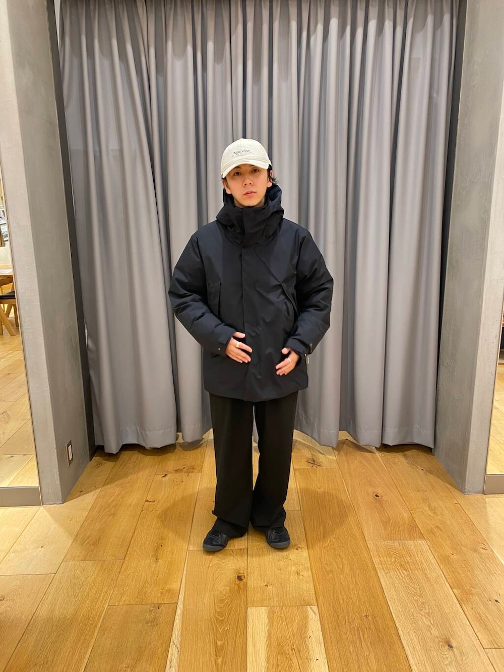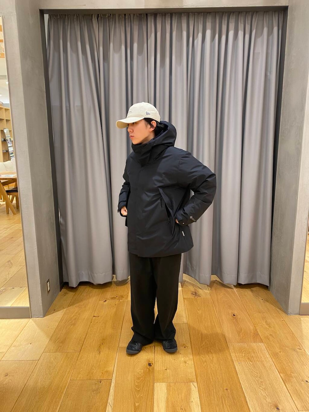 プラスフェニックスのダウンにニューエラのキャップを差し色で合わせました。ダウンかなり暖かく、デザインも最小限で非常に使いやすいです。ダウンとキャップはシティ感がでておしゃれですね。