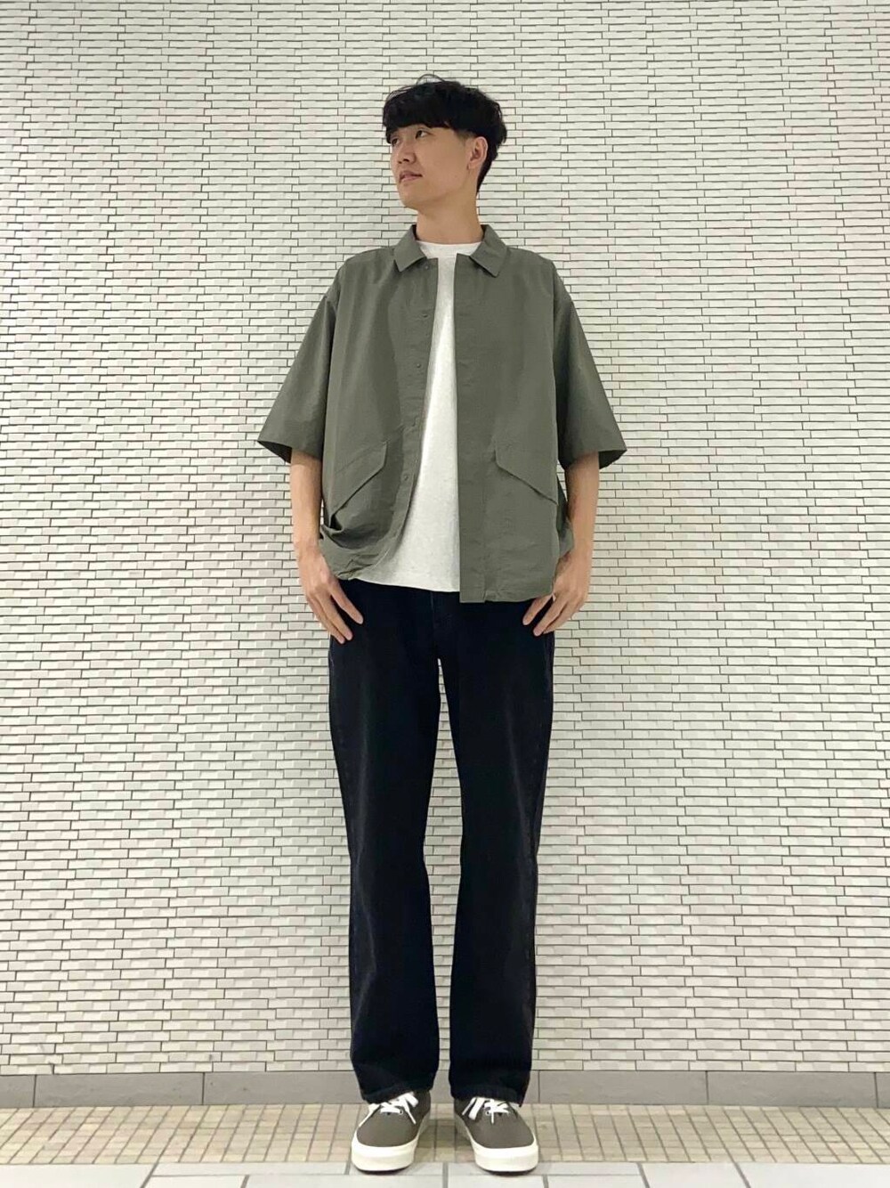 ブラックデニムで合わせたシャツのカジュアルコーディネートです。