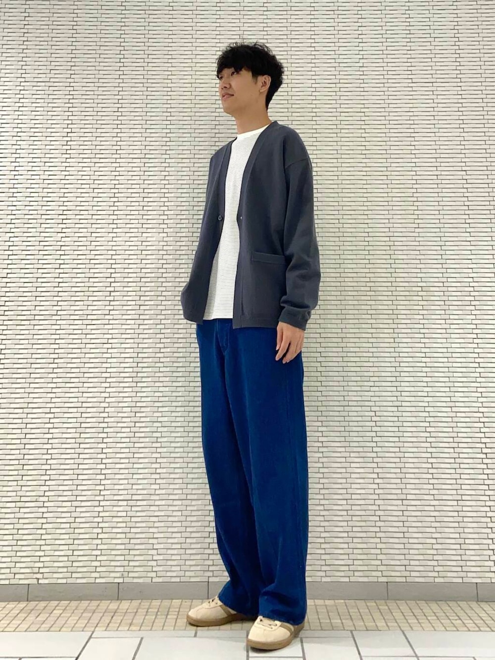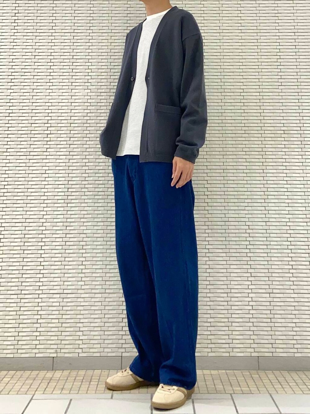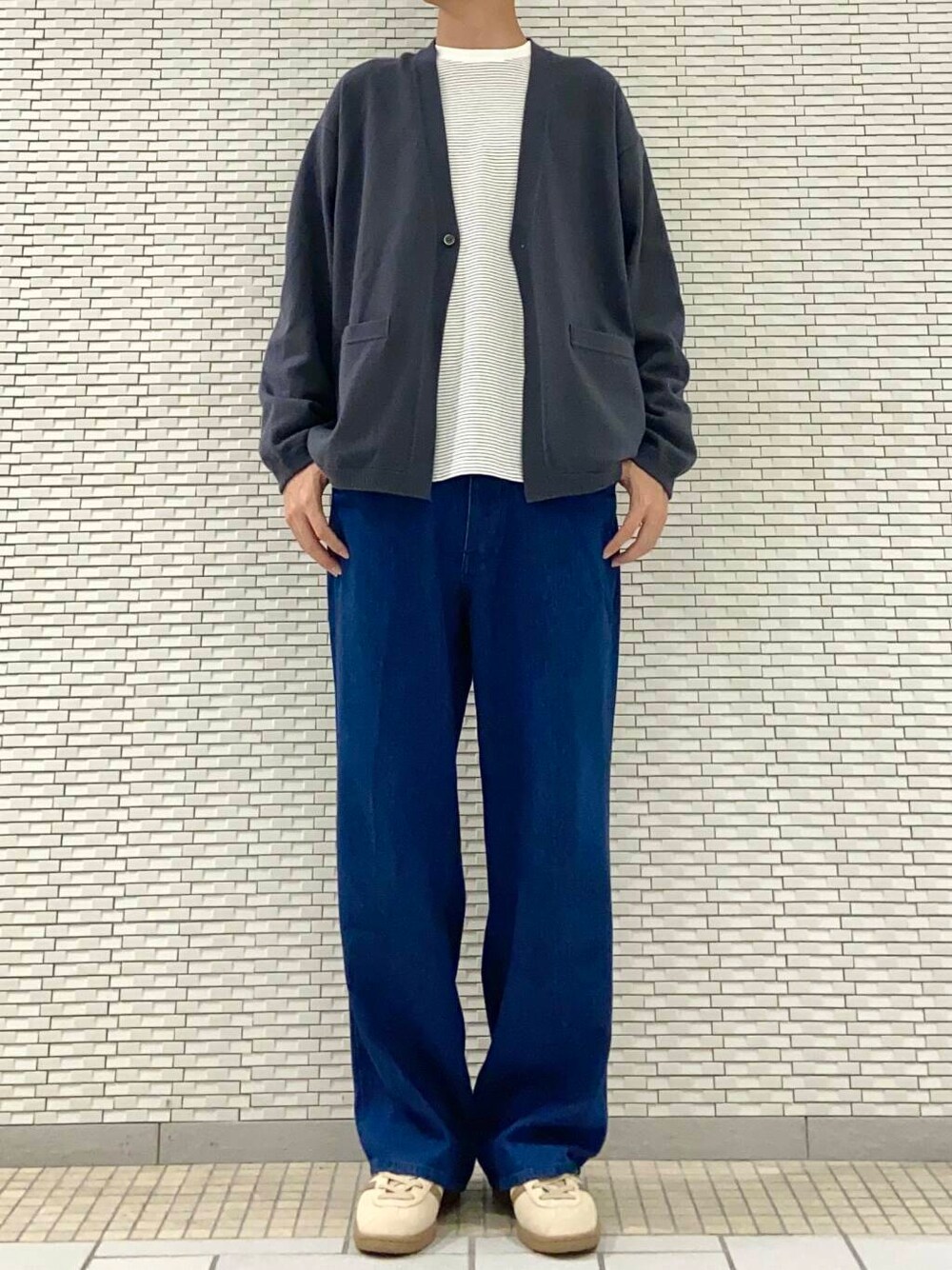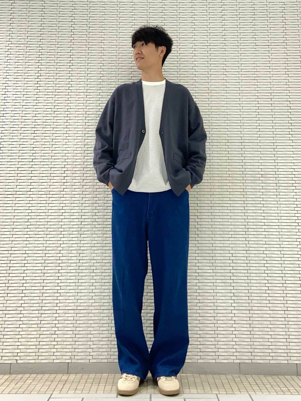 カーディガンを羽織ったゆったりカジュアルコーディネートです。