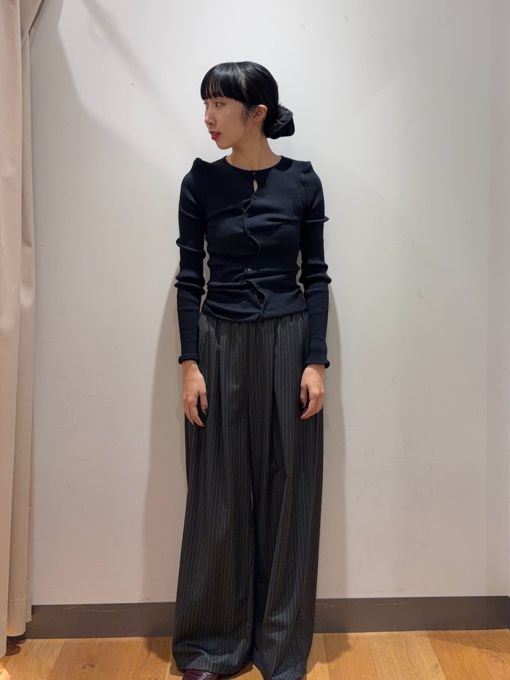 ボトムは程よい光沢とドレープがあり、動くたびに表情が変わるのが魅力。ワイドシルエットでも重くならず、シンプルながら存在感のあるスタイリングに仕上がります。
