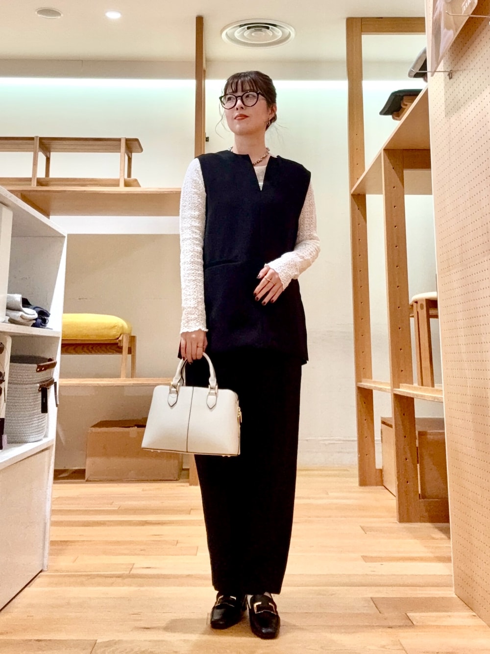 長袖は暑くてまだ着たくない日は、秋を感じるニットベストやデニムのカラー、バッグの色で秋感を出すのがおすすめです。ニットベストは毛足が長めなのでボリュームが出過ぎずに着られます。前後2wayなので気分で着方を楽しめるおすすめアイテムです!