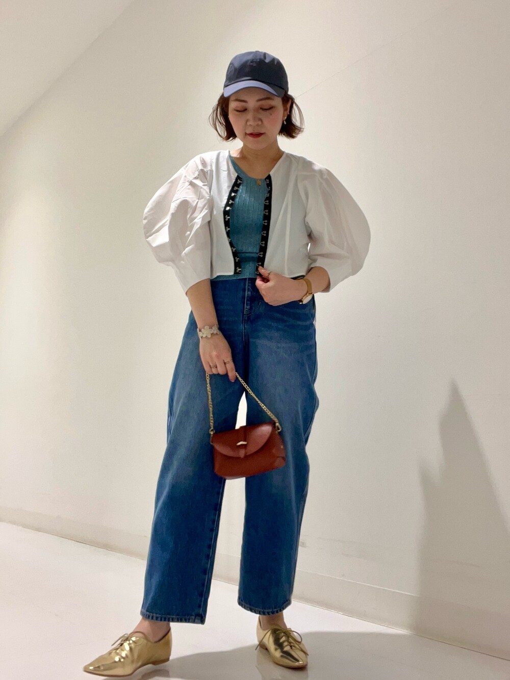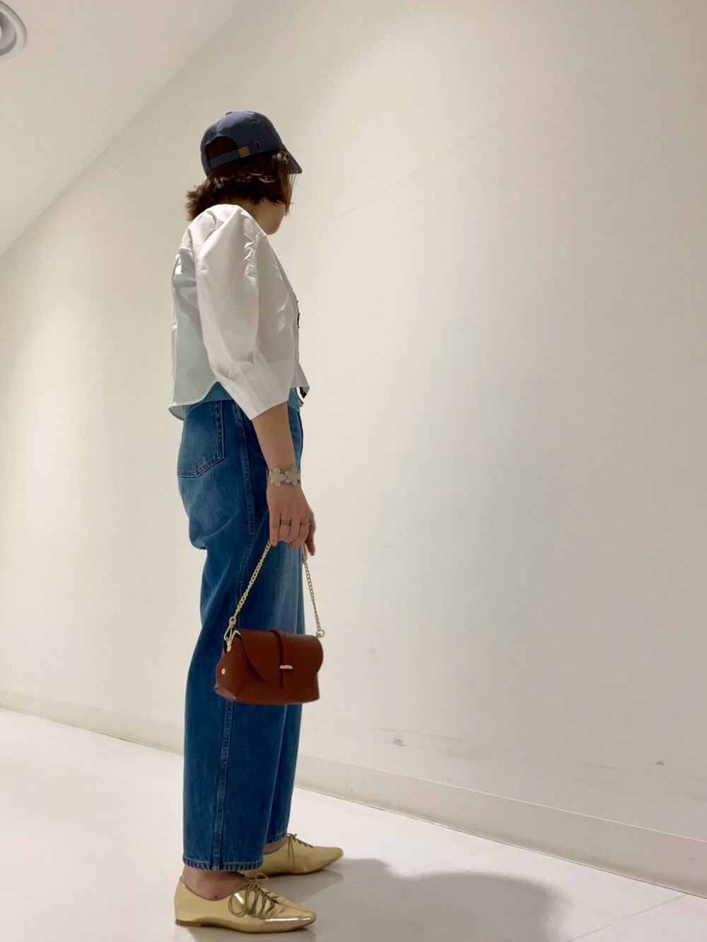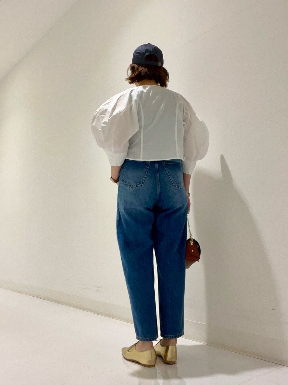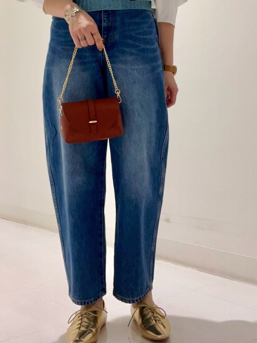コクーンデニムはスッキリ着用ができ、ゴールドのシューズを合わせ晩夏スタイル✨