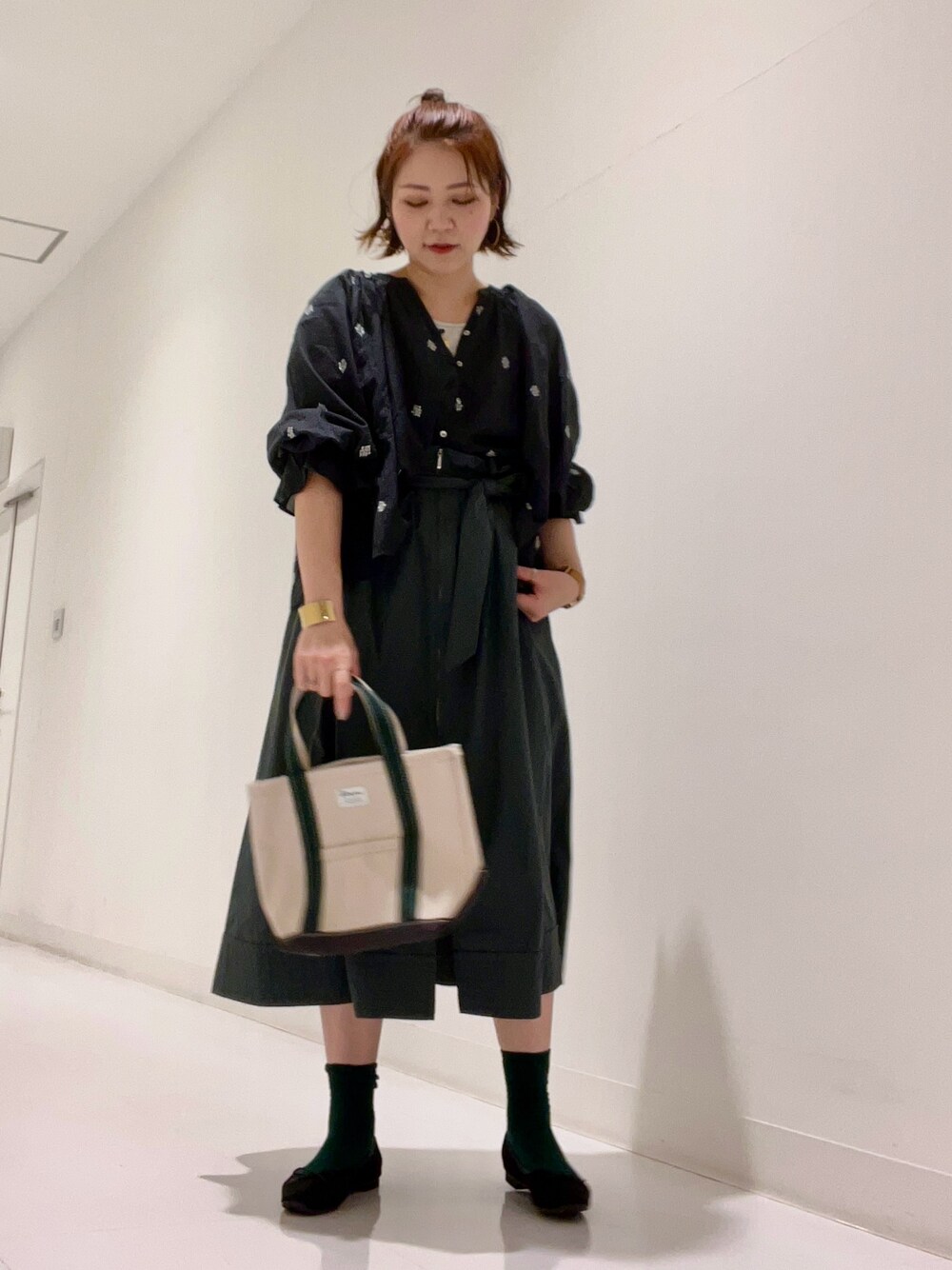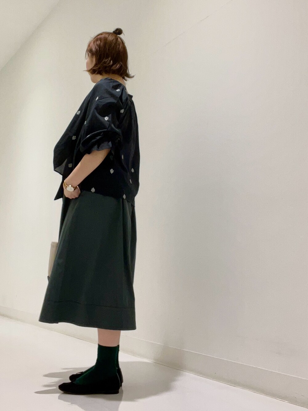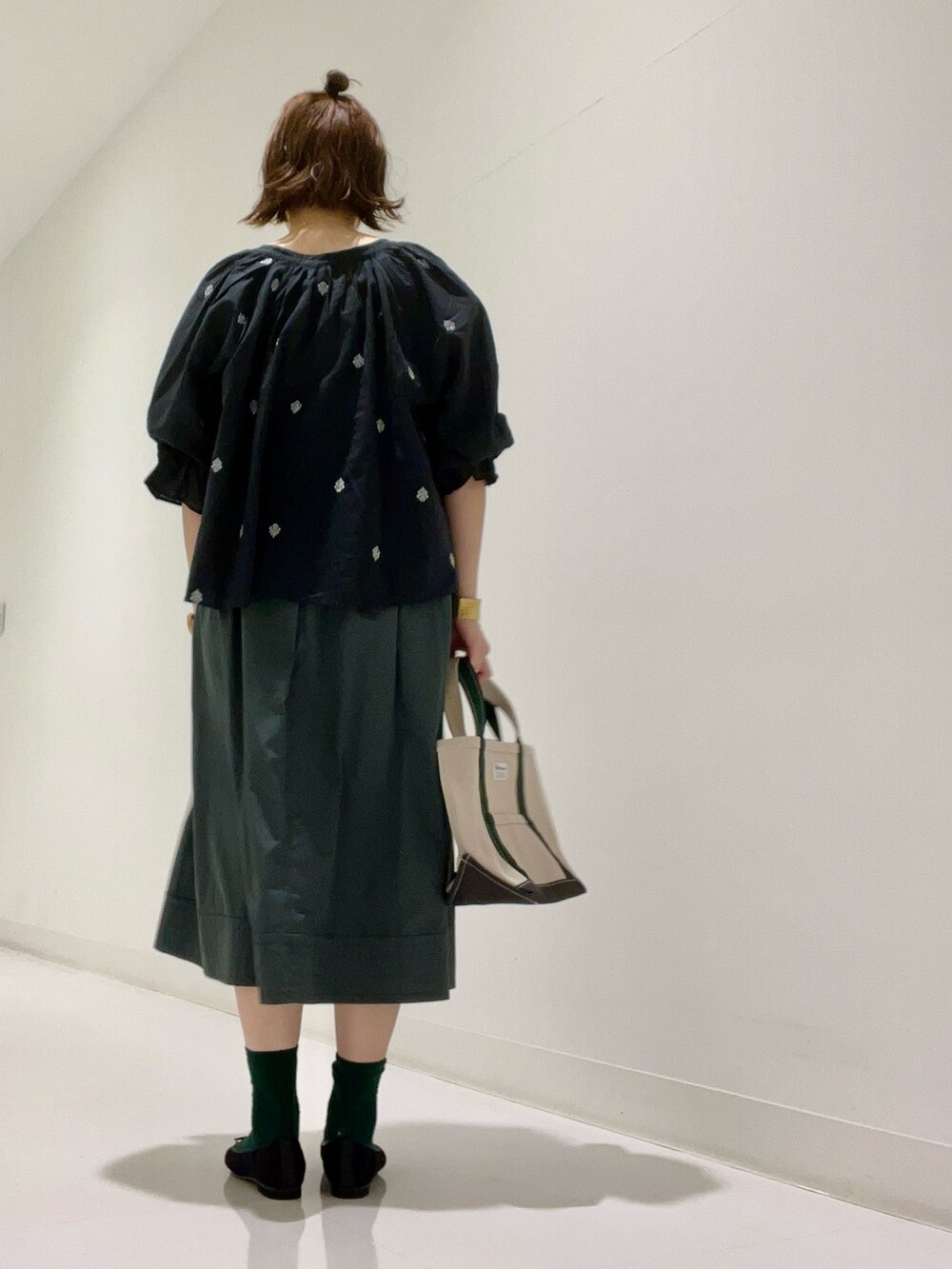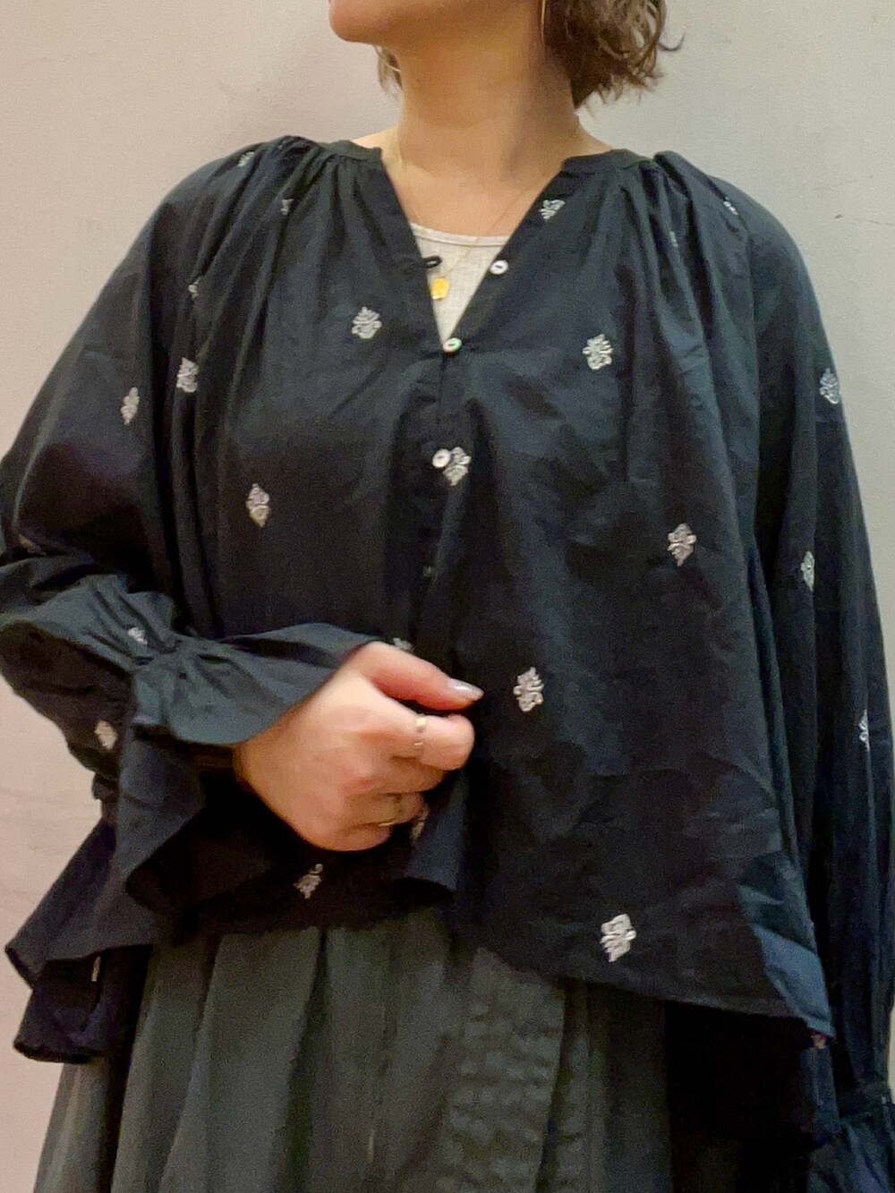 刺繍のブラウスは前ボタンなので部分的にあけ軽やかな印象に◉