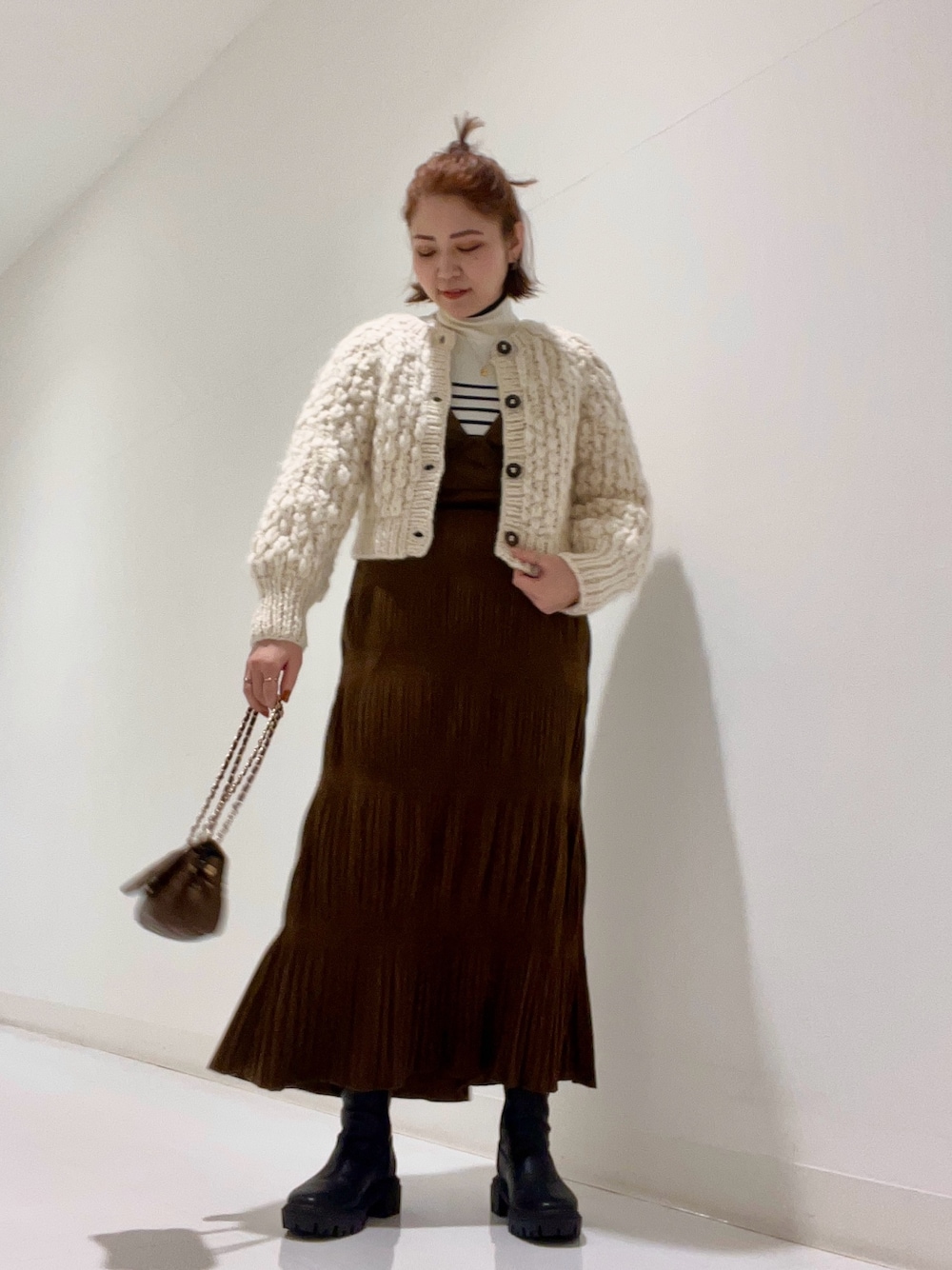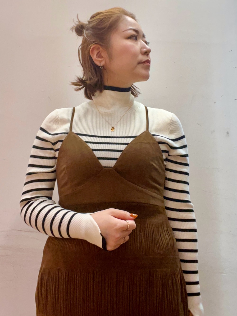ワンピースには、ストライプのニットを合わせポイントに✨