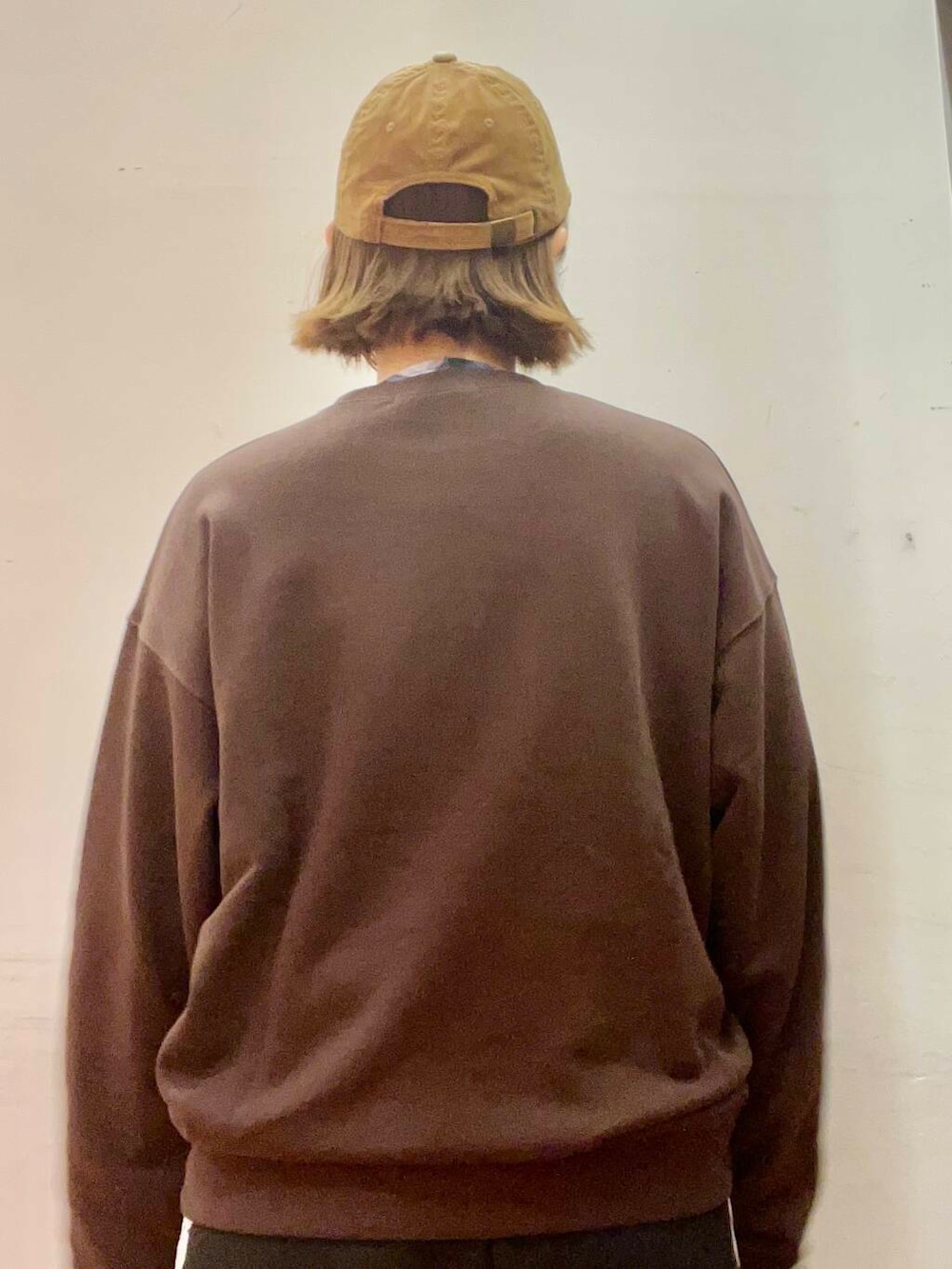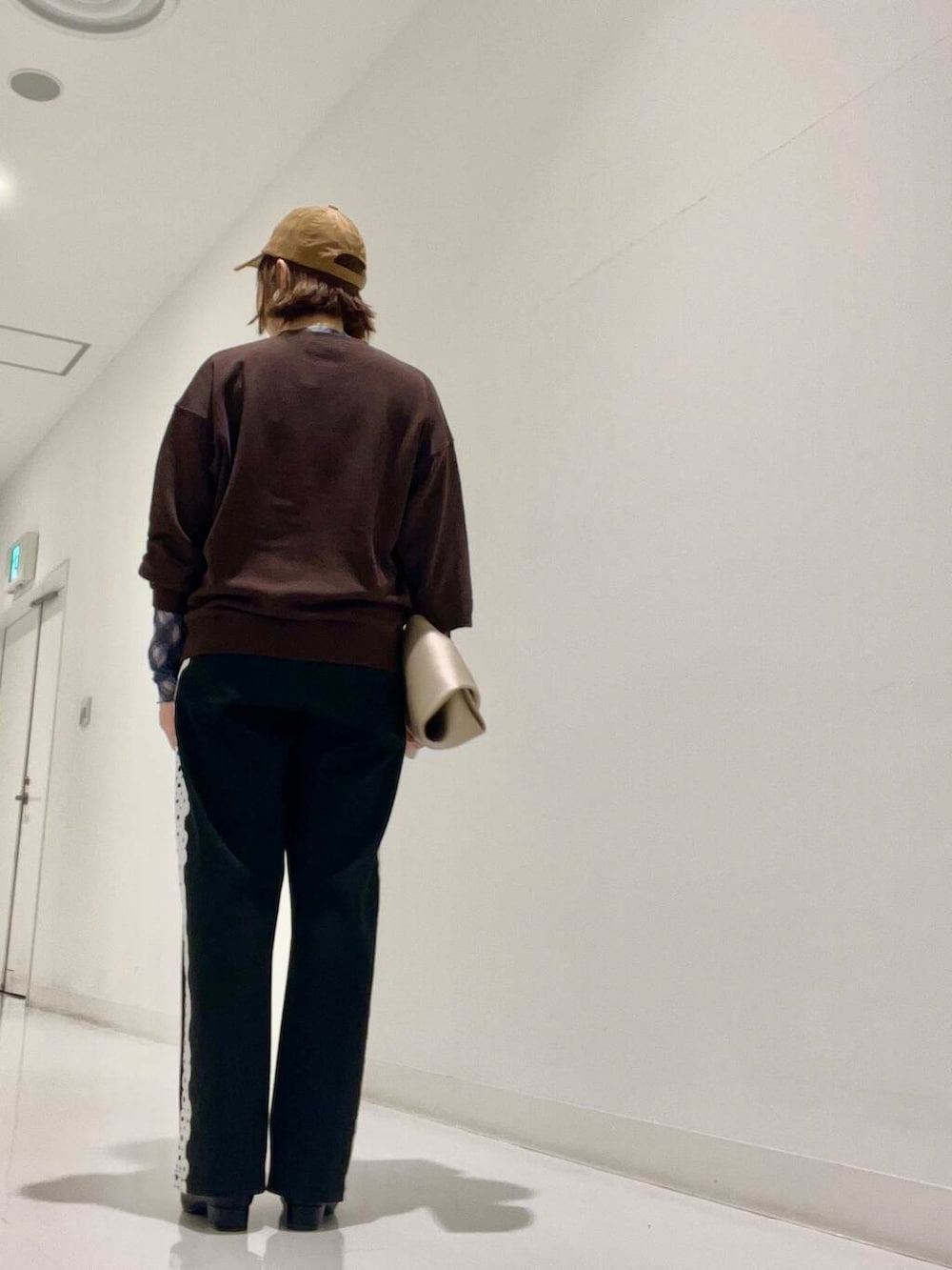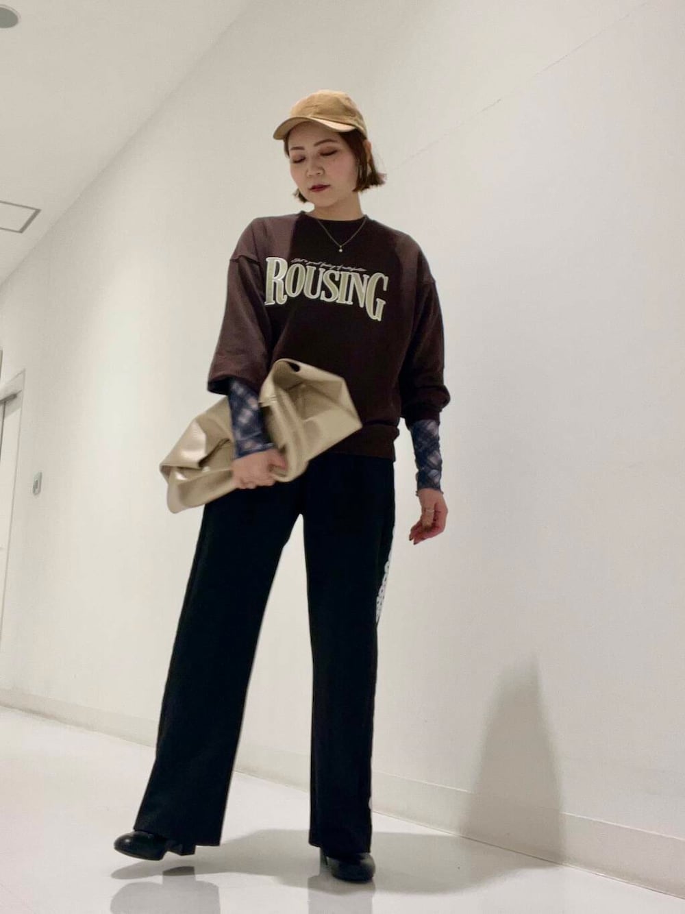 ブラウンのスウェットにはチェックのシアーアイテムをレイヤードしポイントとして◉