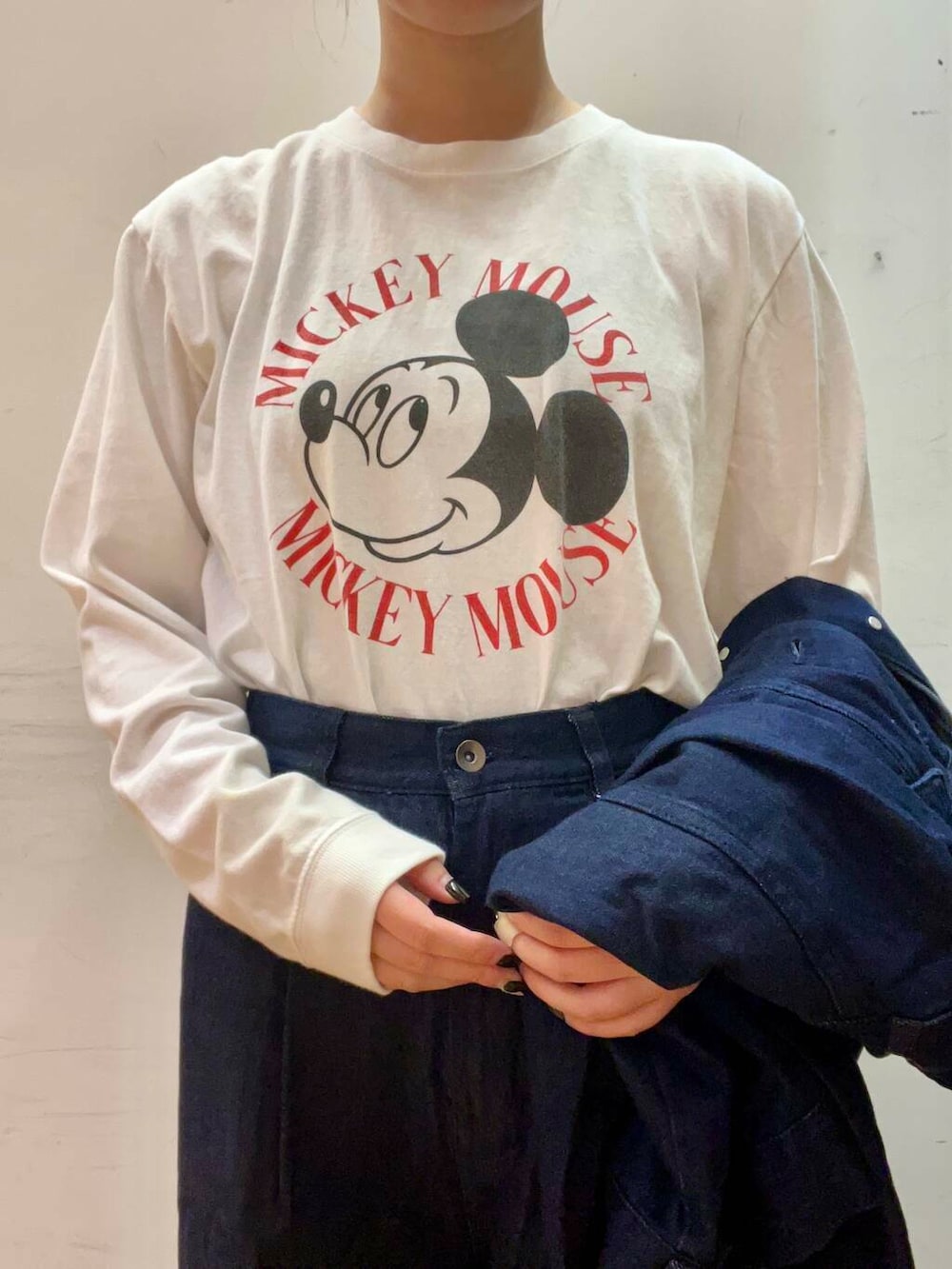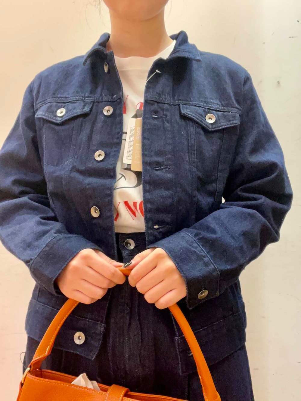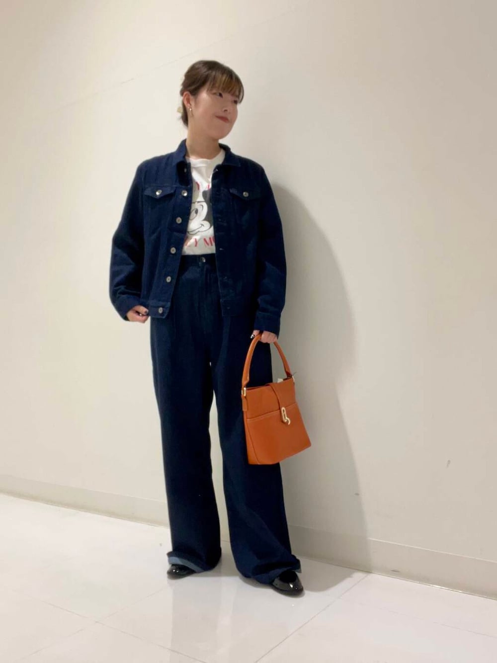 上下無地デニムなので、中に着るTシャツはプリントTシャツでポイントに♩