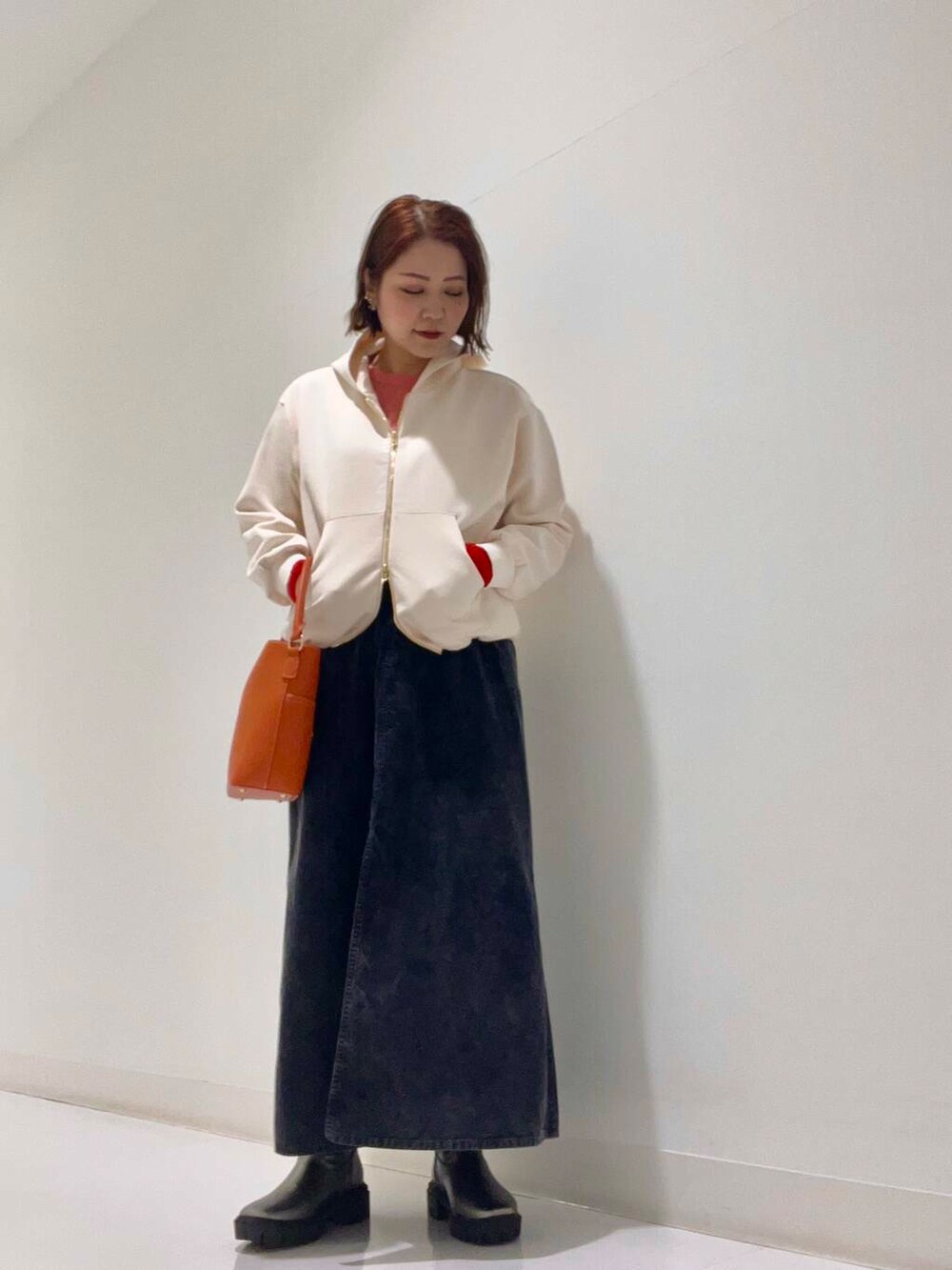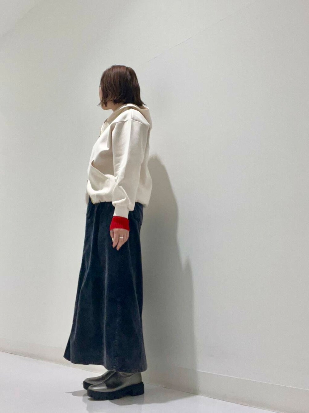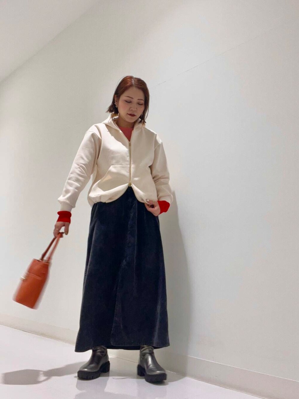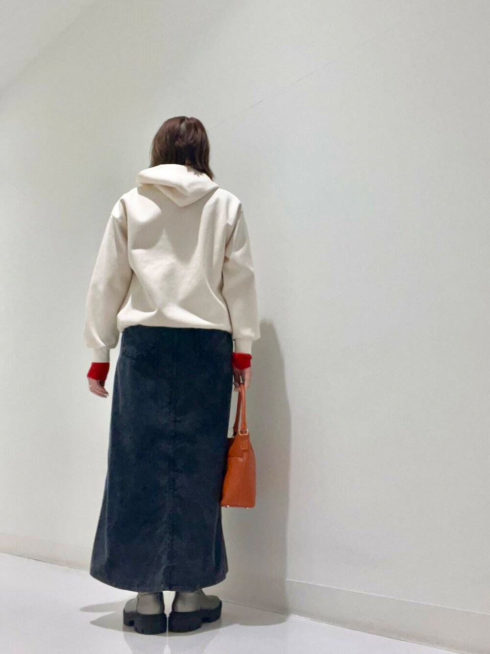 コーデュロイスカートは長さがありスリット深めで今年らしくシューズも映えます◉