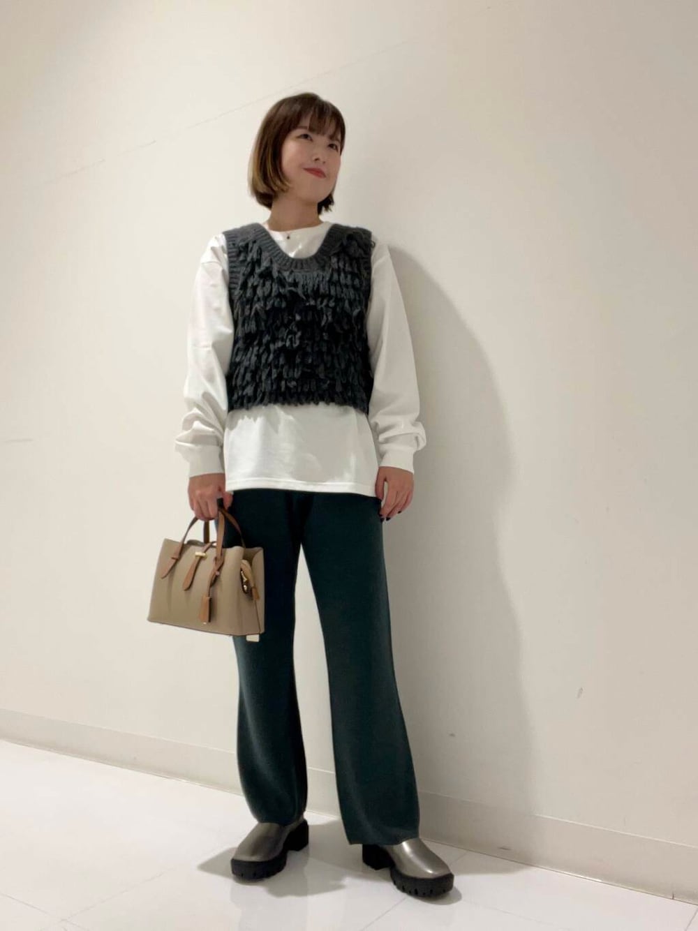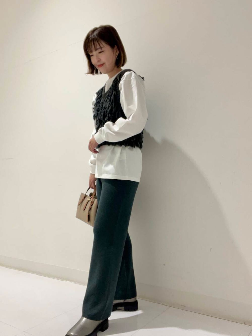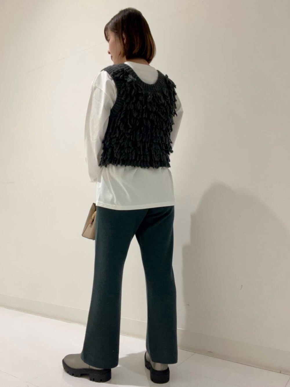 ベストはフリーサイズで、少しピッタリ目なので薄めのロンTやニットと合わせるのがおすすめです◎