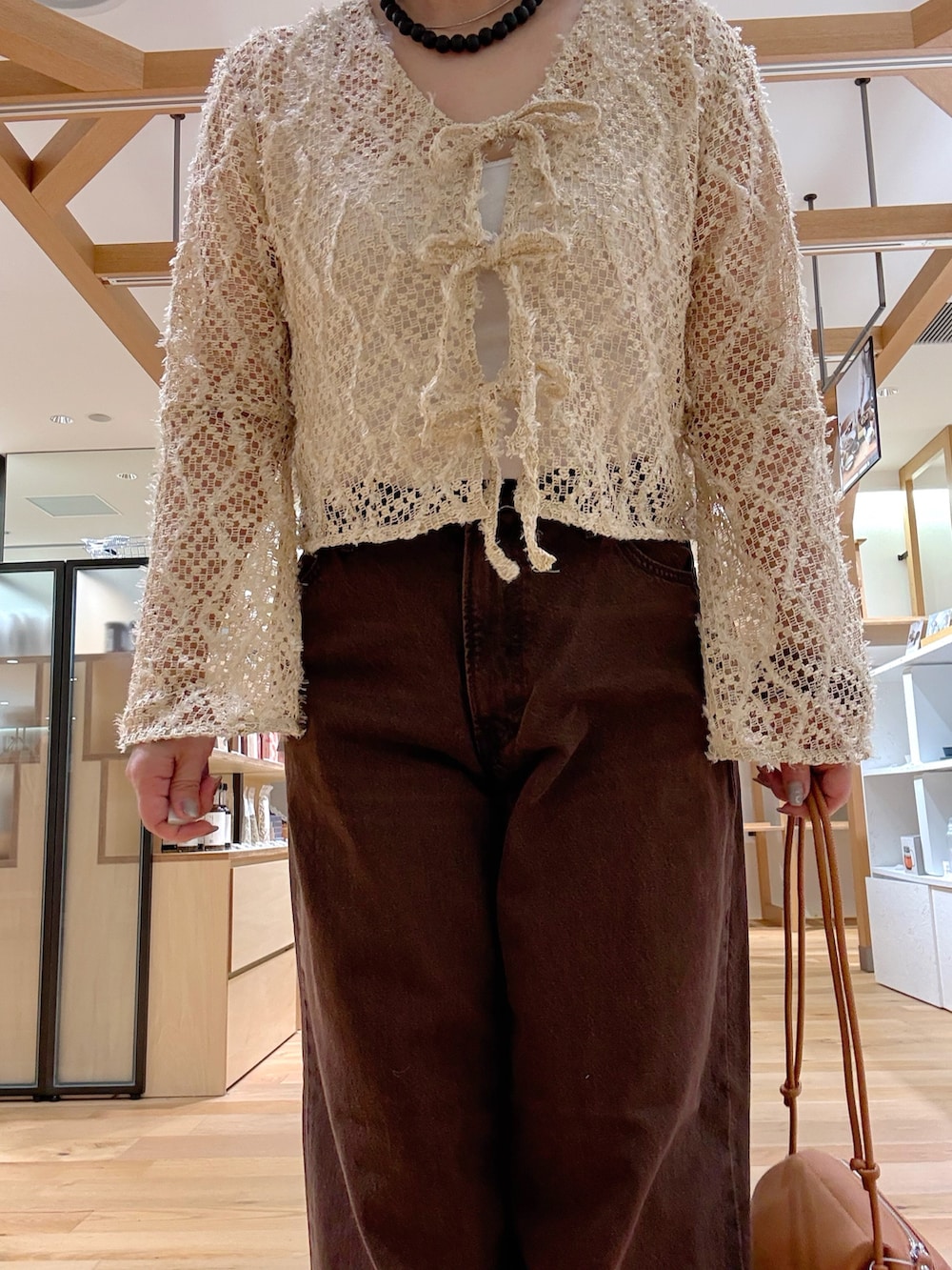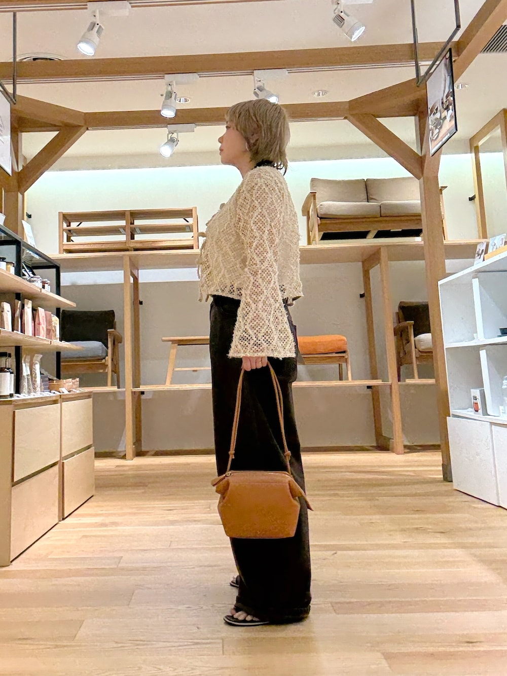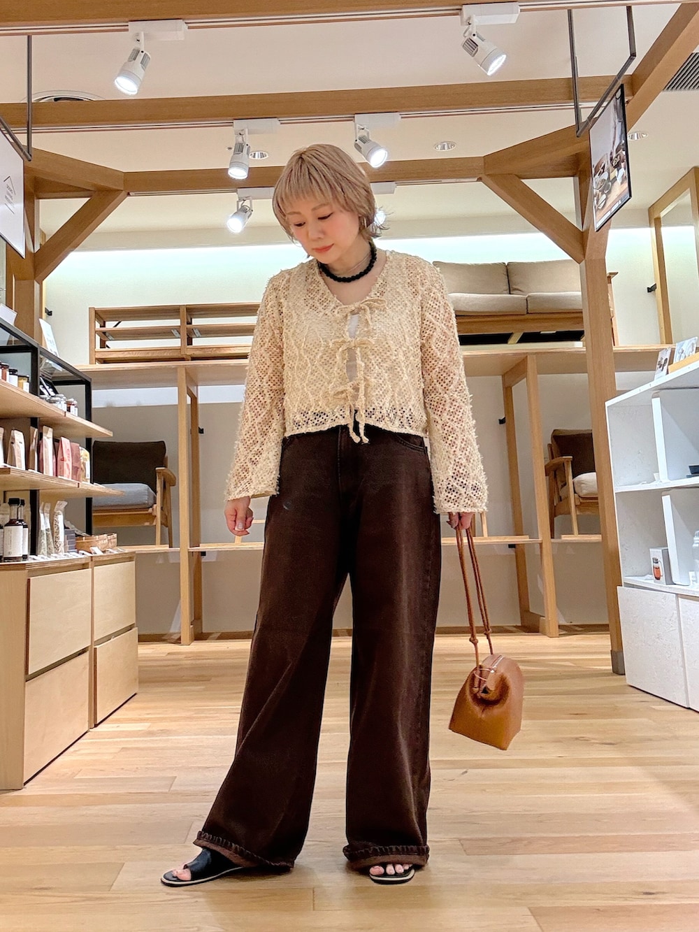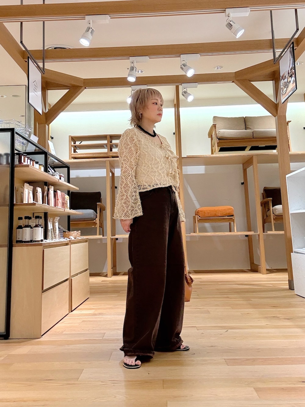 チョコレートみたいなカラーのパンツです!リアルバイしたアイテムでお気に入りです!トップスは袖がフレアになっていて腕がキレイに見えます。暑さの残る秋の季節にちょうど良いです。