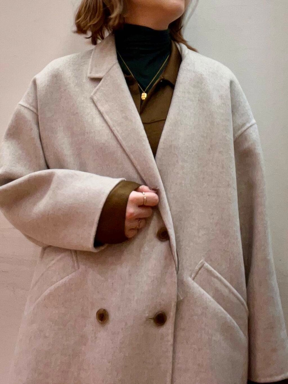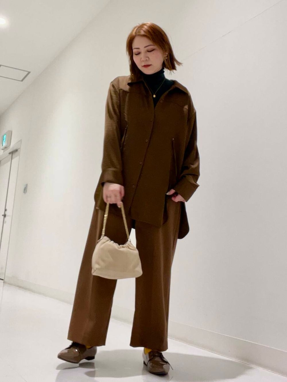 シャツはサテン地で大人仕様に様になり、中にニットを合わせ暖かく◉