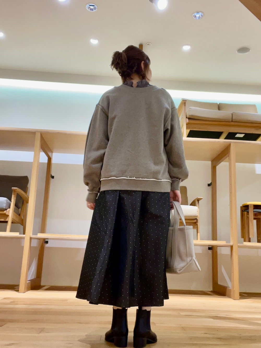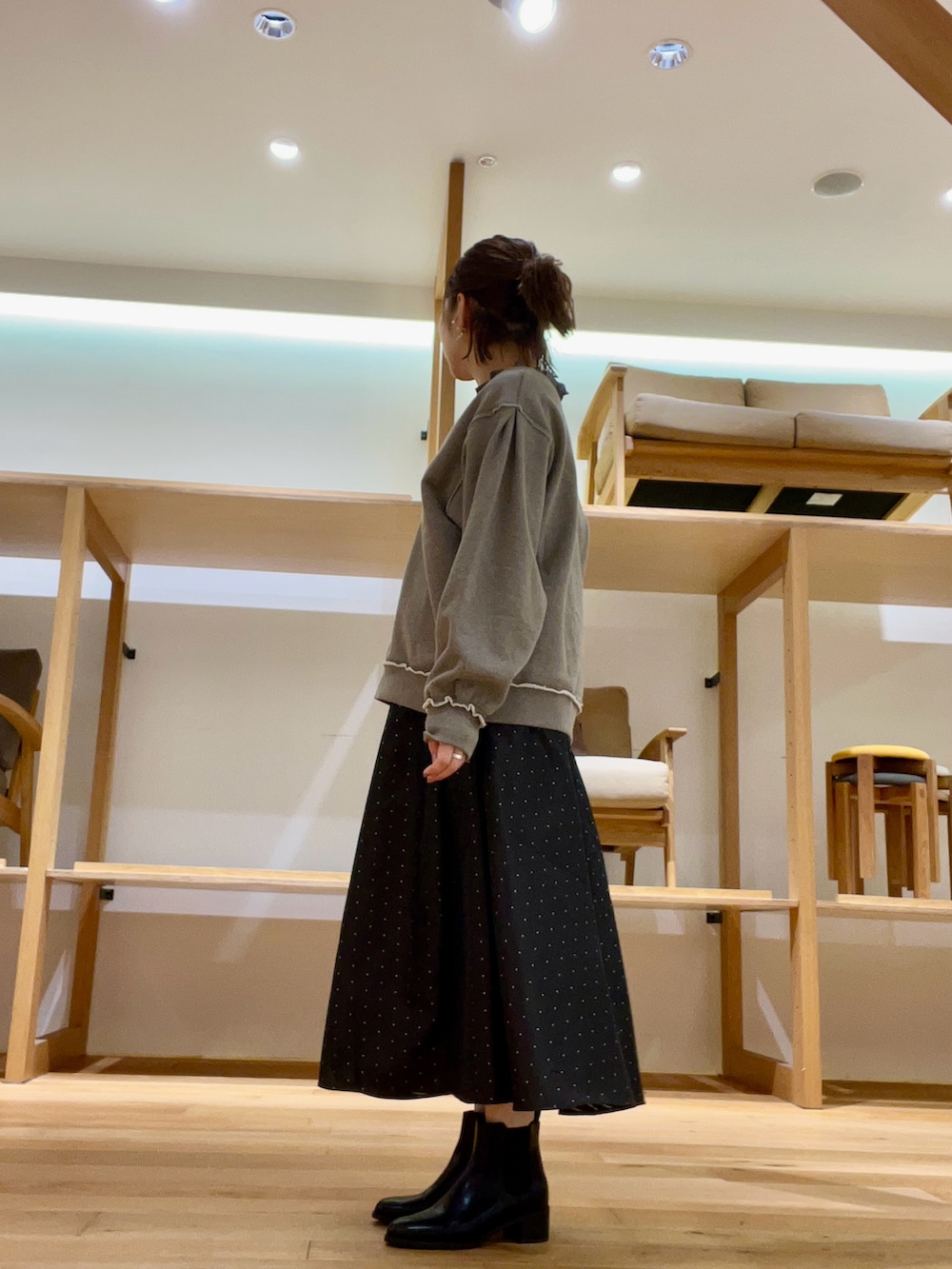 スカートはクラシカルなボリューミースカートでドットがコーディネートのポイントになります◉