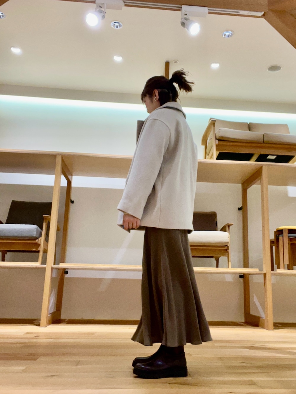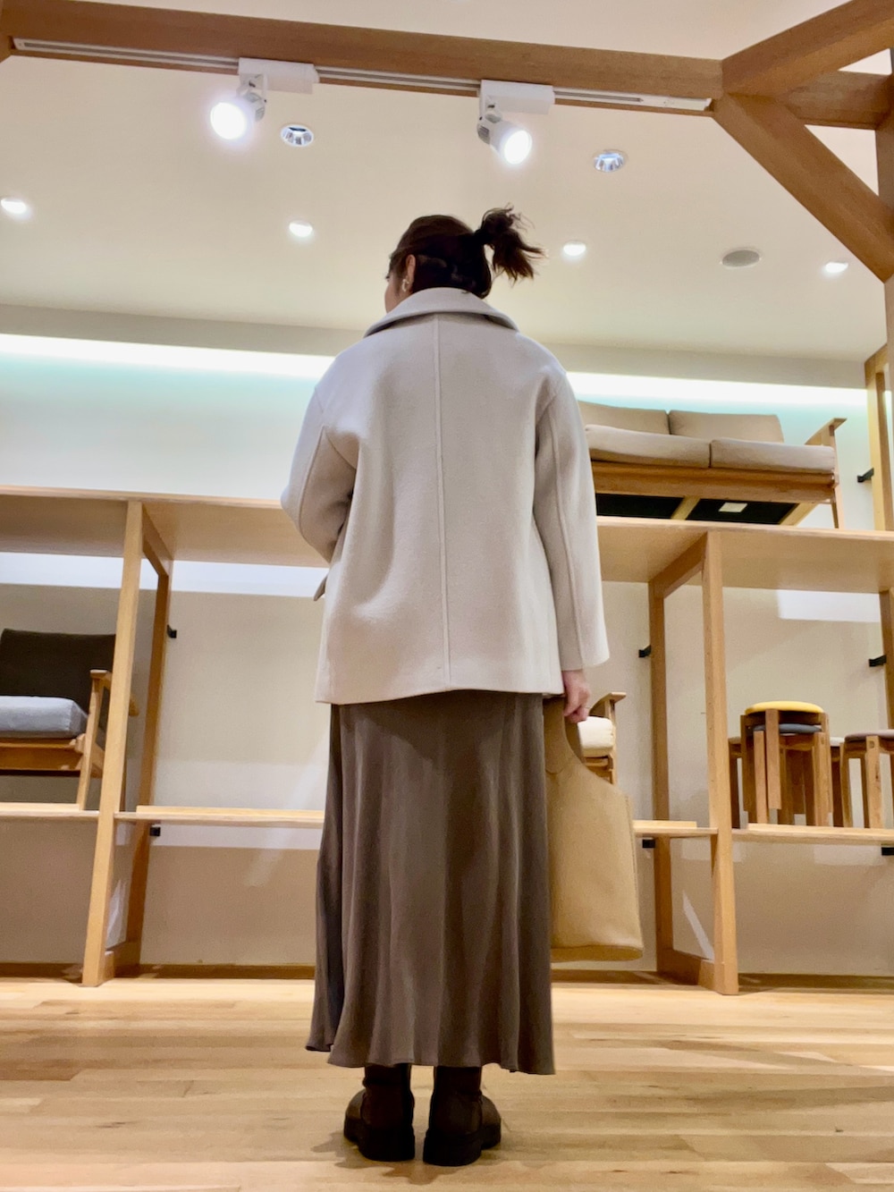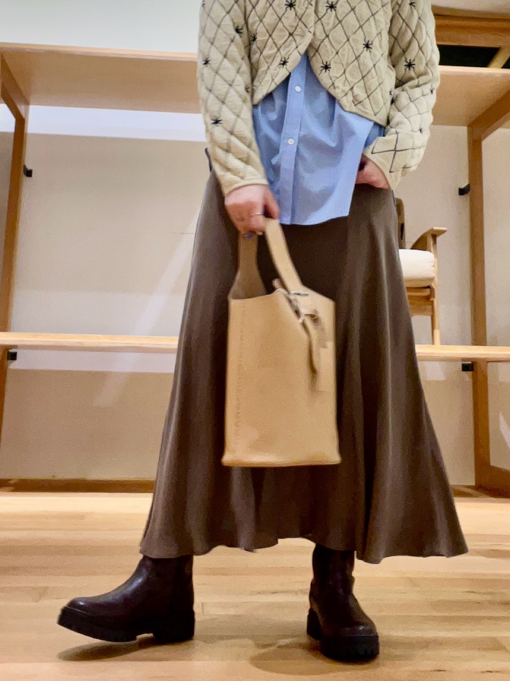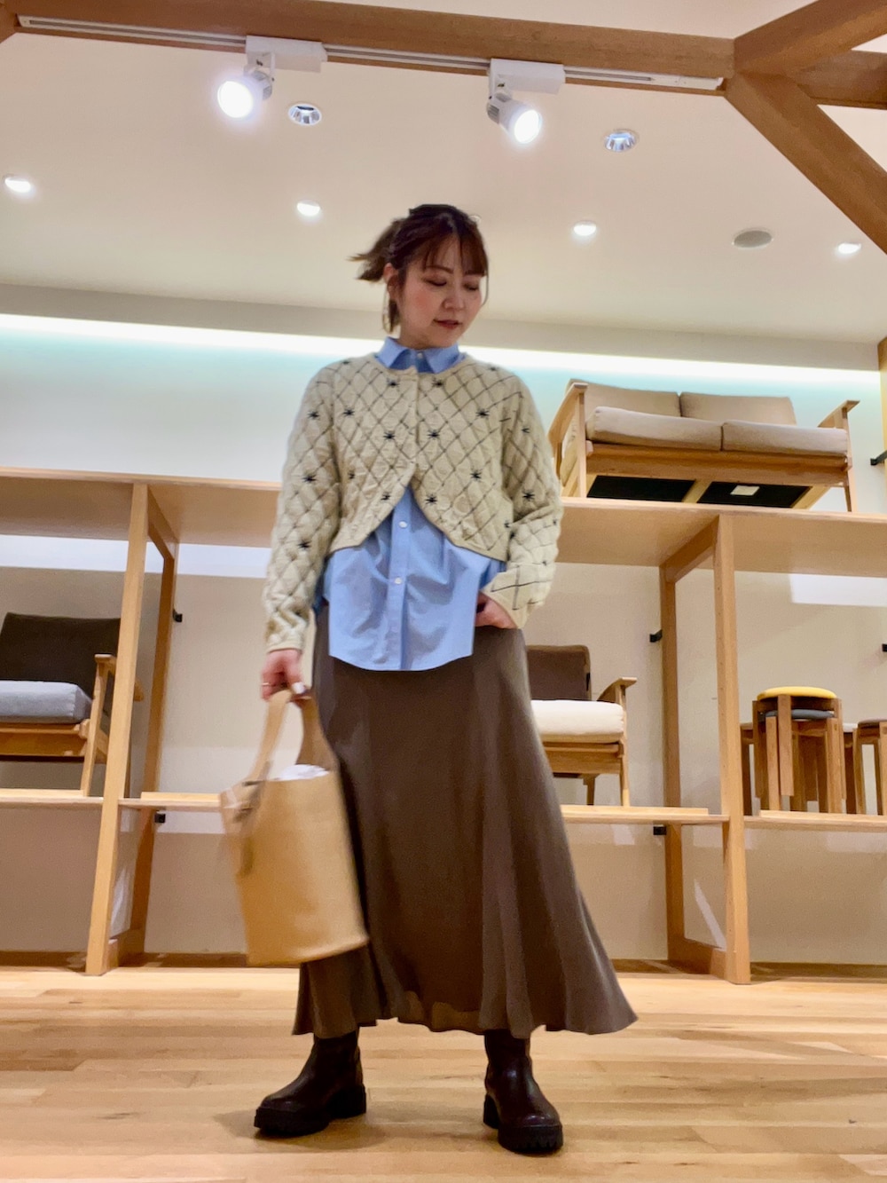 中物はキルティングカーディガンにシャツを合わせIラインなシルエットで着用しました‼︎