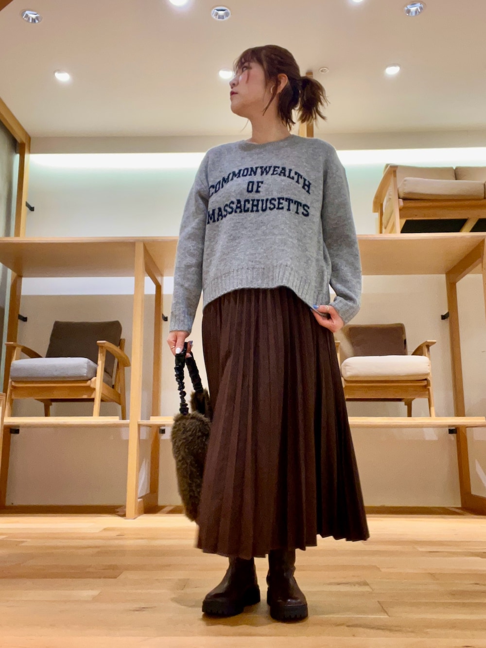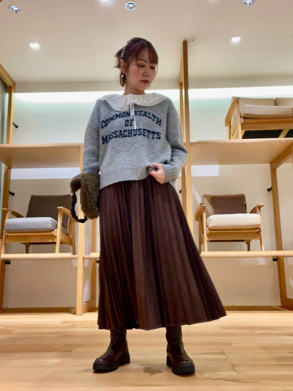 スエード調のスカートを合わせレディな装いに‼︎季節感がぐっとでて、スカートは絶妙な長さでブーツも映えます◉