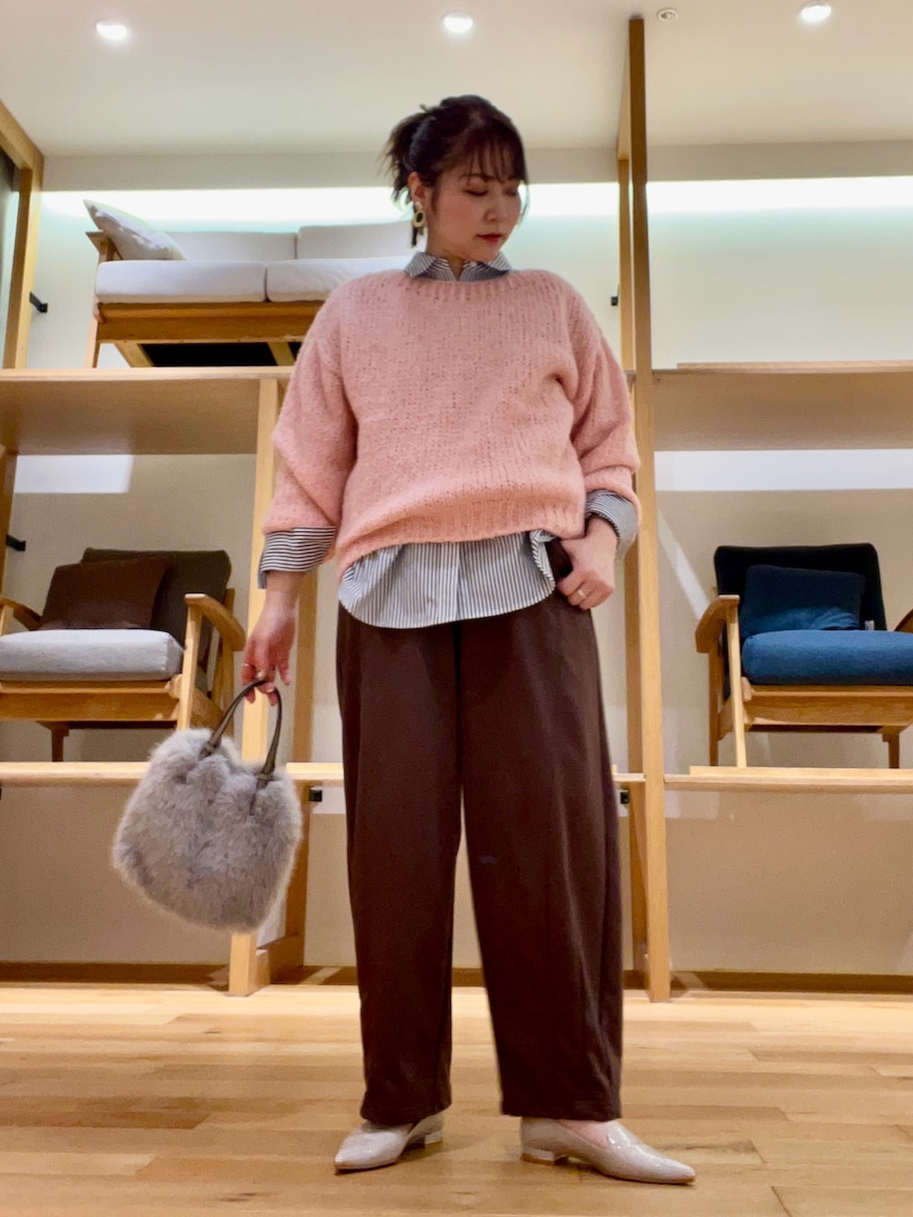 ピンクカラーニットは、シャツと合わせラフな装いに‼︎サイズ感も着やすくスウェットと合わせ旬な装いに‼︎