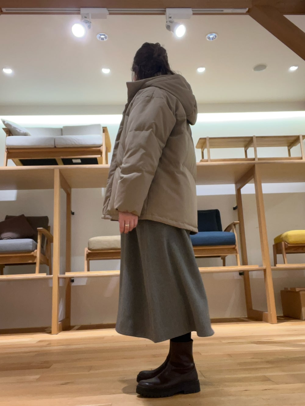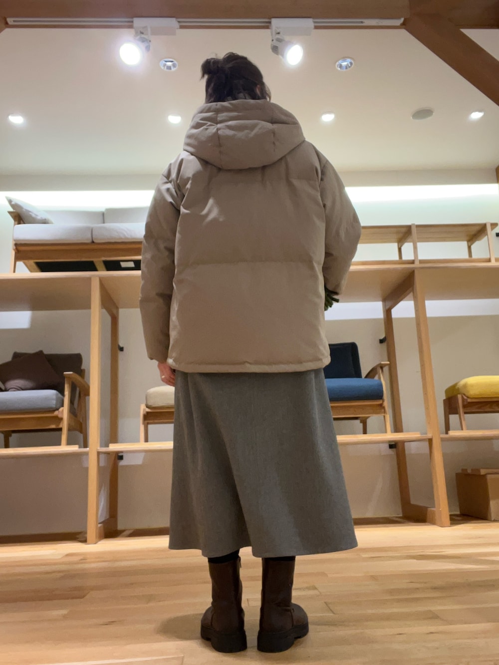 ダウンジャケットは、Back部分がやや長めでヒップ周りまで暖かく、前はスッキリ着用が出来る着丈でバランスが取れやすいです‼︎