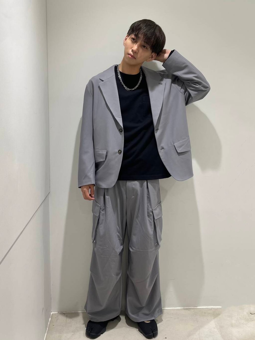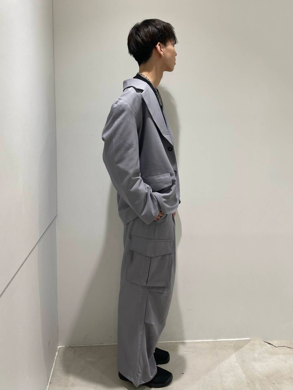 ワイドなジャケットにワイドなカーゴパンツの