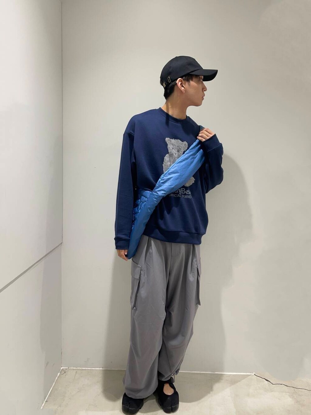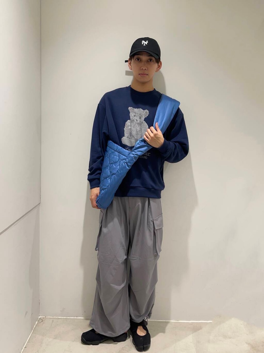 ゆったりスウェットとワイドカーゴのバランスが良く、さらに大きめなバッグを入れることで一気に統一感が出ます。