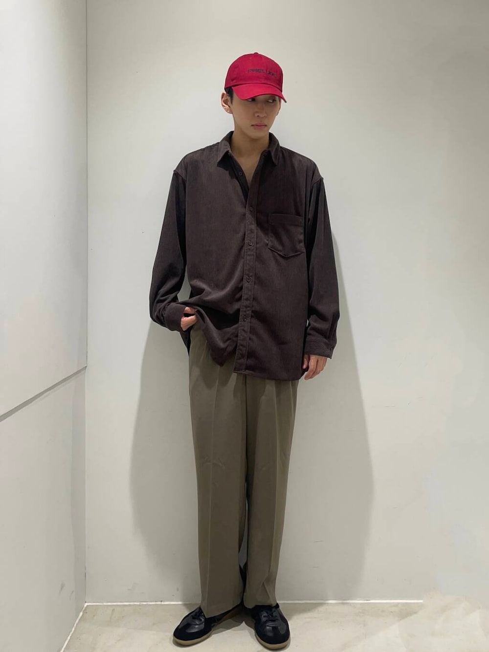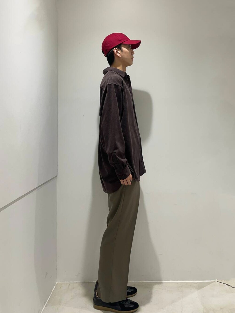 少し大人っぽくブラウンにカーキのパンツを合わせ落ち着いた色味のコーディネートに赤のキャップがいいアクセントに👍