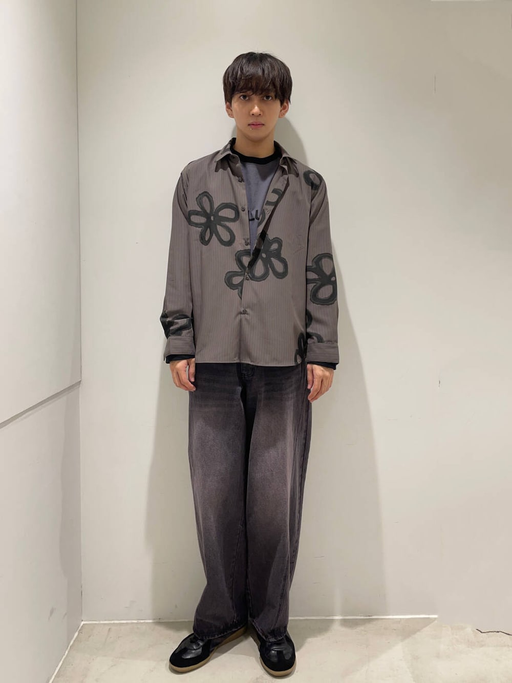 柄のあるシャツでも落ち着いた色味でシンプルに✨