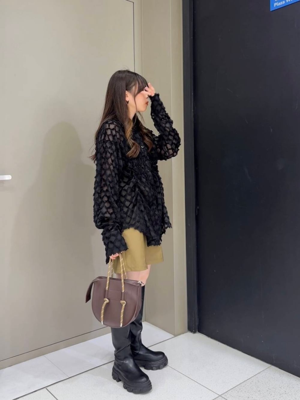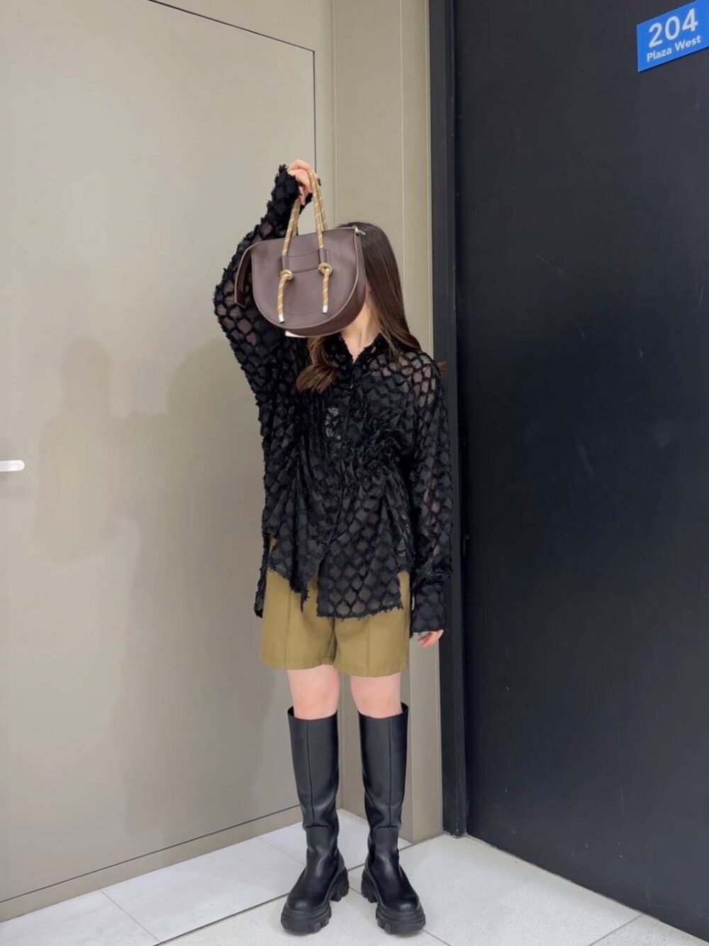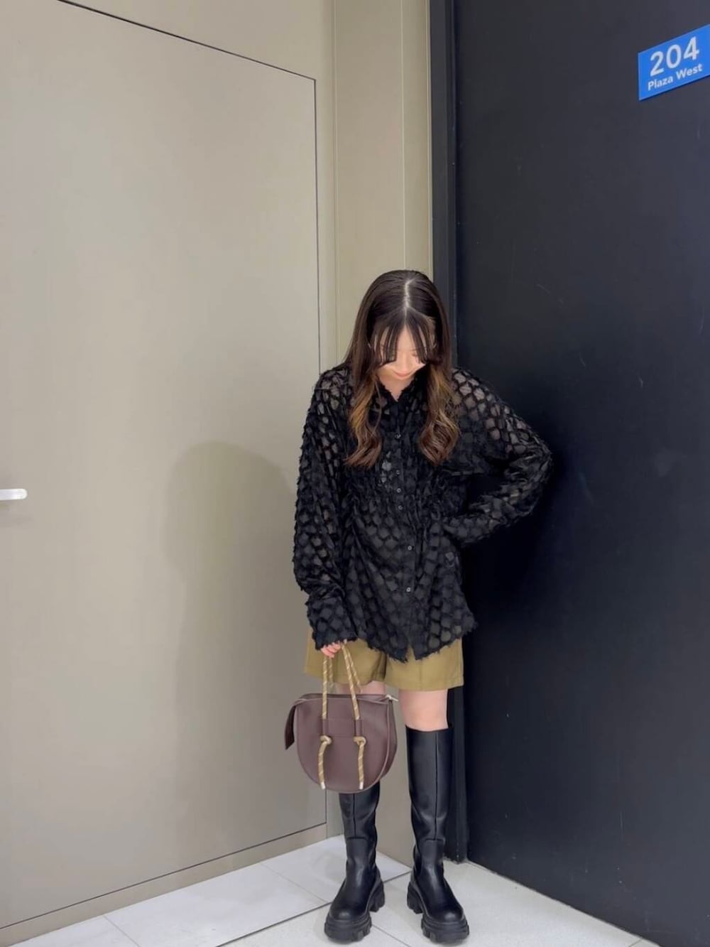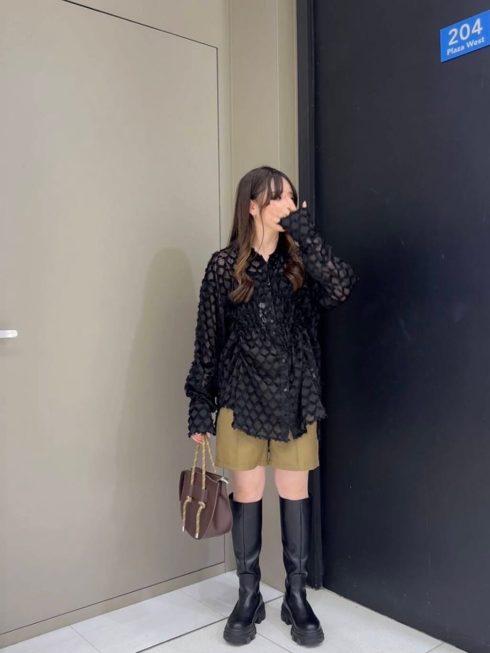 シアー感のあるブラックのフリンジシャツにブラウンのショートパンツをあわせることで重たくなりすぎないようにしています🎶