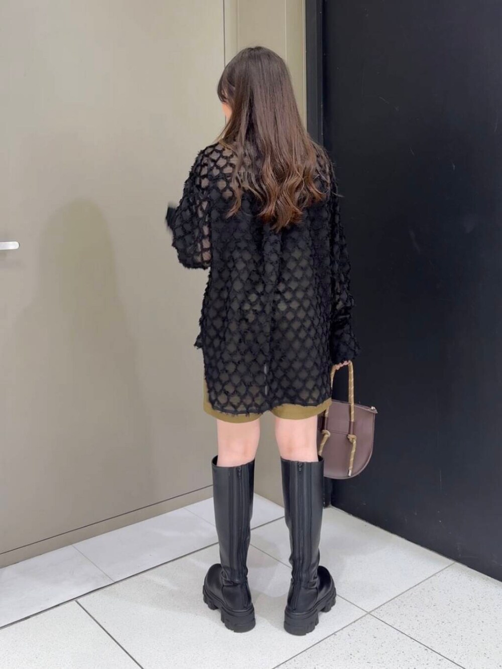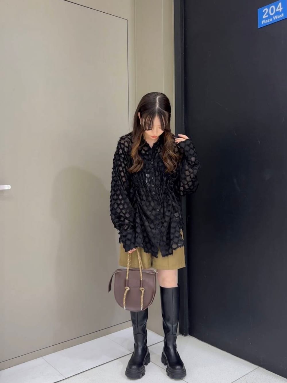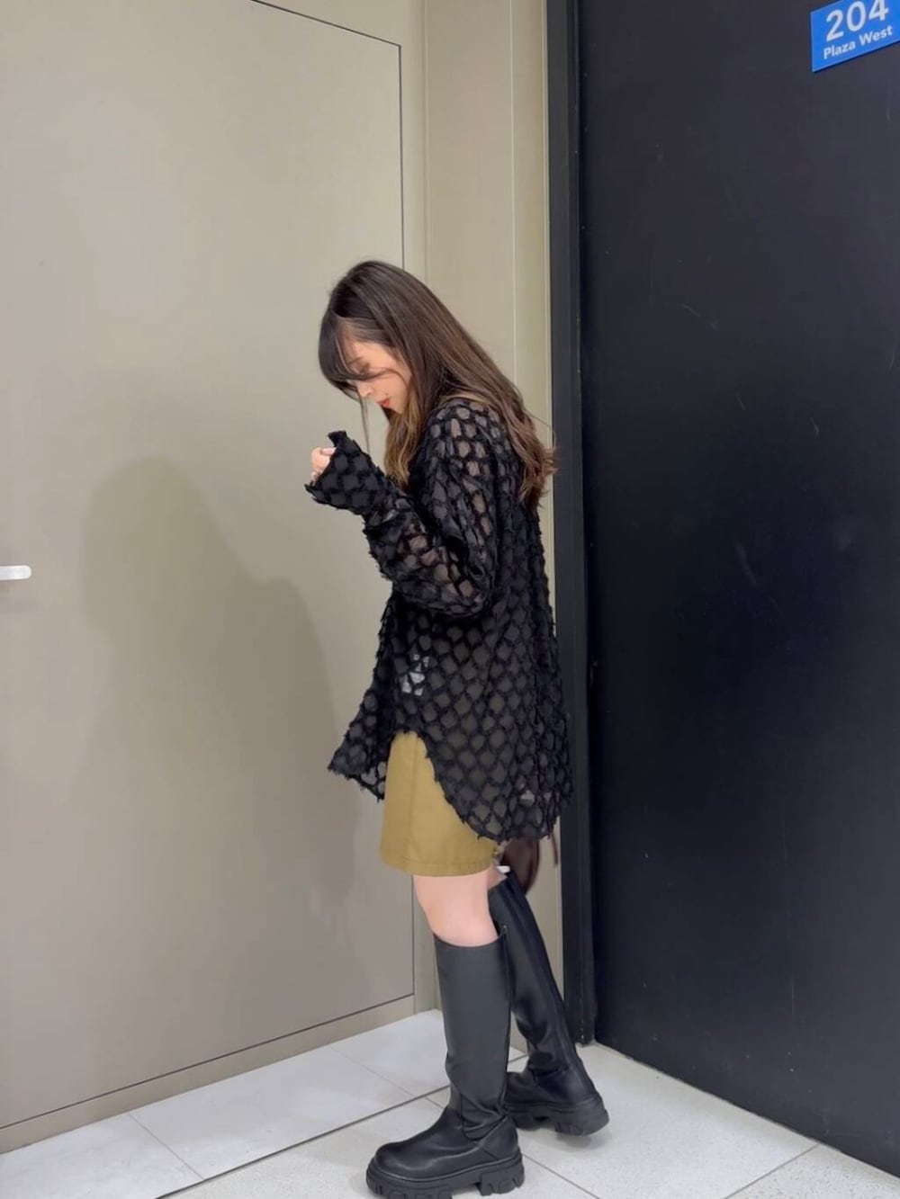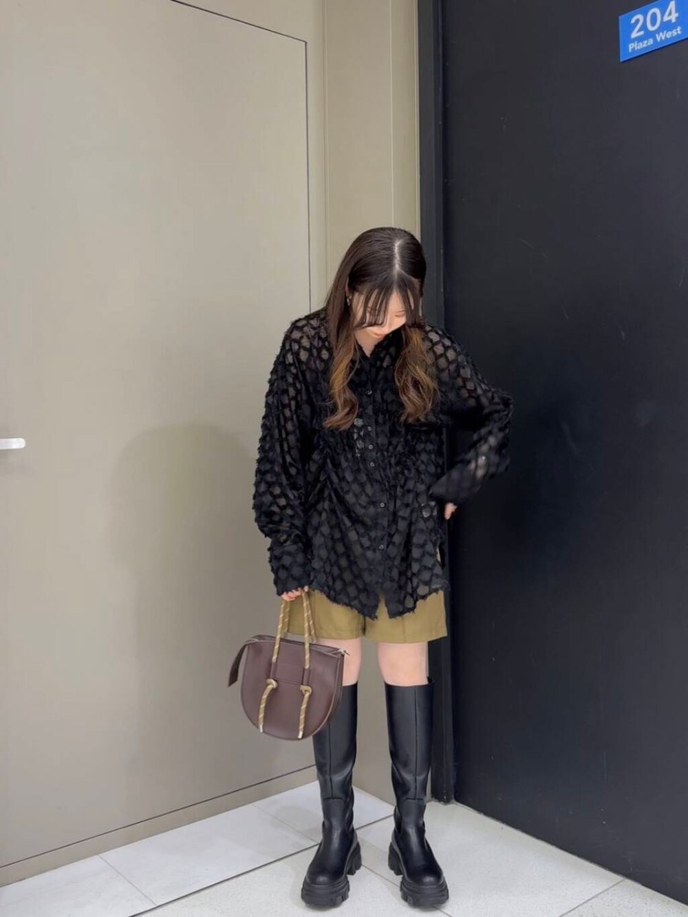 シアー感のあるブラックのフリンジシャツにブラウンのショートパンツをあわせることで重たくなりすぎないようにしています🎶